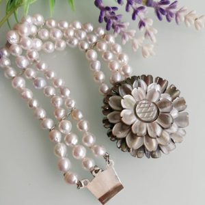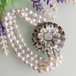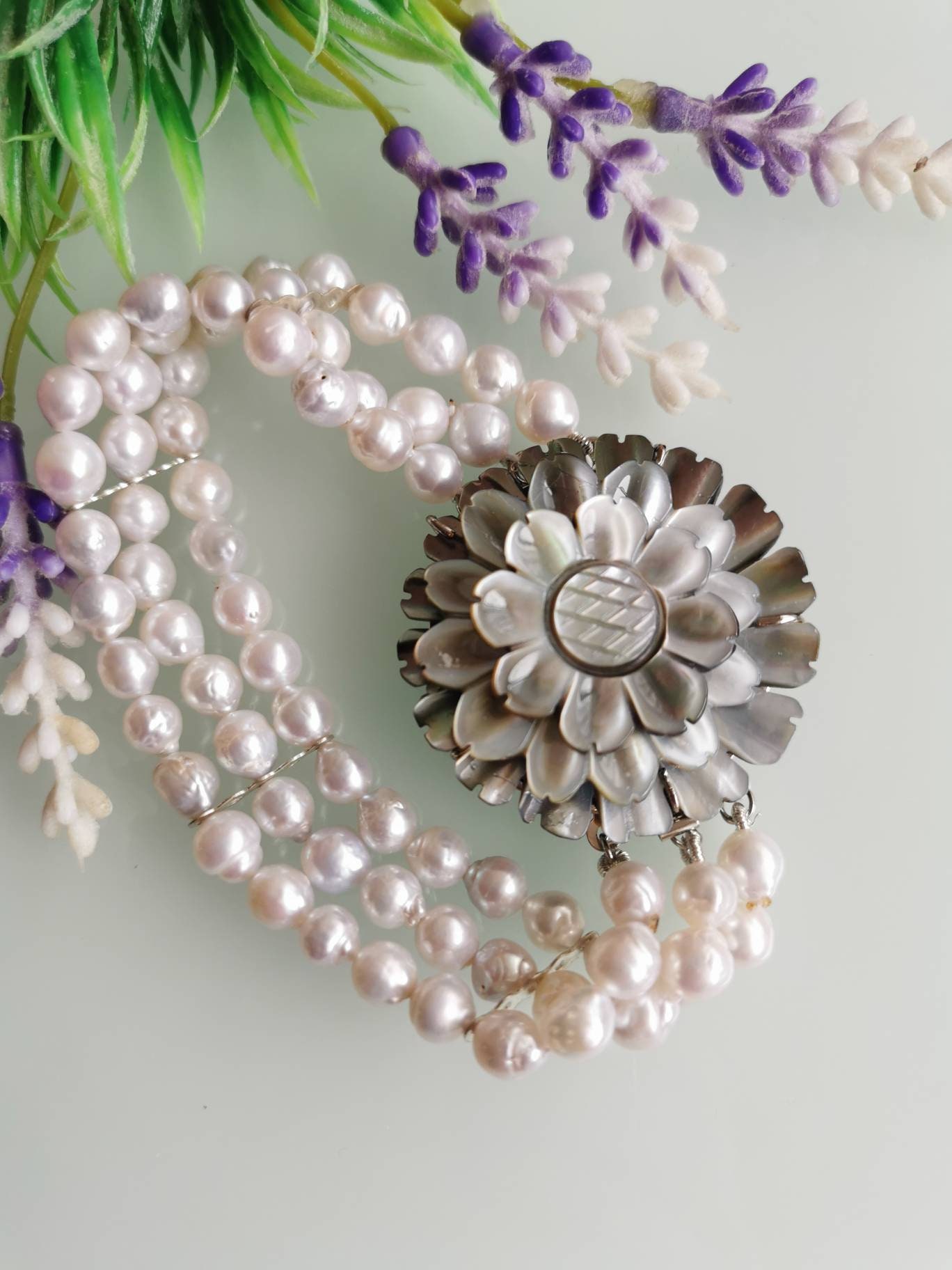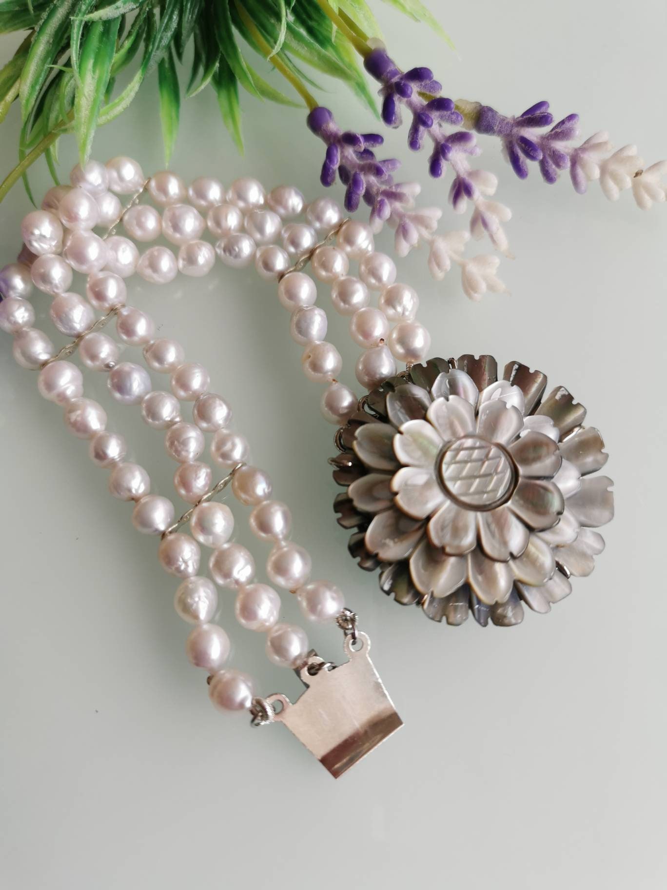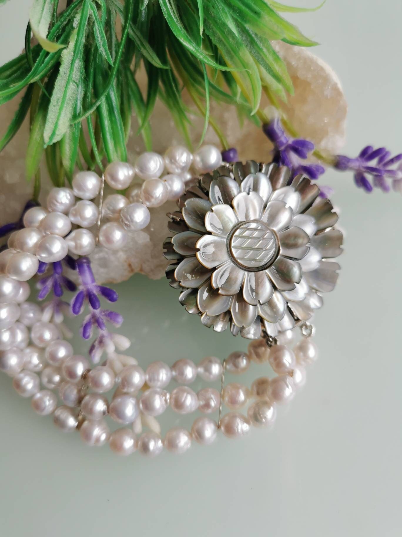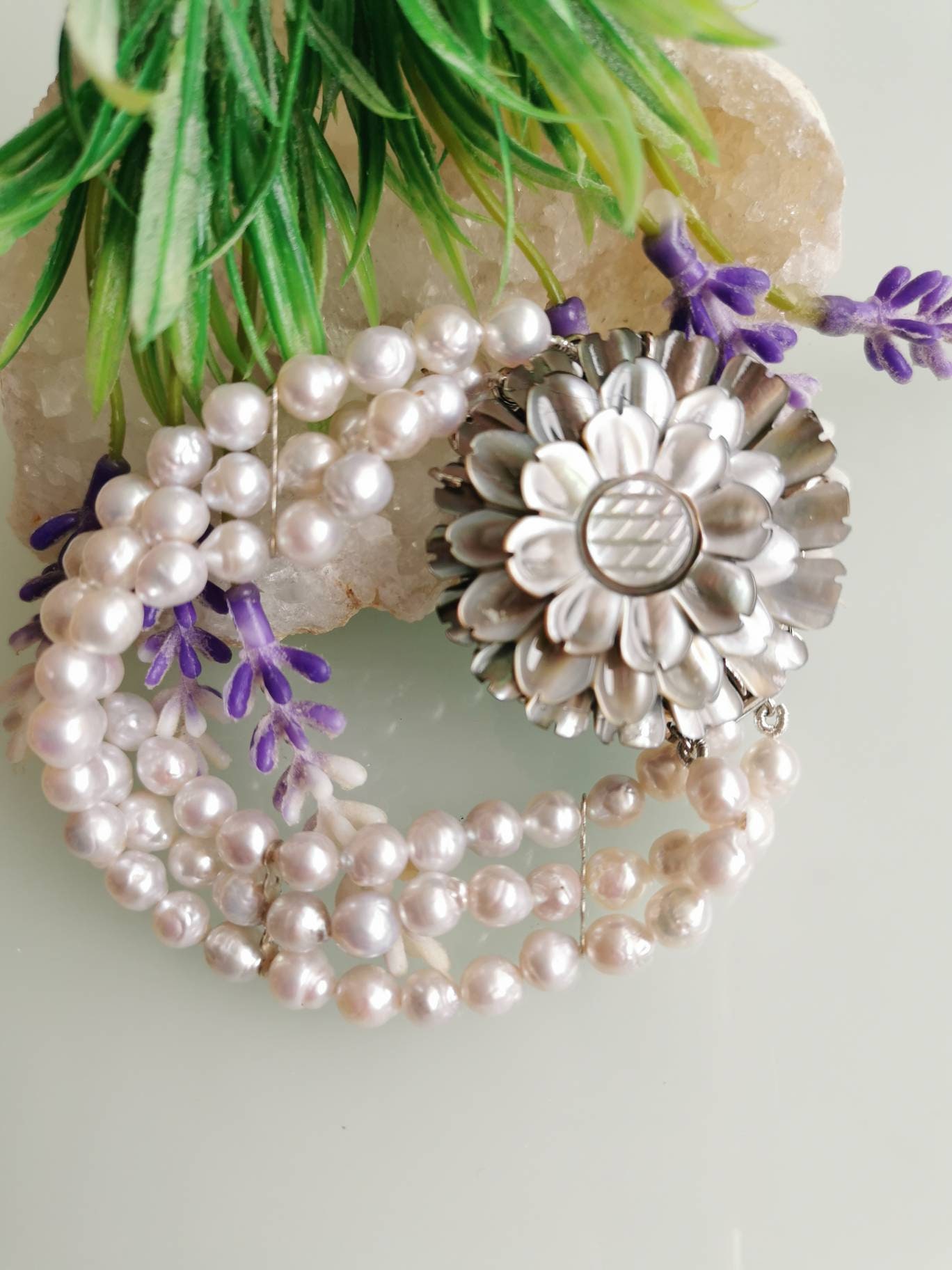 Bracciale a 3 fili perle naturali bianche barocche piccole e chiusura a clip con fiore madreperla grigia grande 4 cm diametro .