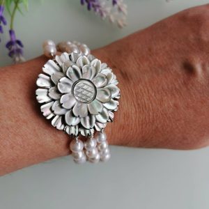 Bracciale perle bianche barocche e fiore madreperla, bracciale maxi