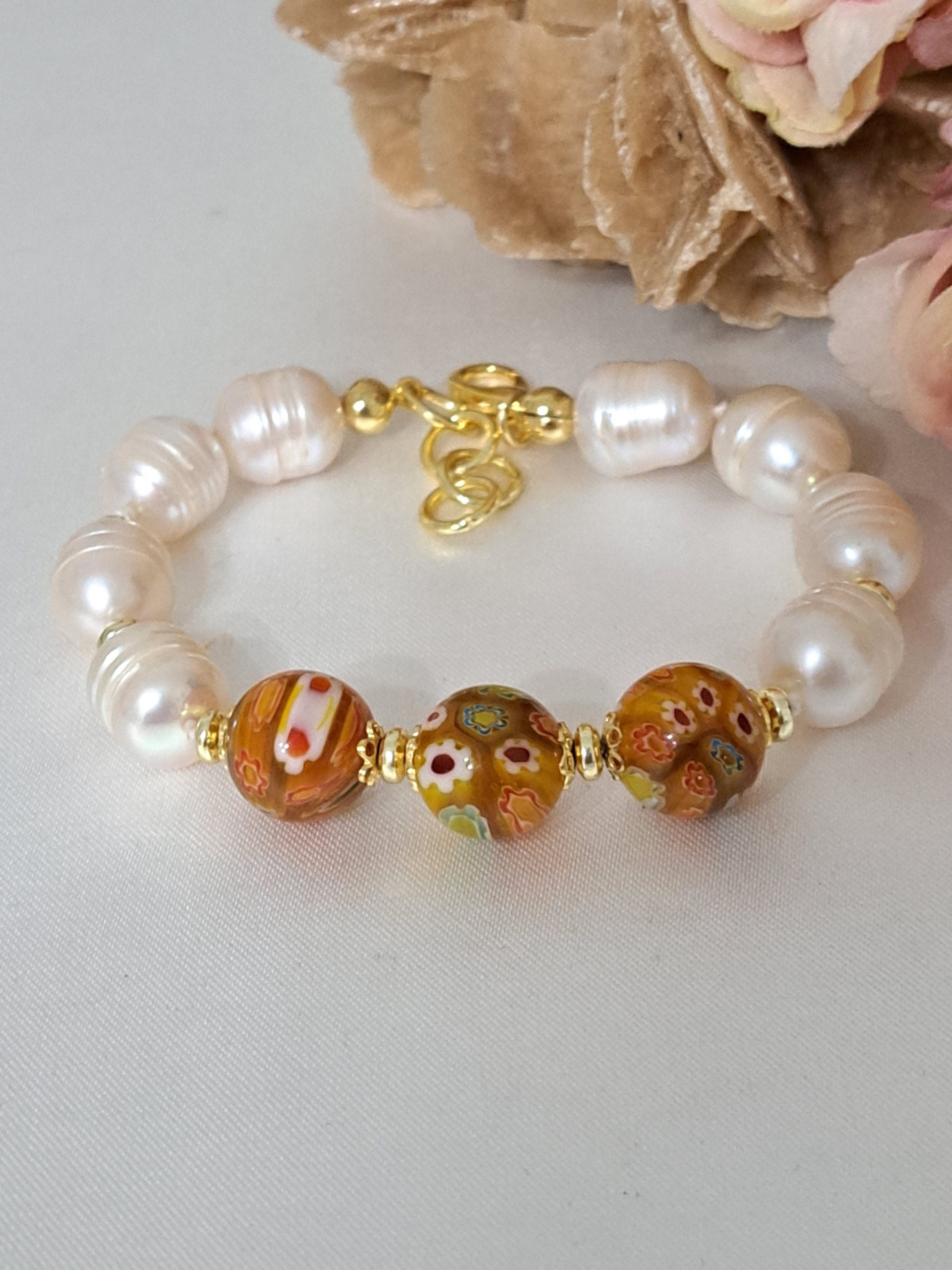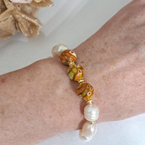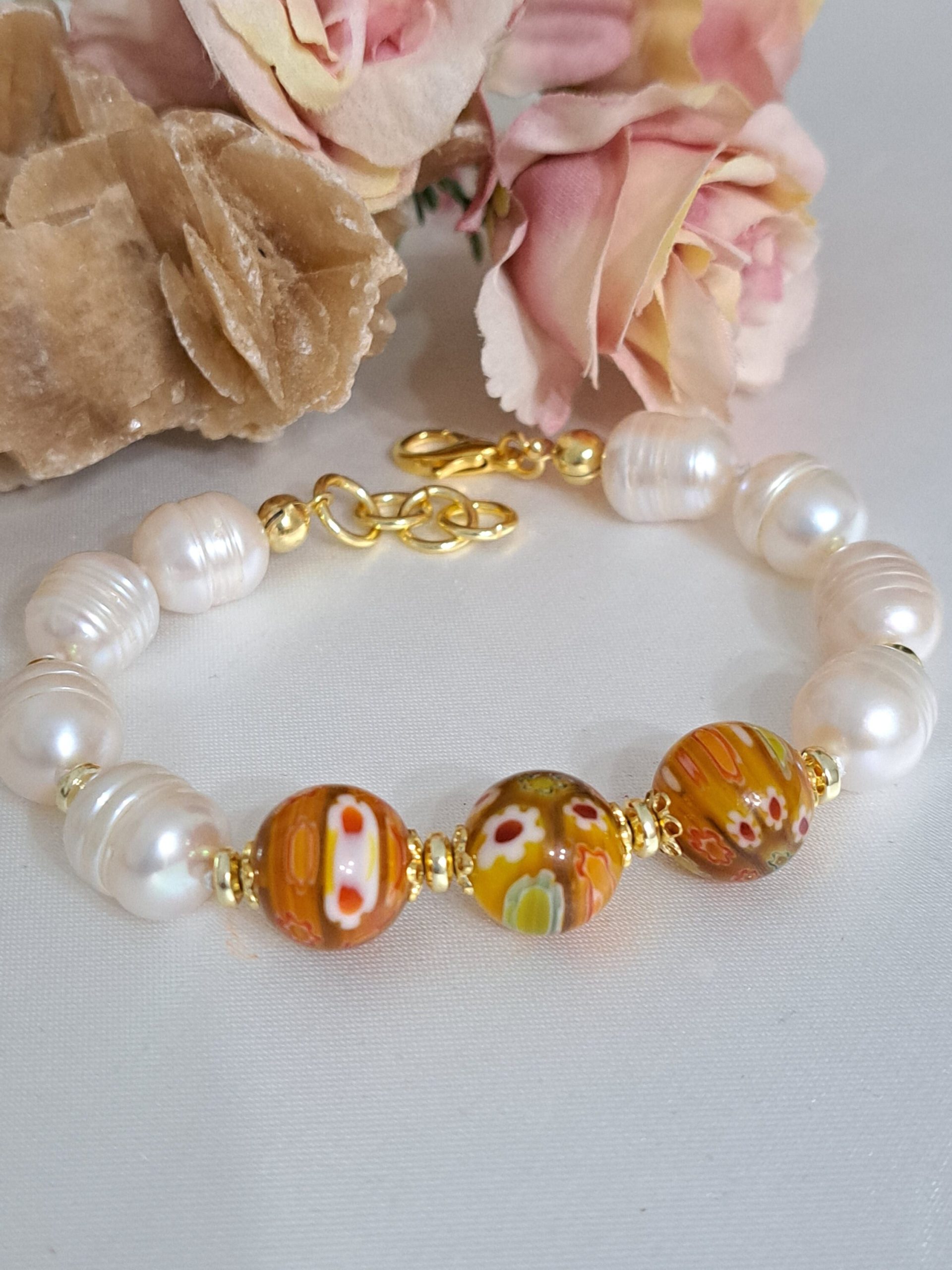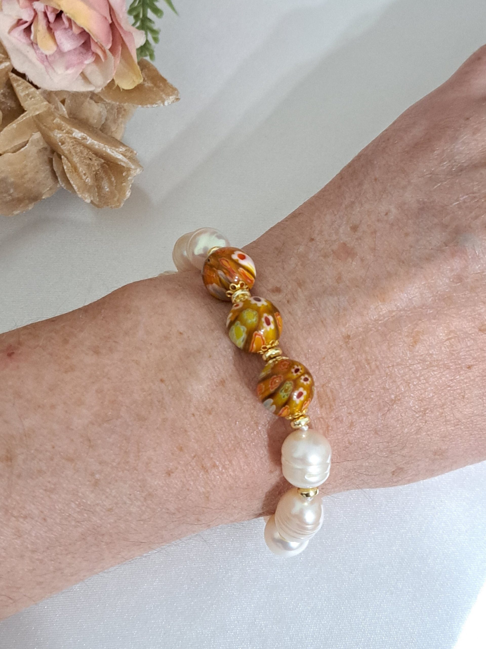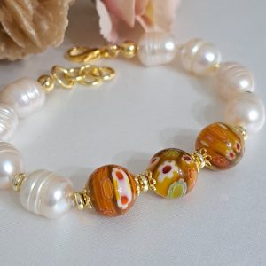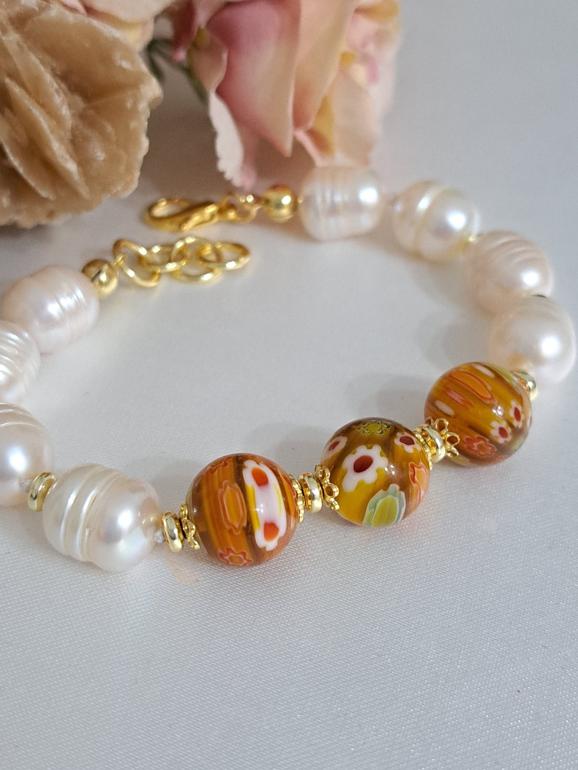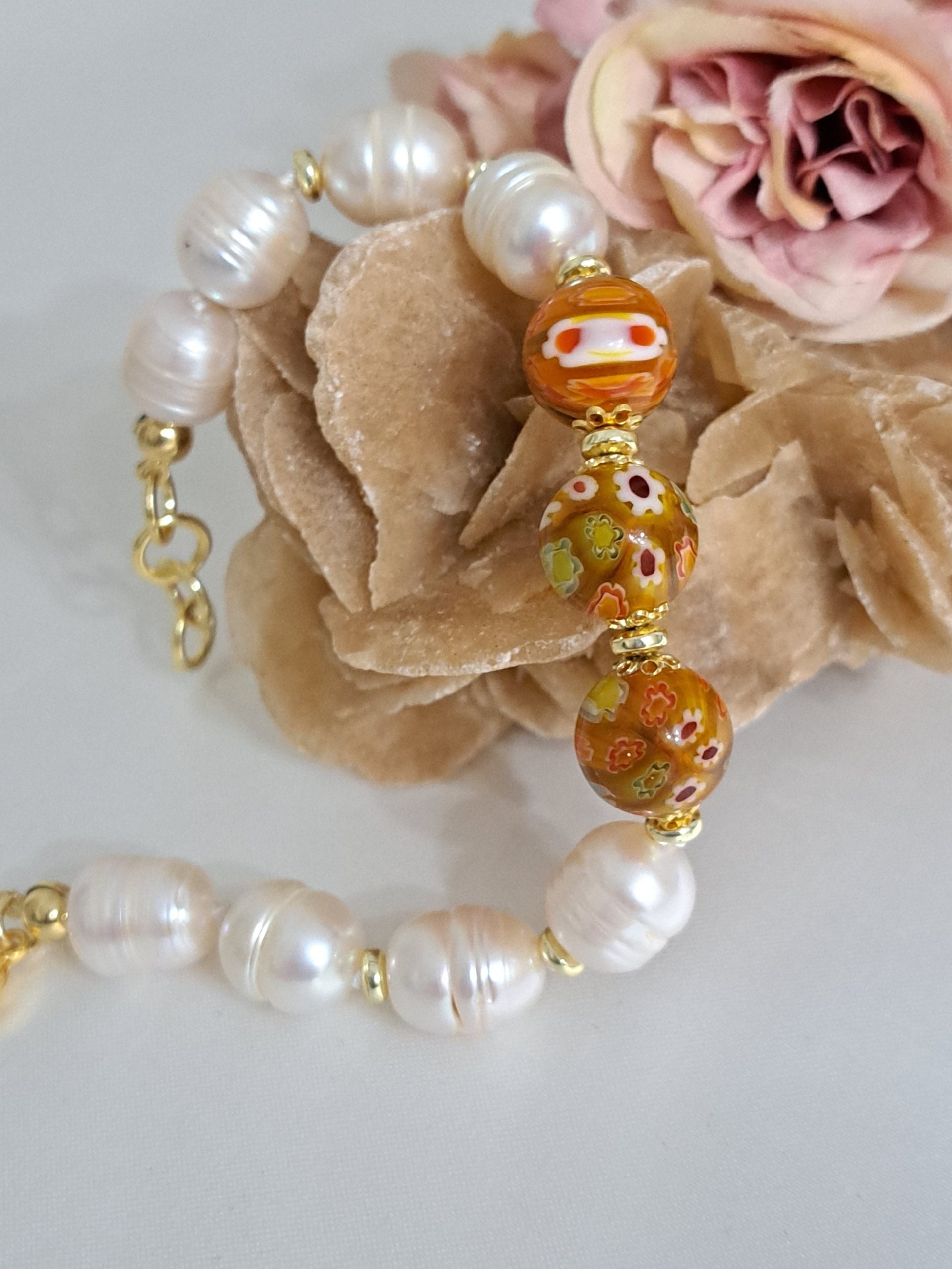 Bracciale realizzato a mano con perle naturali bianche 11 mm con perle vetro lampwork murine millefiori e chiusura a moschettone in ottone dorato .