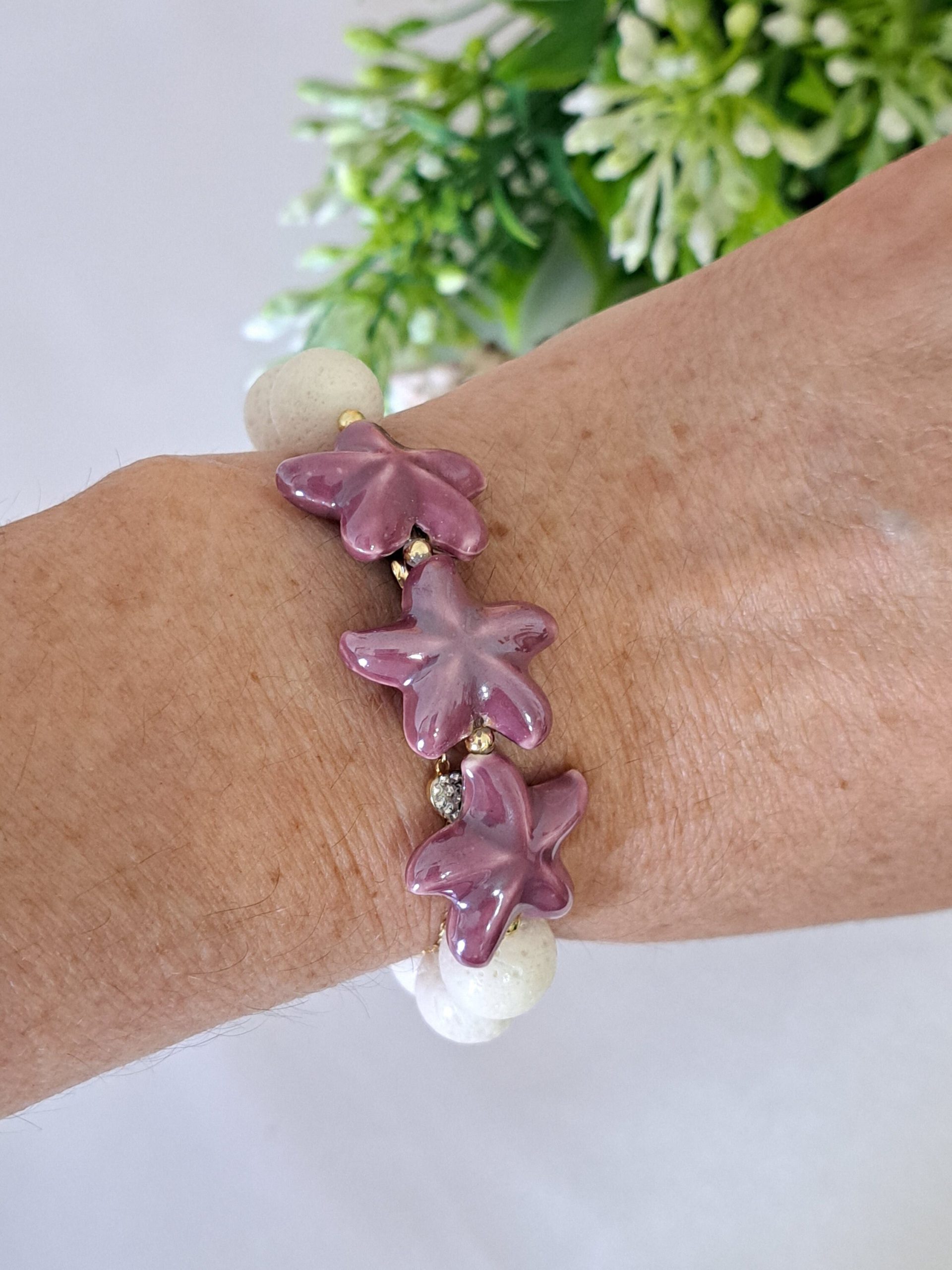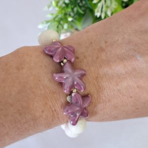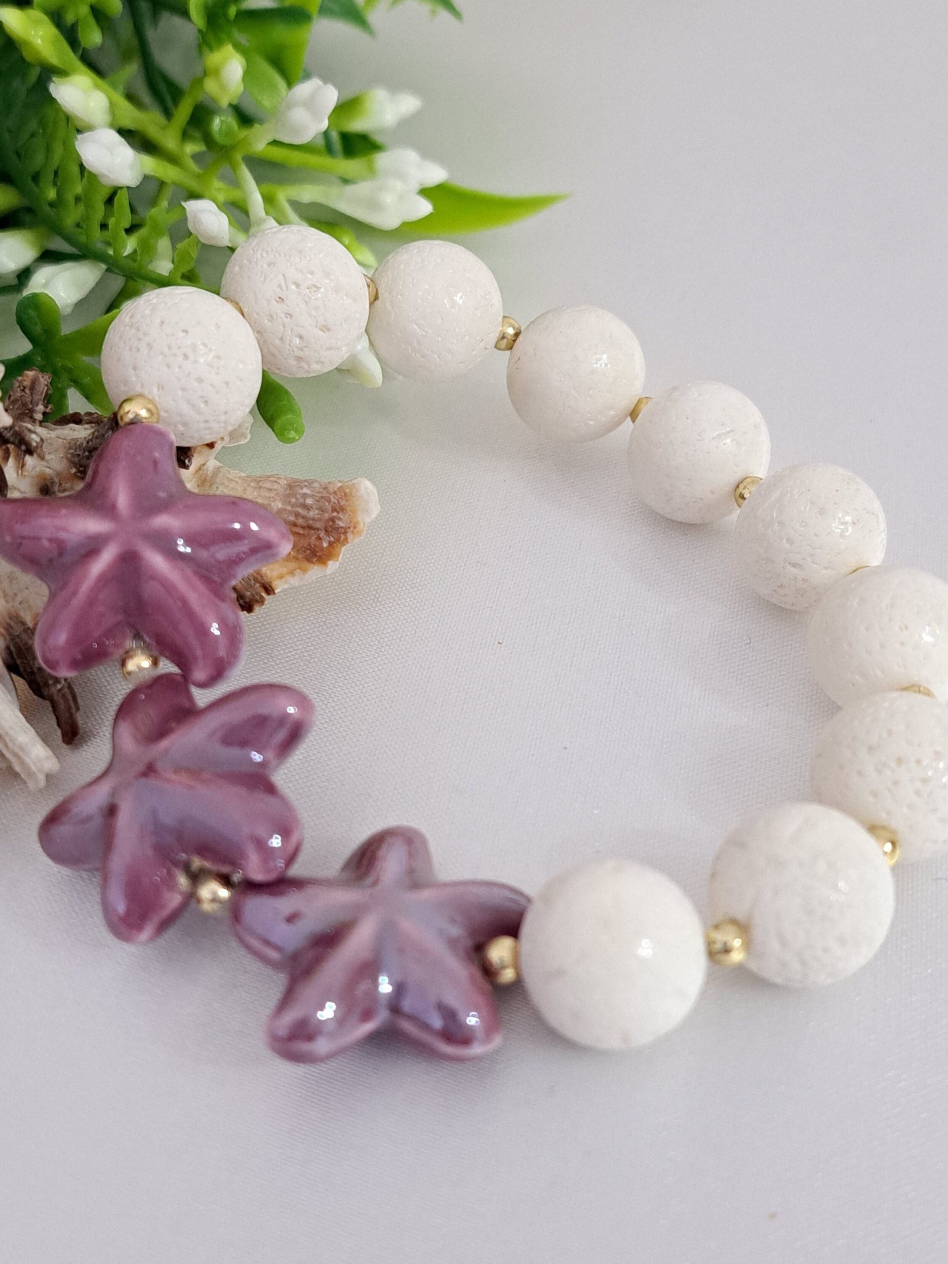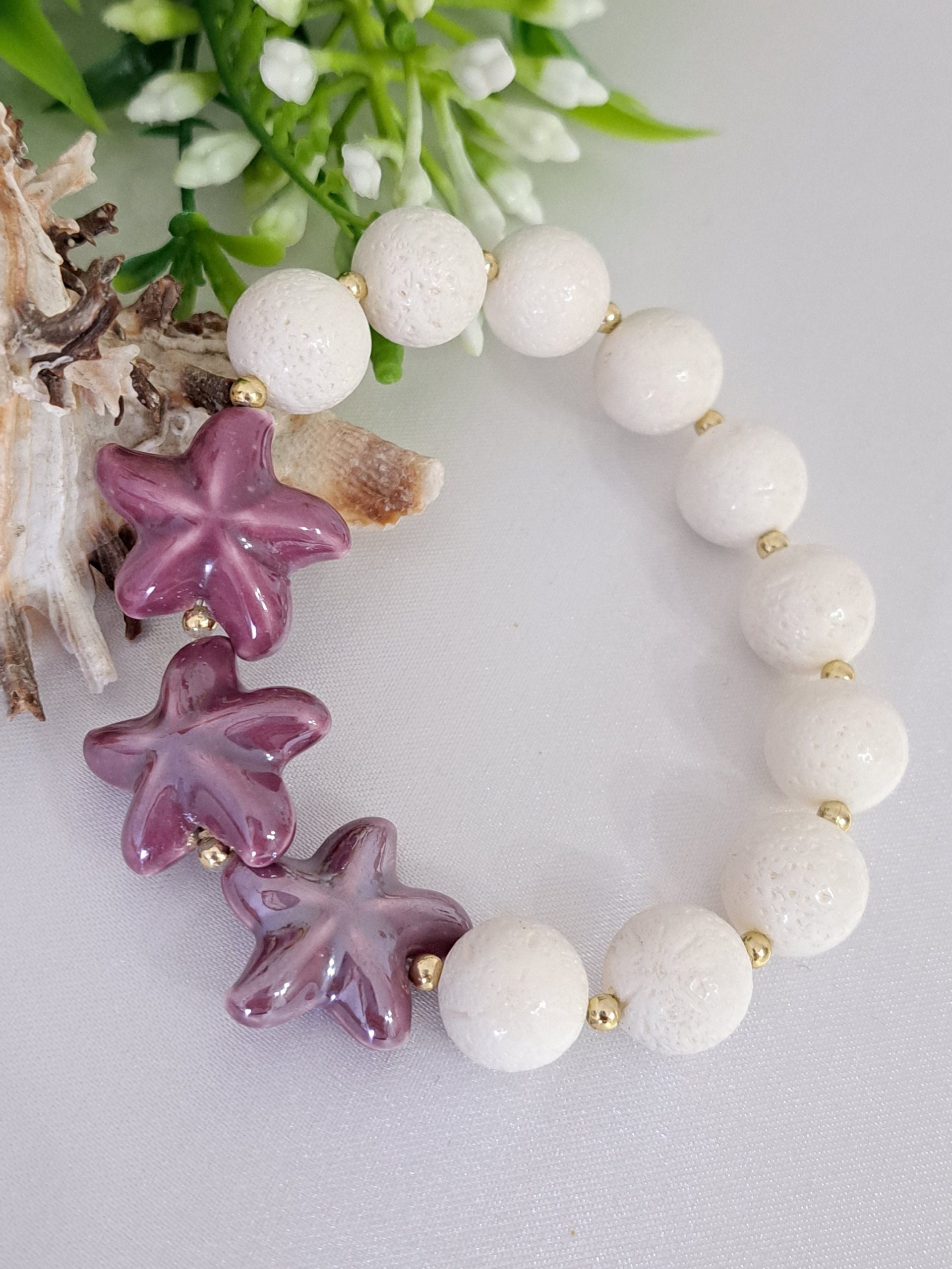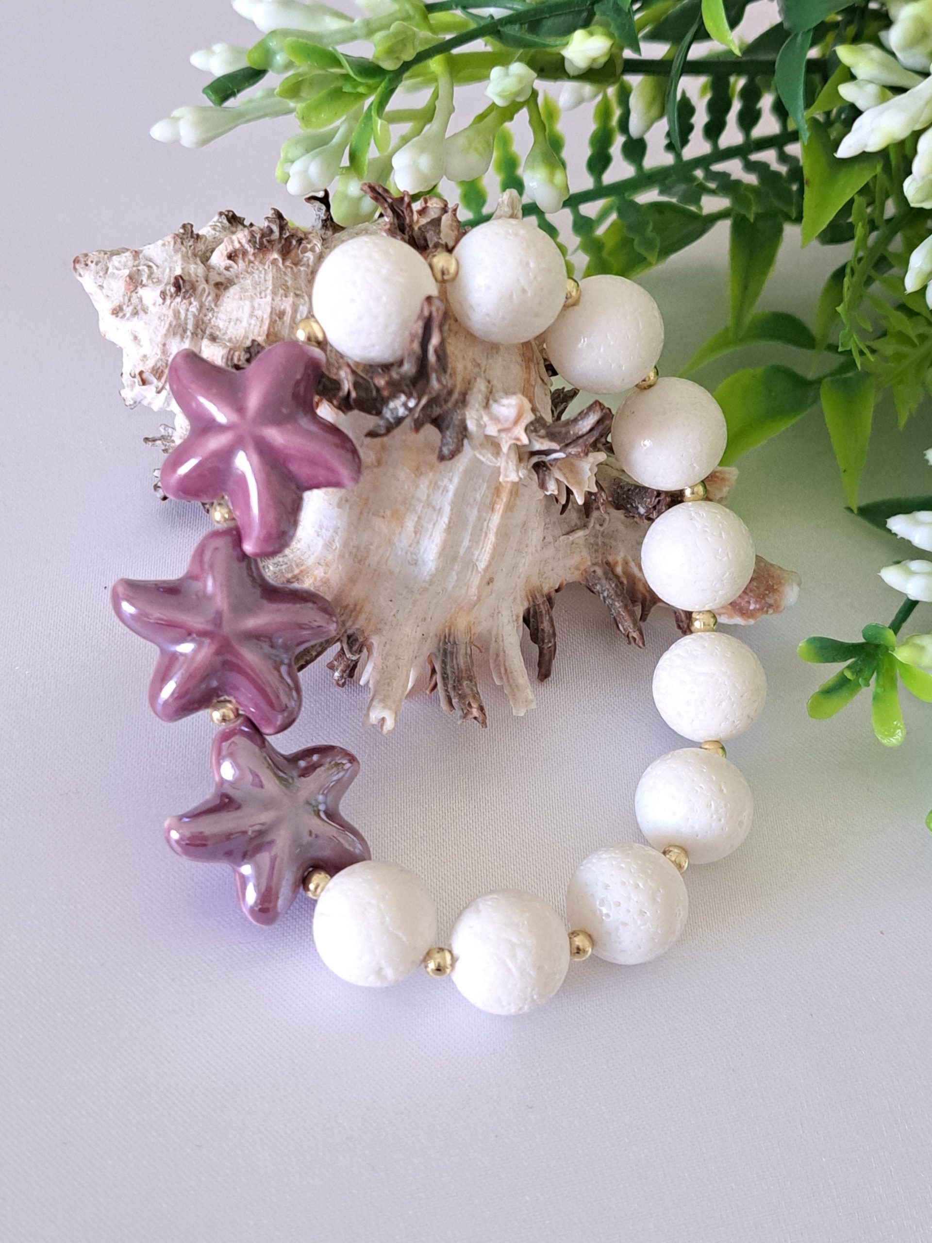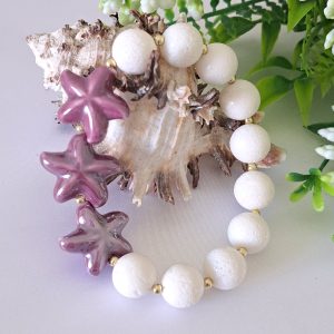 Bracciale elastico realizzato a mano con perle corallo bianco 12 mm con stelle marine in ceramica viola.