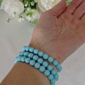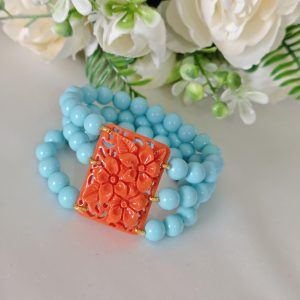 Bracciale elastico a 3 fili realizzato con perle pasta di turchese imitazione 8 mm e con elemento centrale rettangolare in resina arancione imitazione corallo, 3,5×2,5 cm dimensioni.