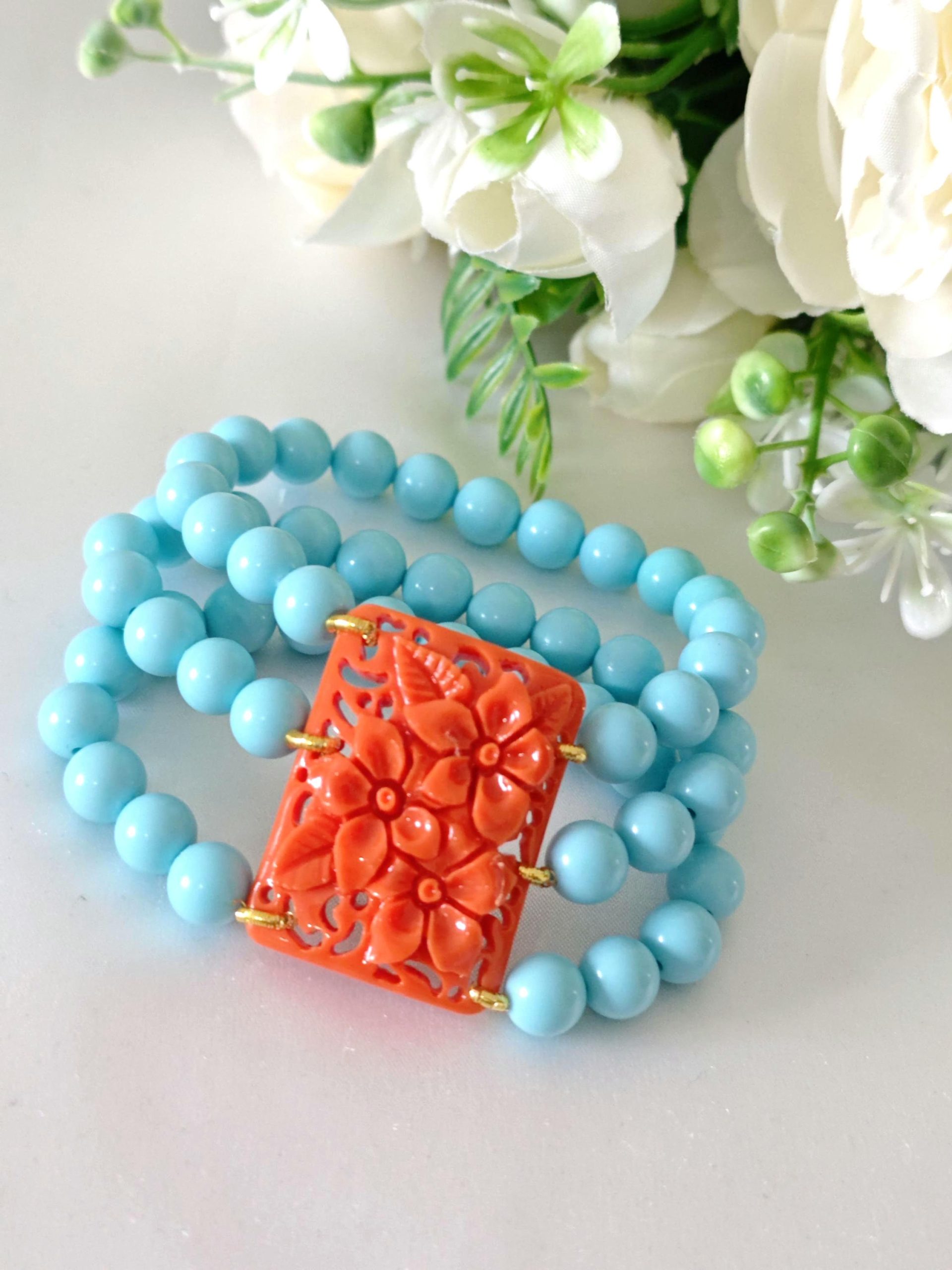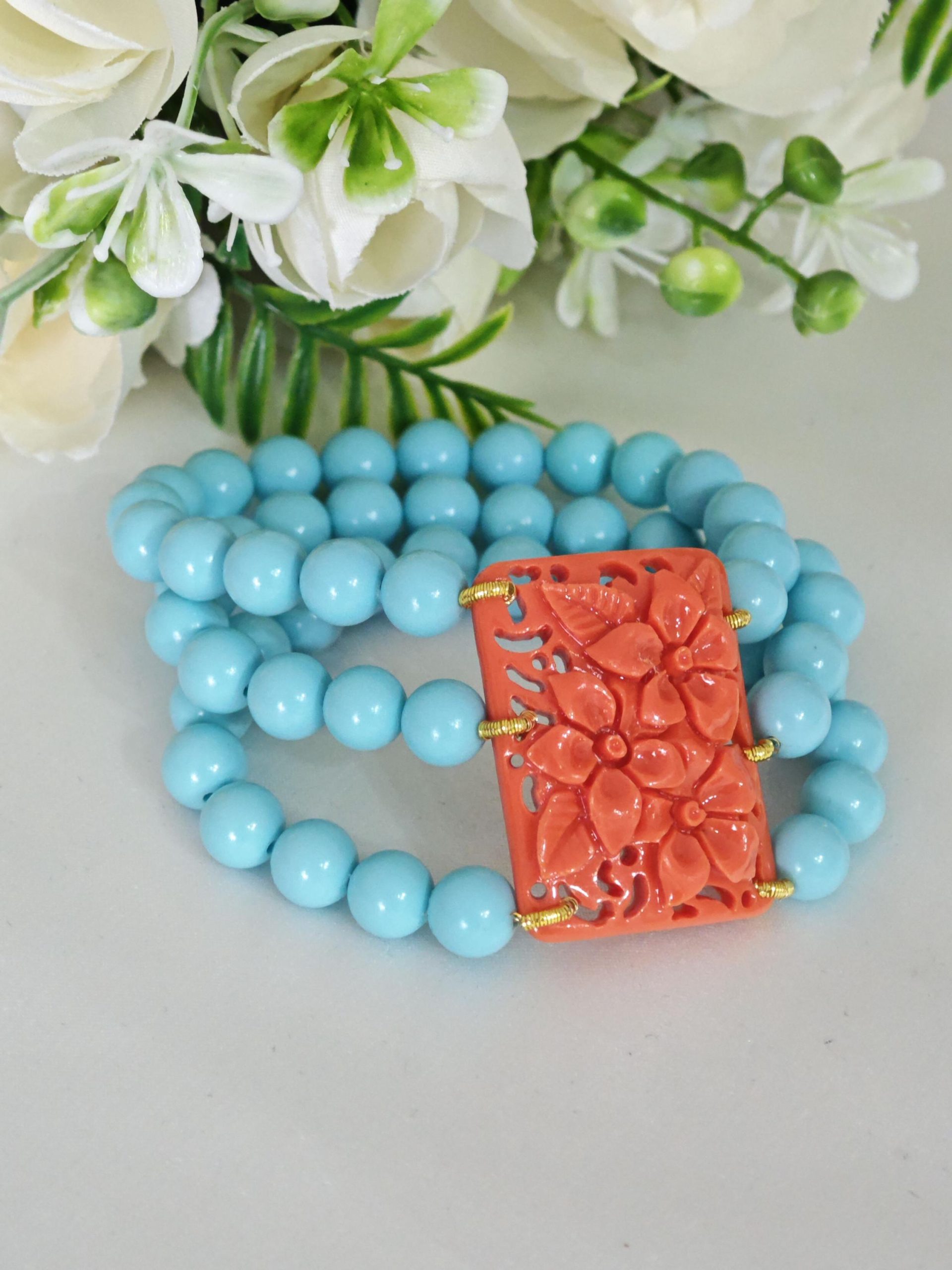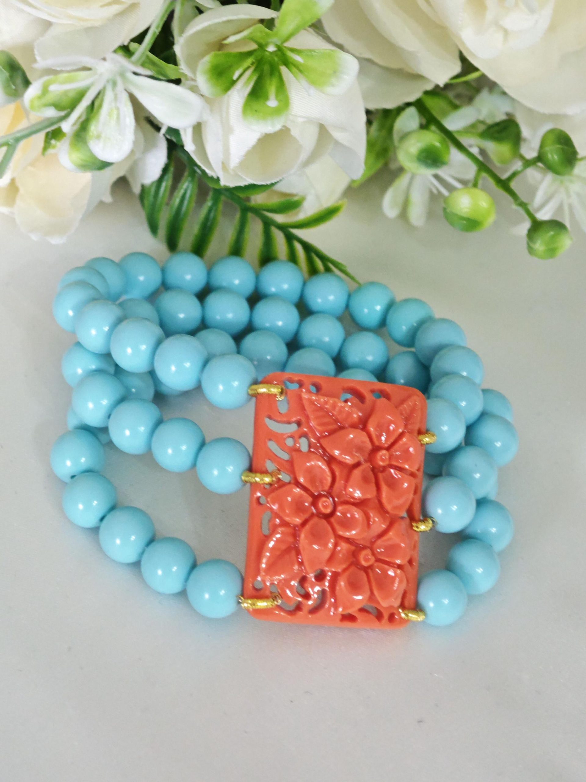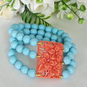 Bracciale perle pasta di turchese e fiori imitazione corallo, bracciale 3 fili elastico