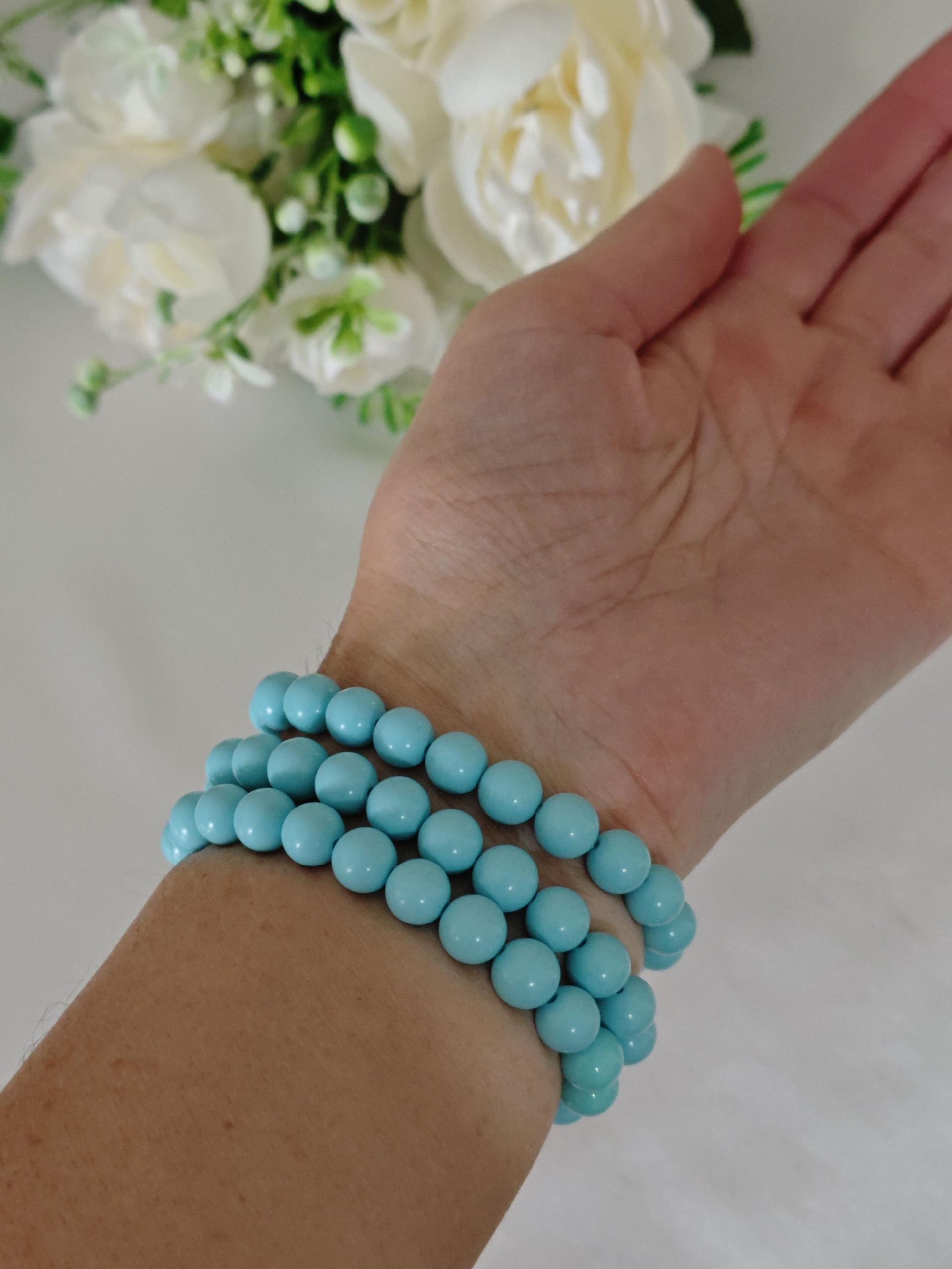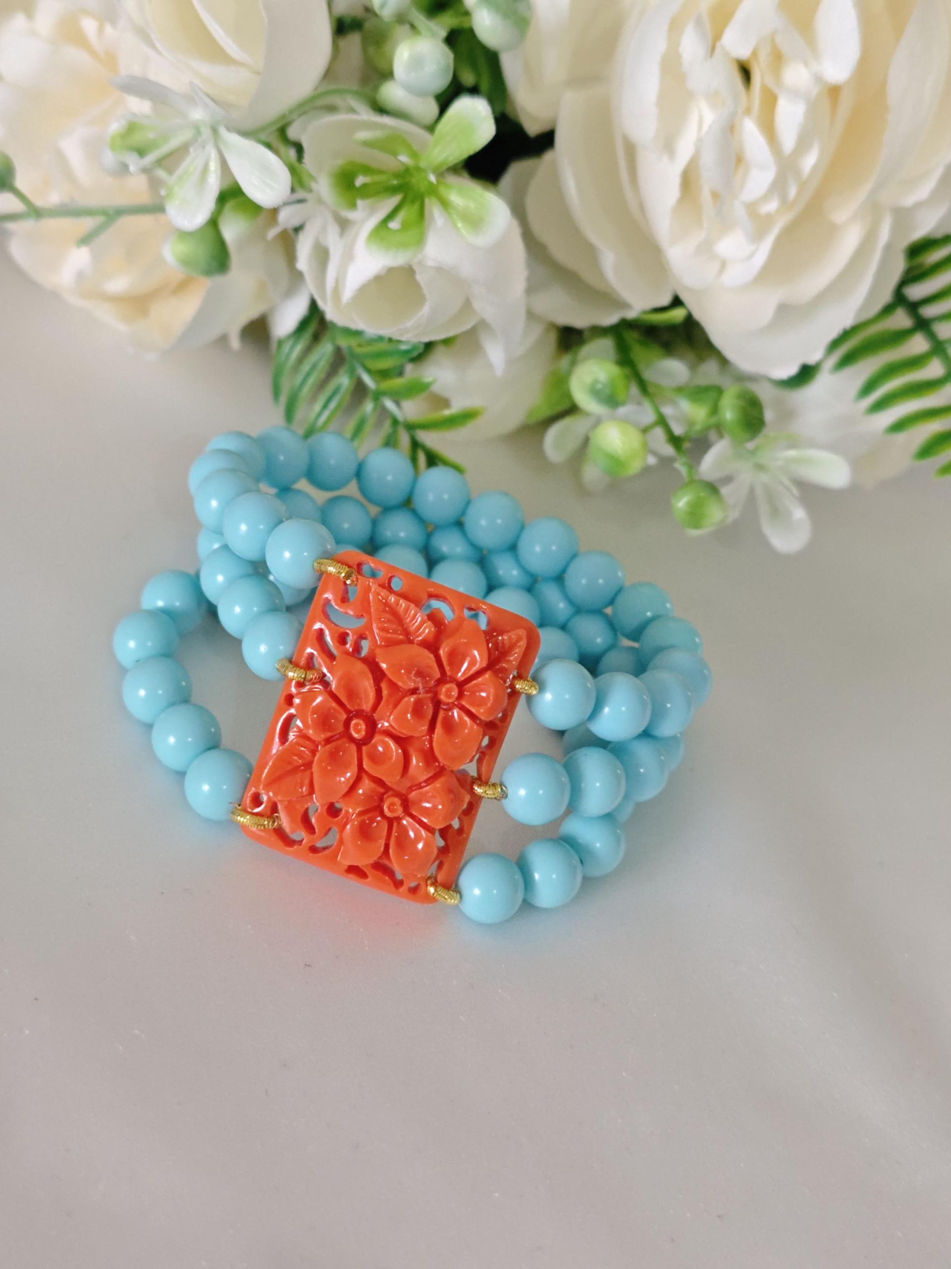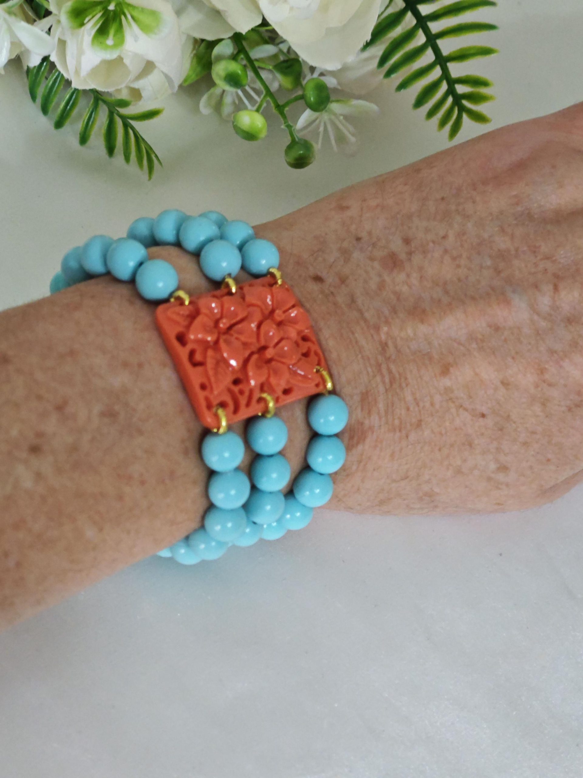 Bracciale perle pasta di turchese e fiori imitazione corallo, bracciale 3 fili elastico