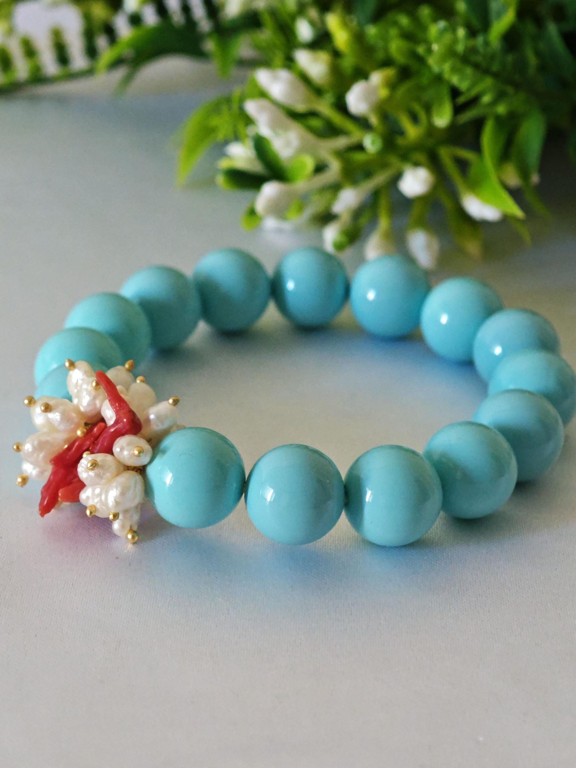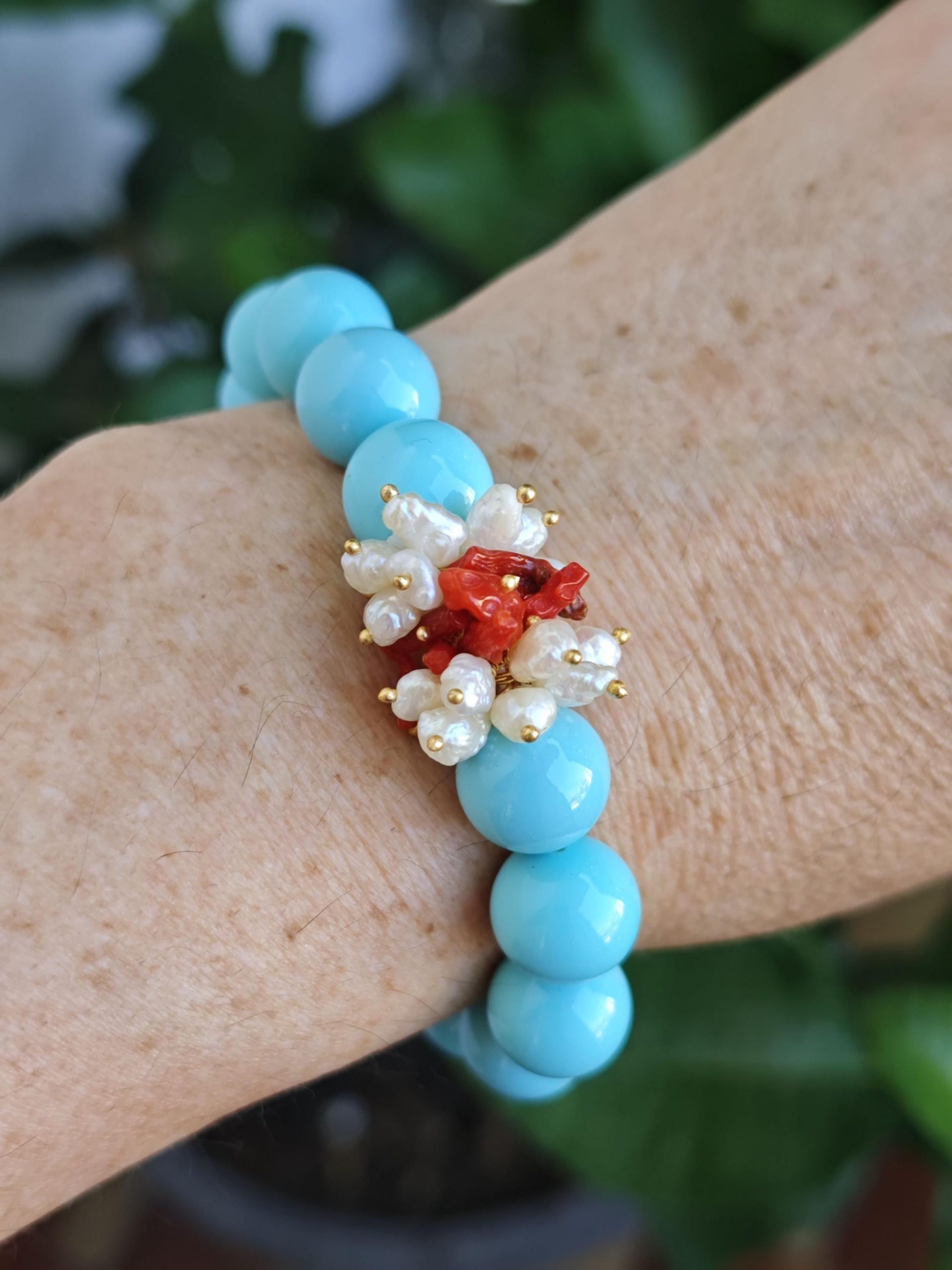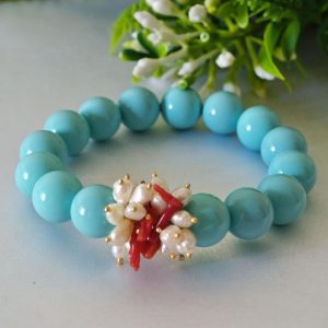 Bracciale elastico realizzato a mano con grappolo perle naturali bianche e rametti corallo rosso mediterraneo e perle pasta di turchese imitazione 12 mm.