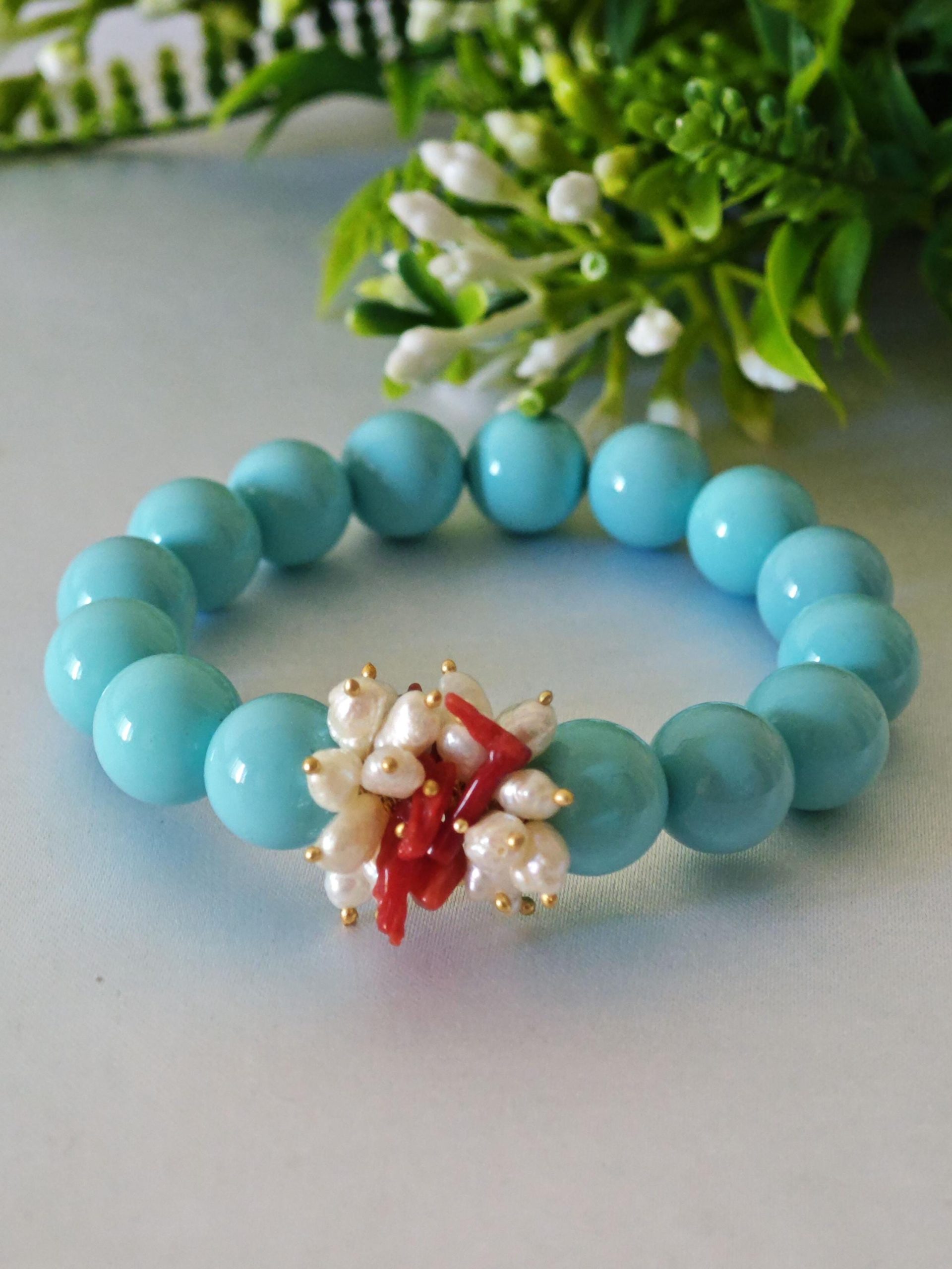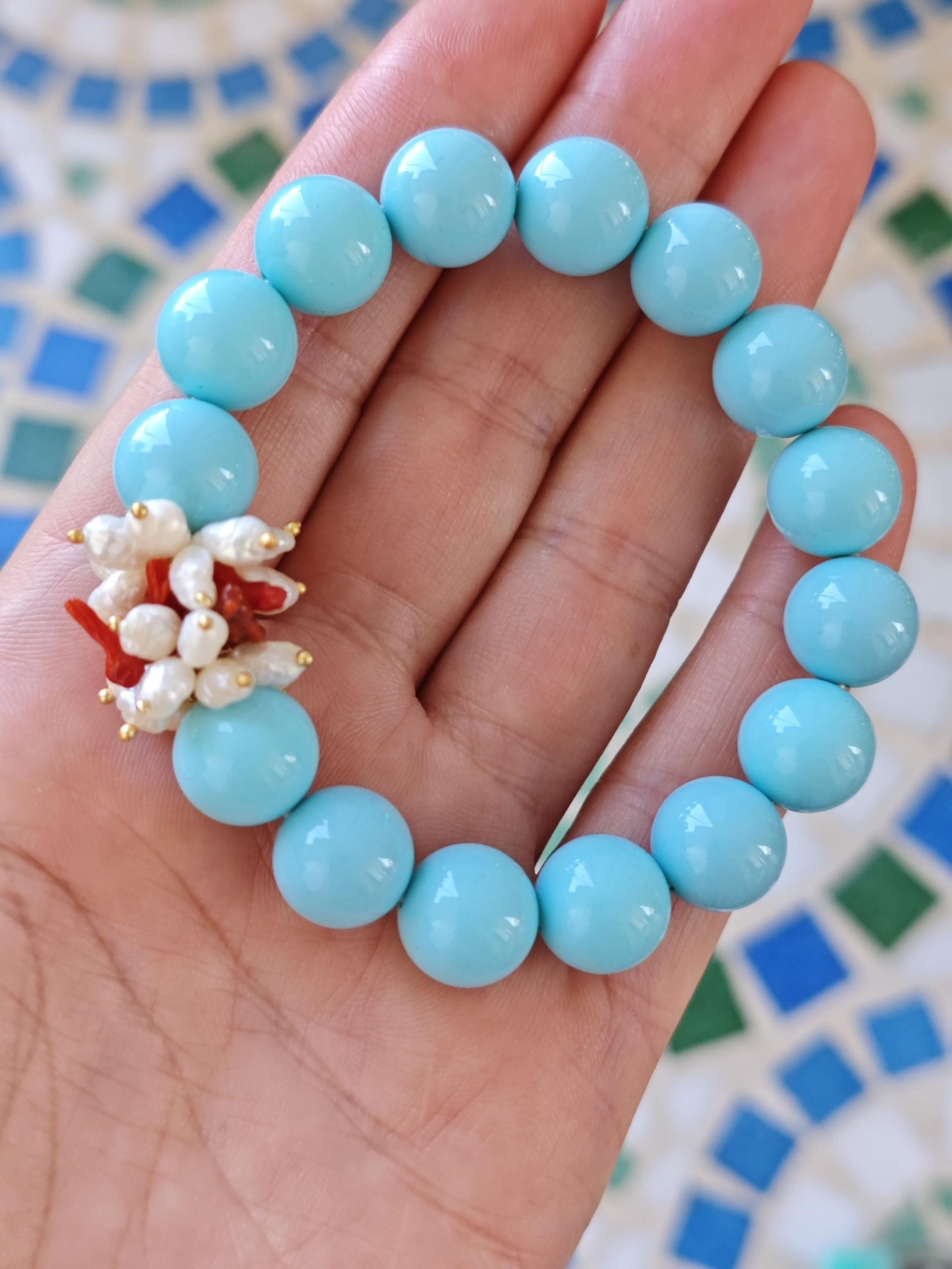 Bracciale perle pasta di turchese, perle bianche e corallo rosso mediterraneo, bracciale elastico