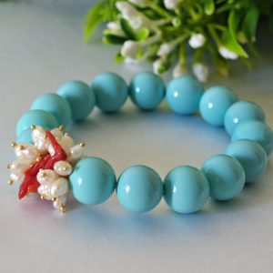 Bracciale perle pasta di turchese e fiori imitazione corallo, bracciale 3 fili elastico