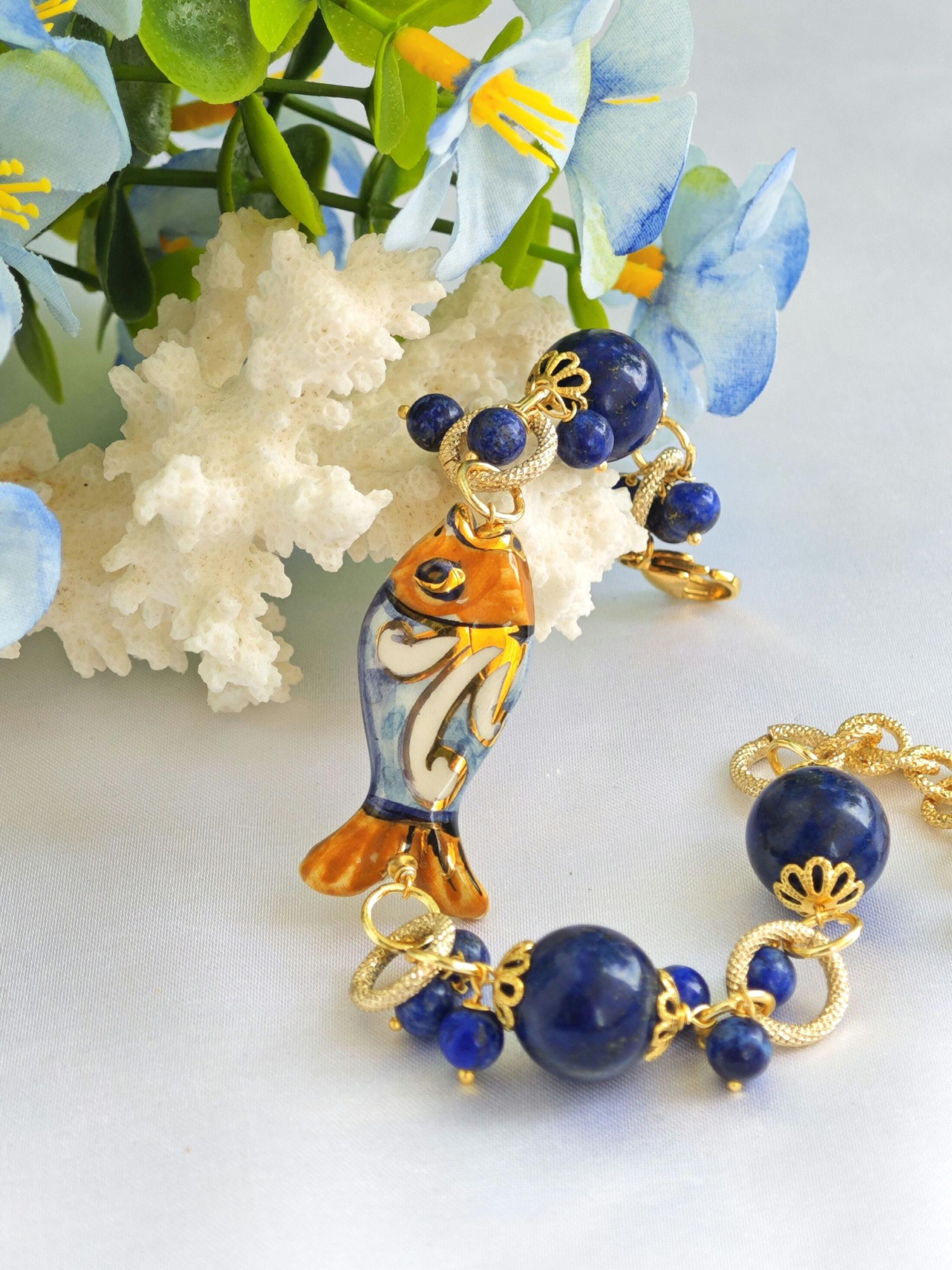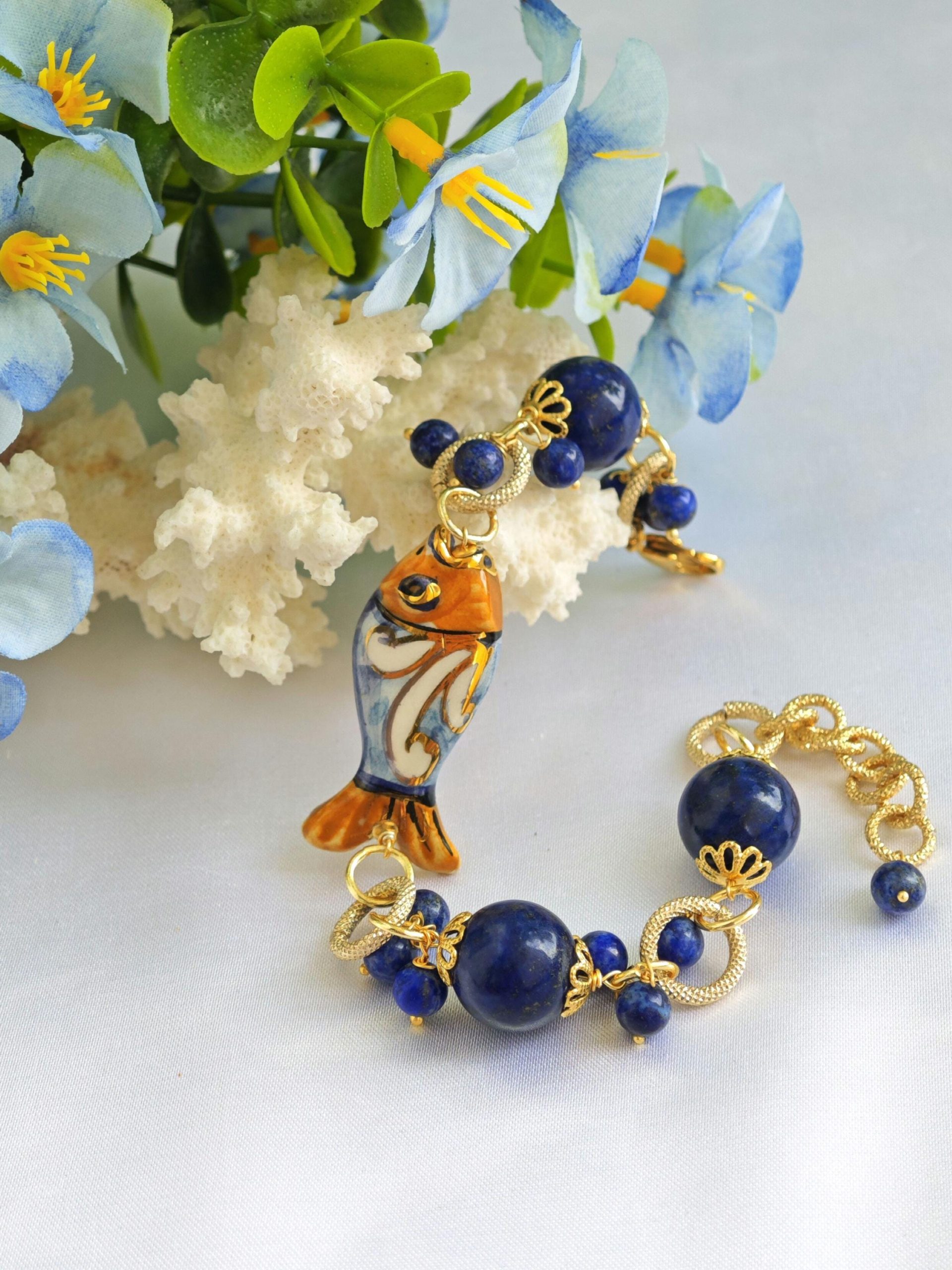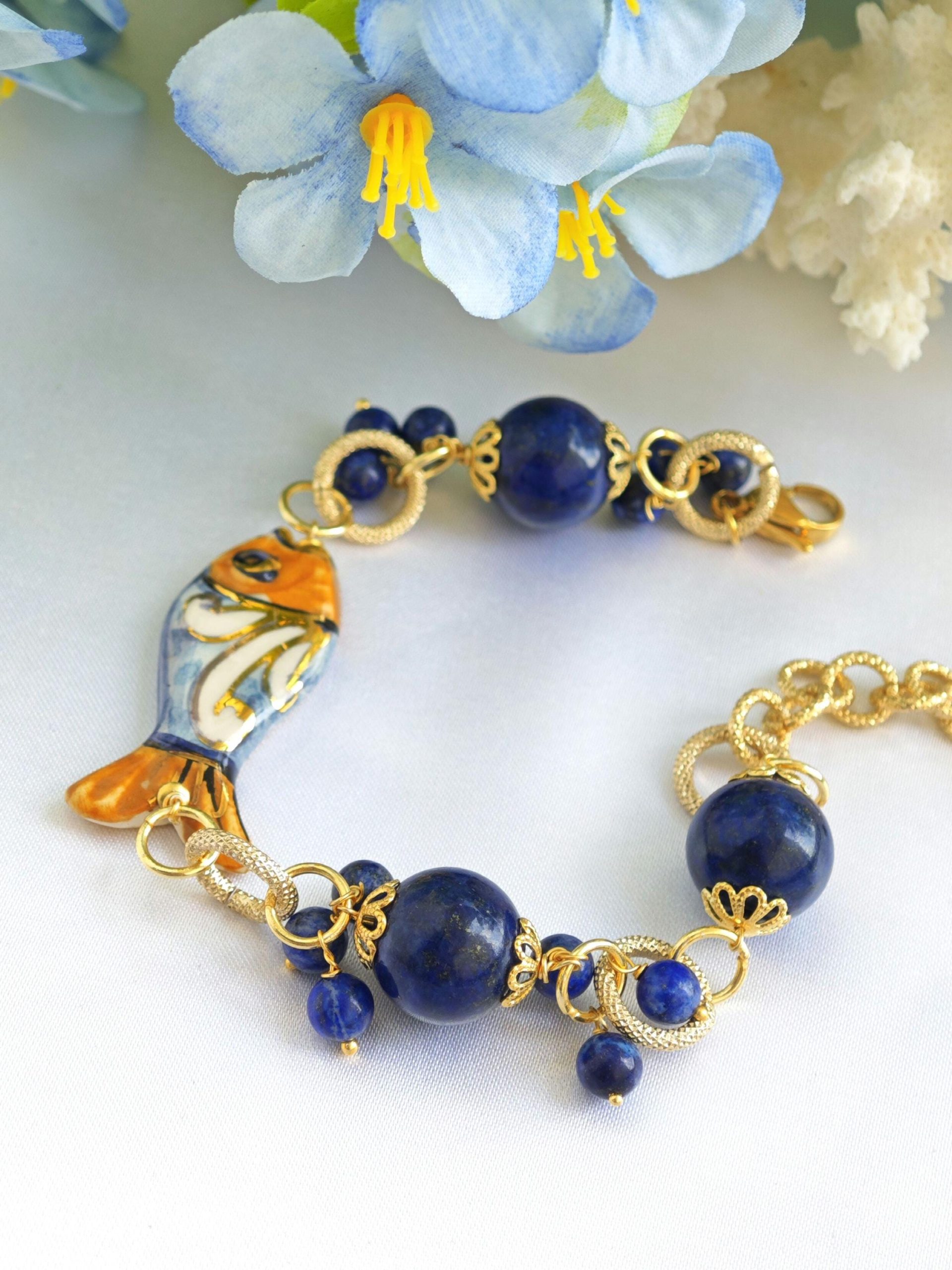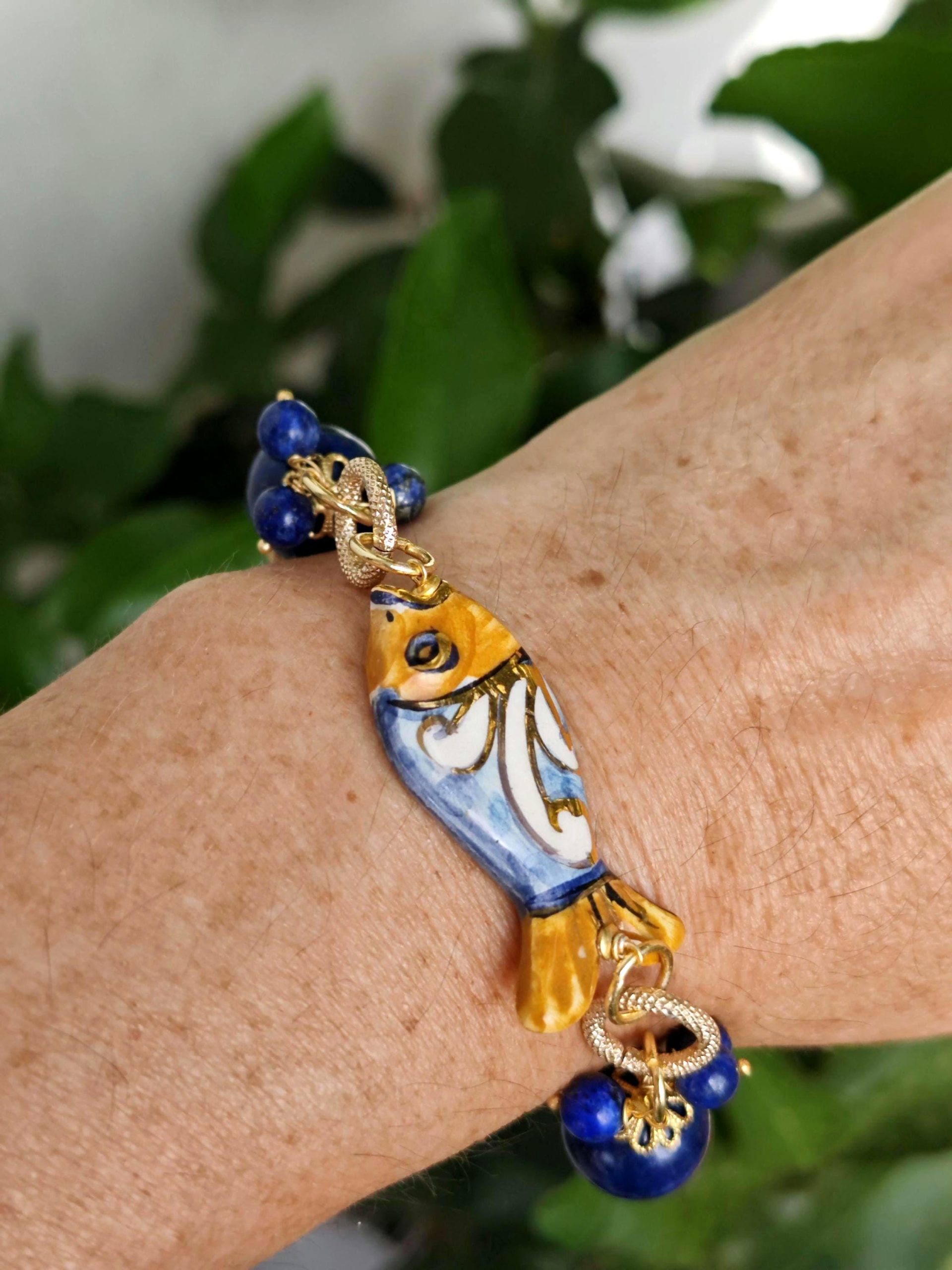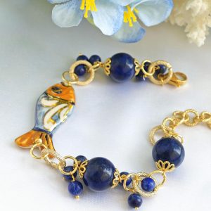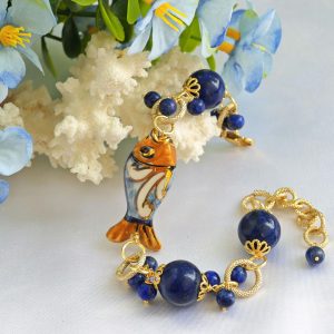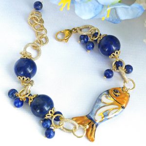 Bracciale pesce ceramica Caltagirone con pietre dure lapislazzuli blu, bracciale siciliano