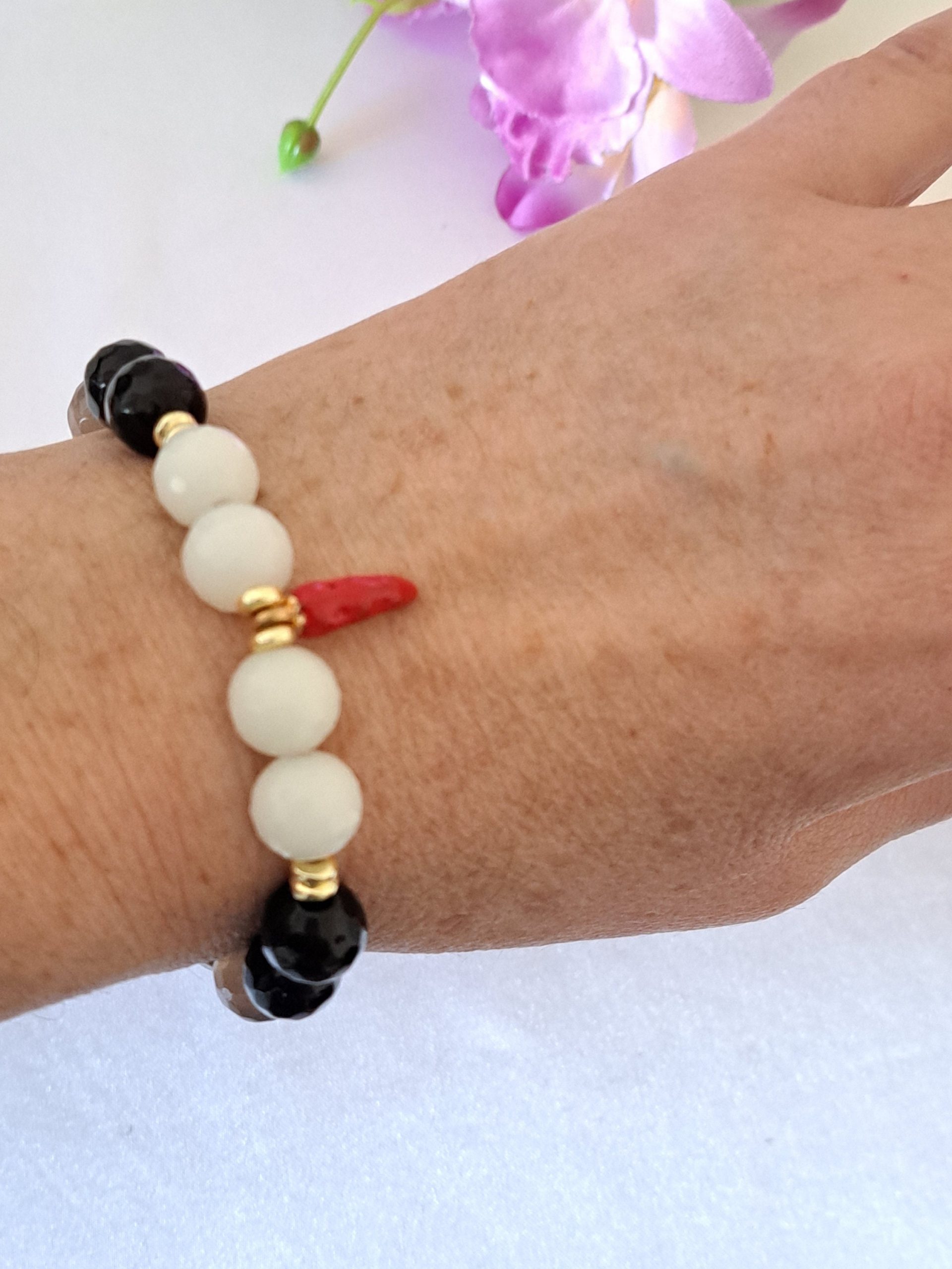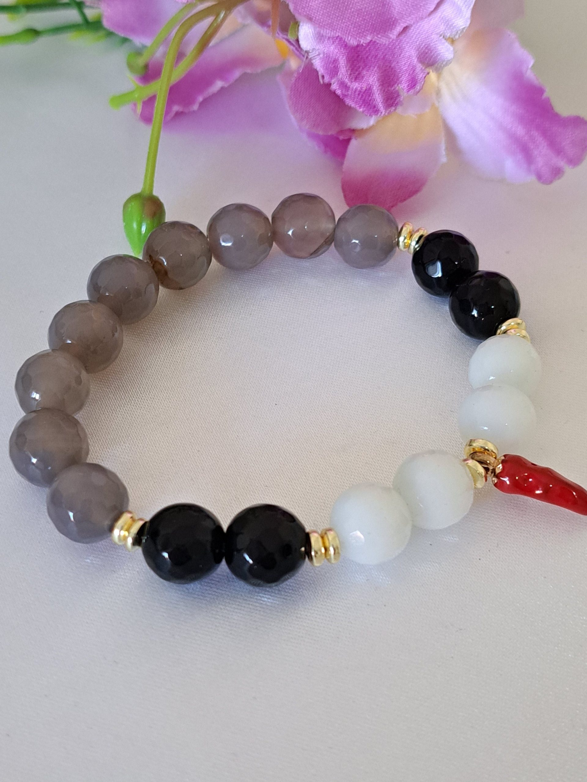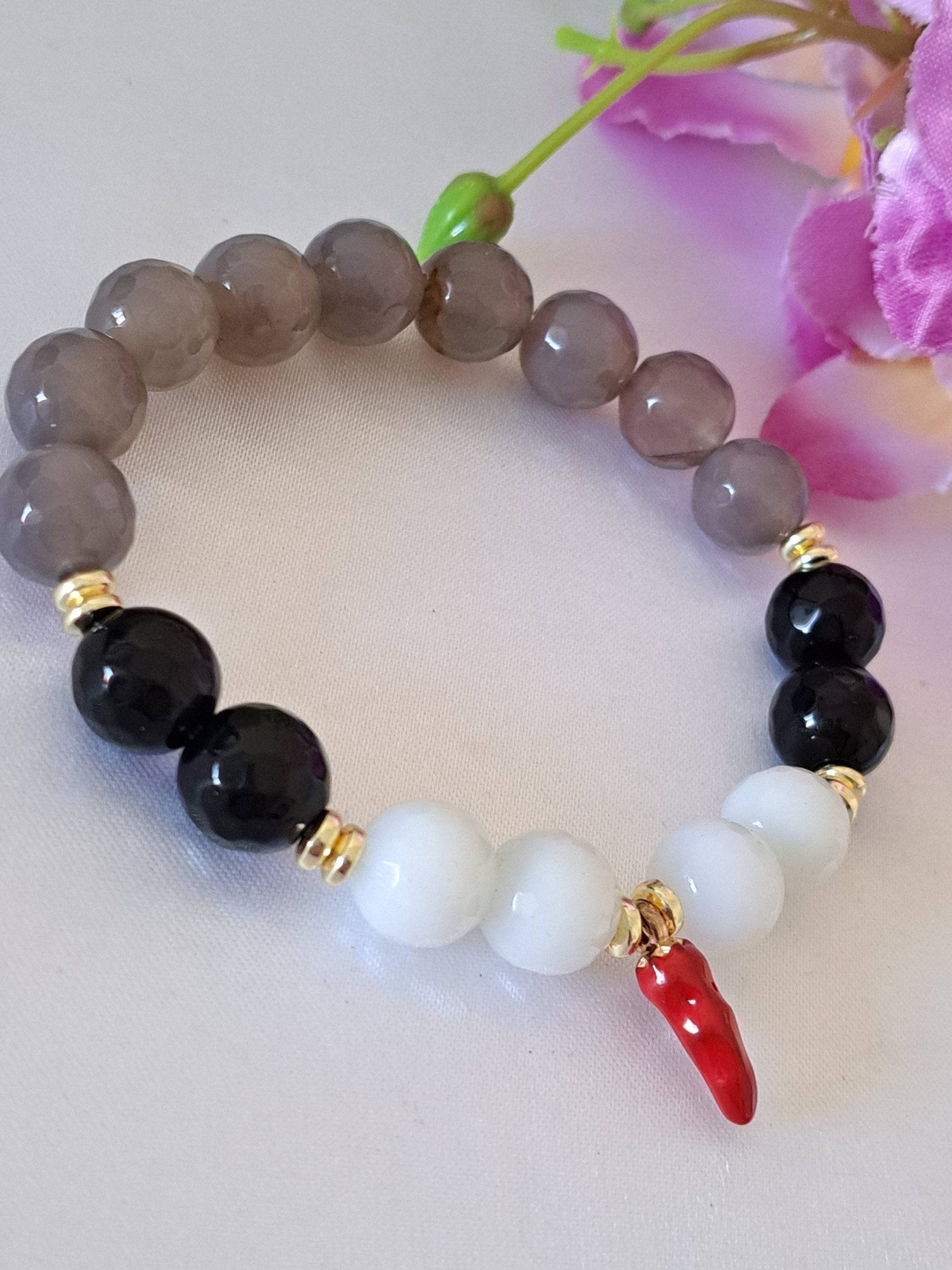 Bracciale elastico realizzato con pietre dure sfaccettate onice nero, agata grigia e bianca 10 mm e charms peperoncino .
