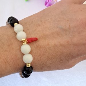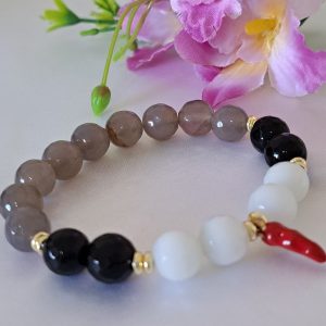 Bracciale pietre dure agata grigia e bianca e onice nero con peperoncino