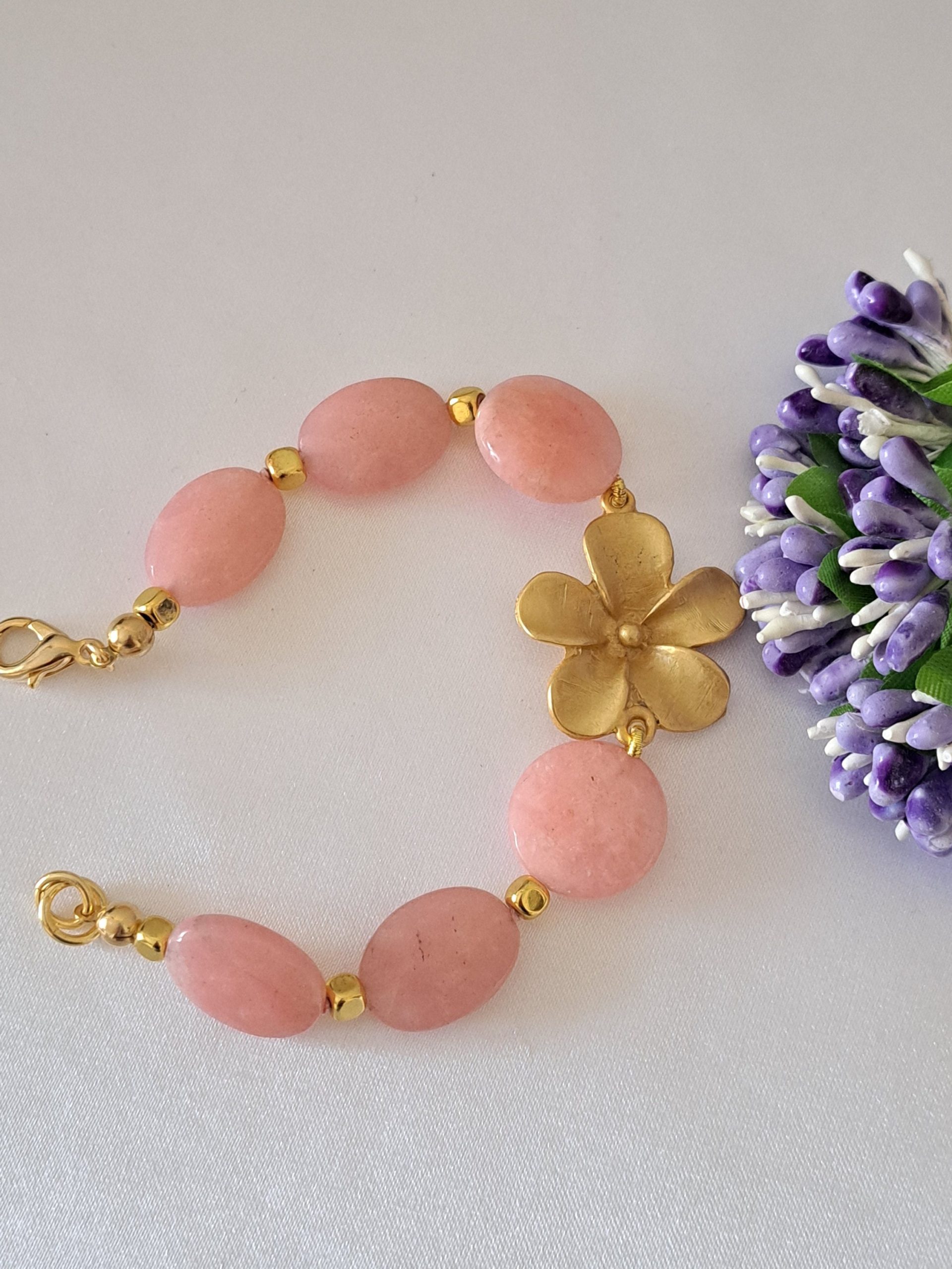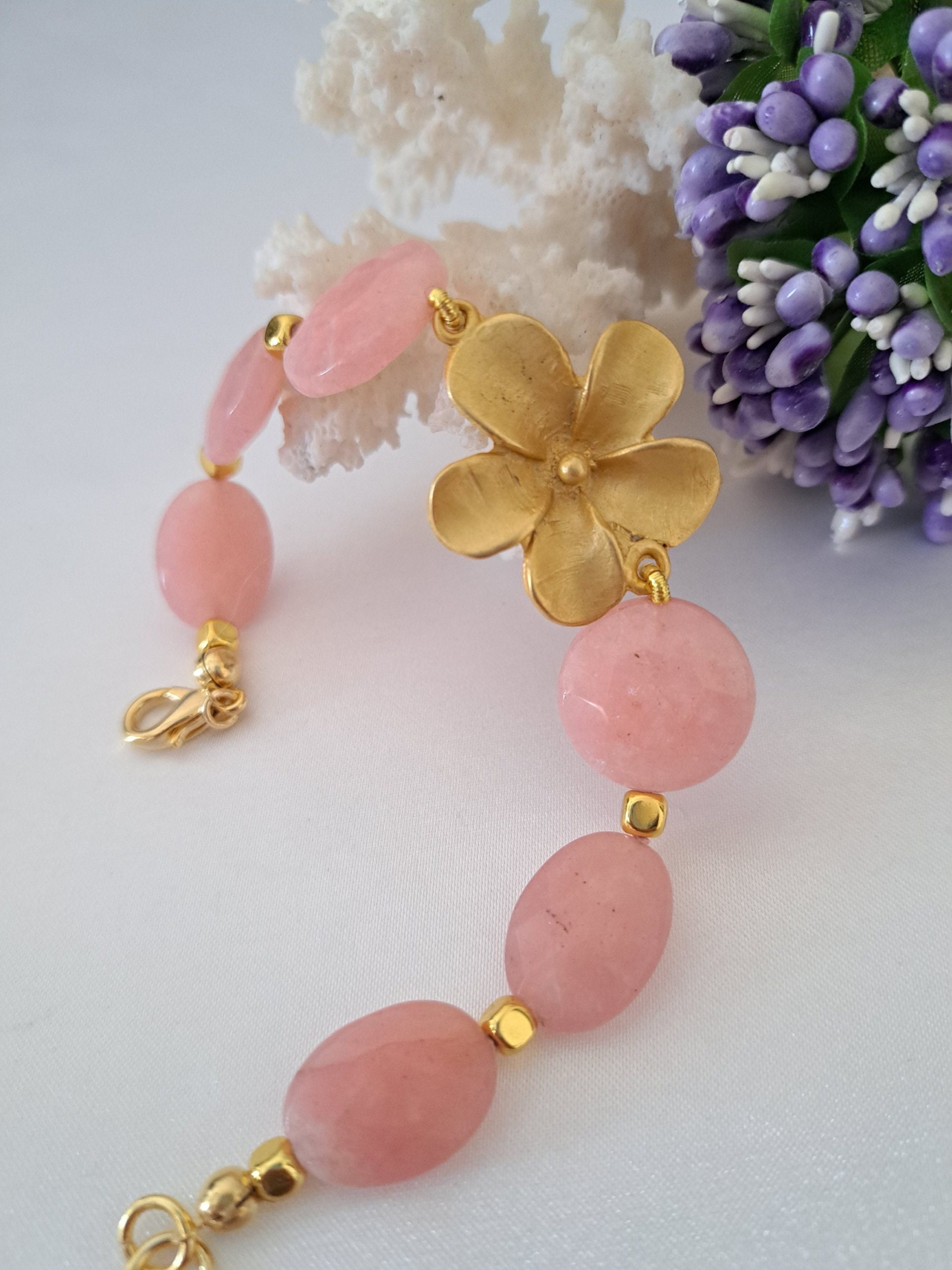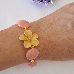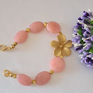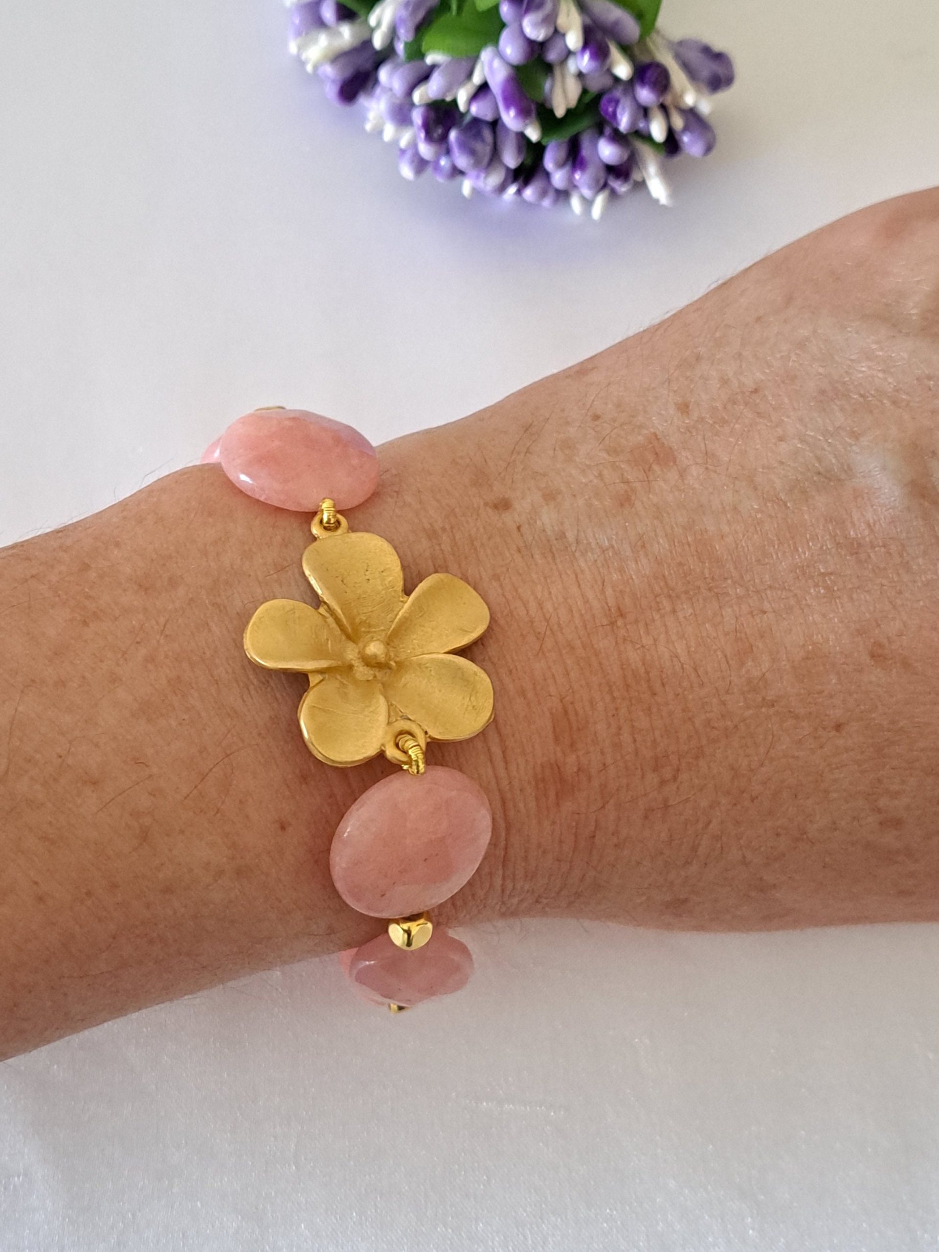 Bracciale pietre dure angelite rosa con fiore ottone dorato
