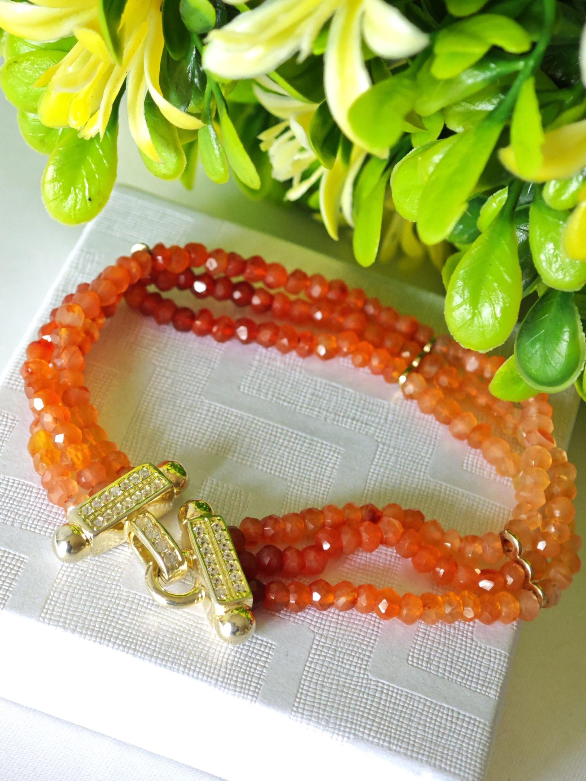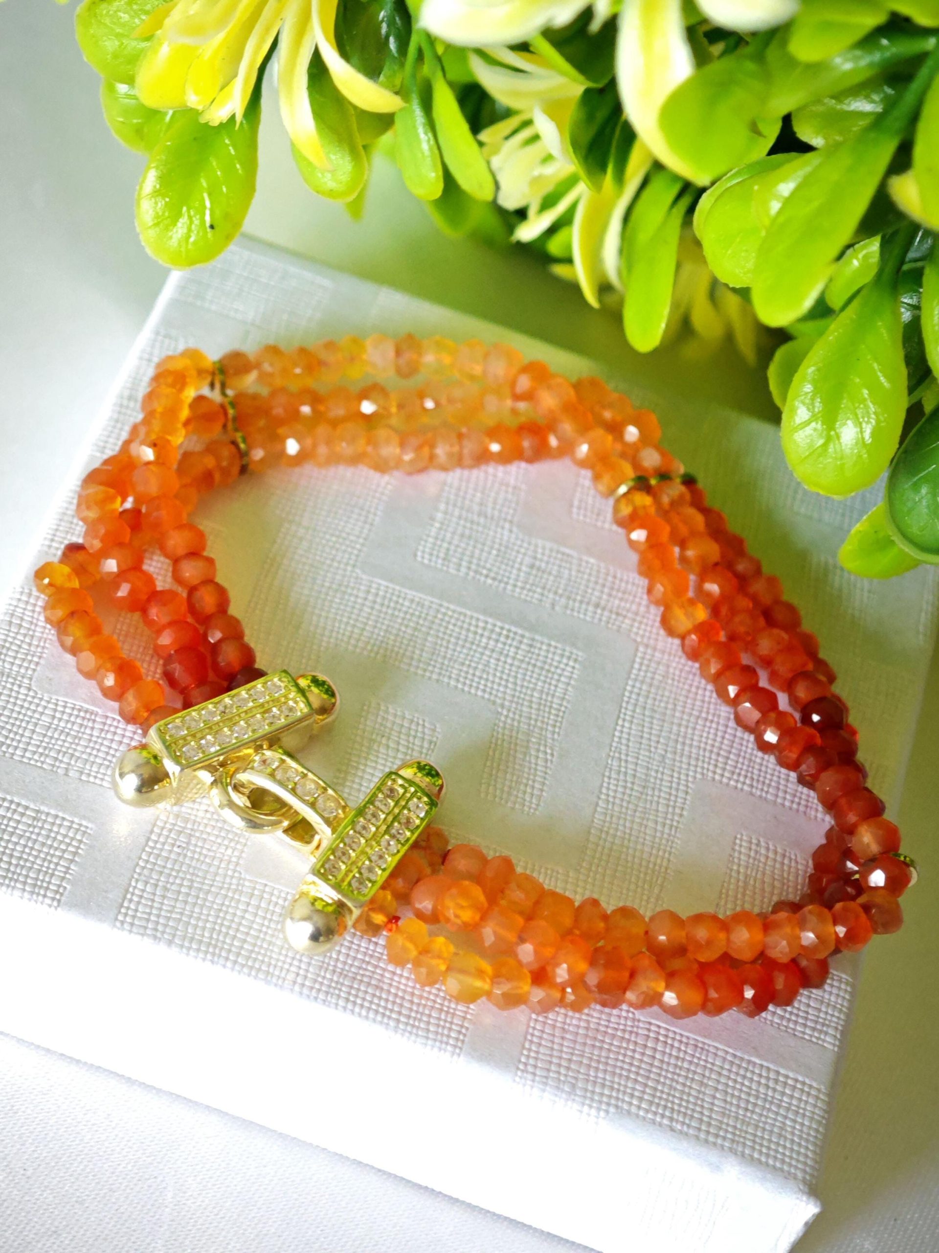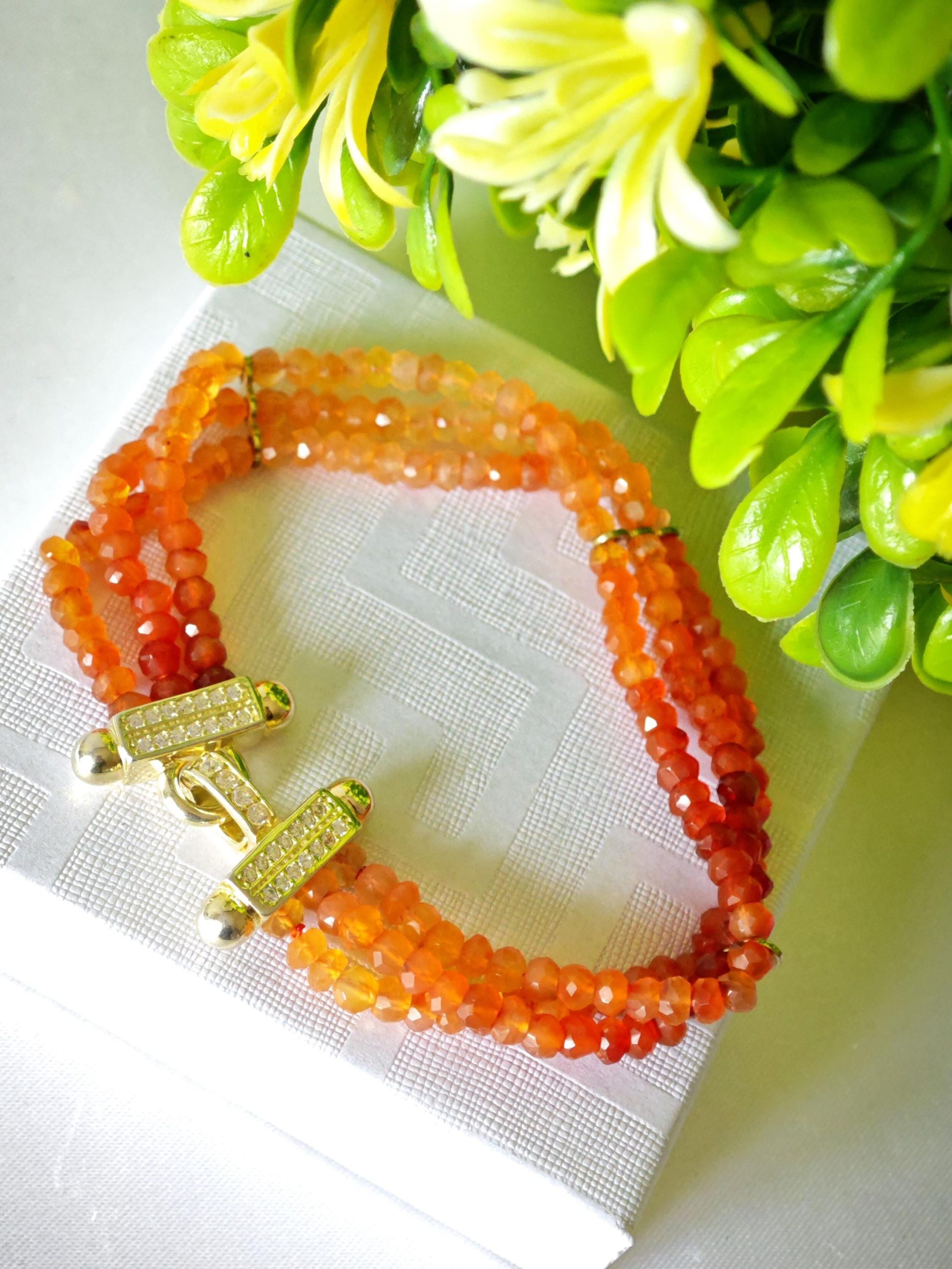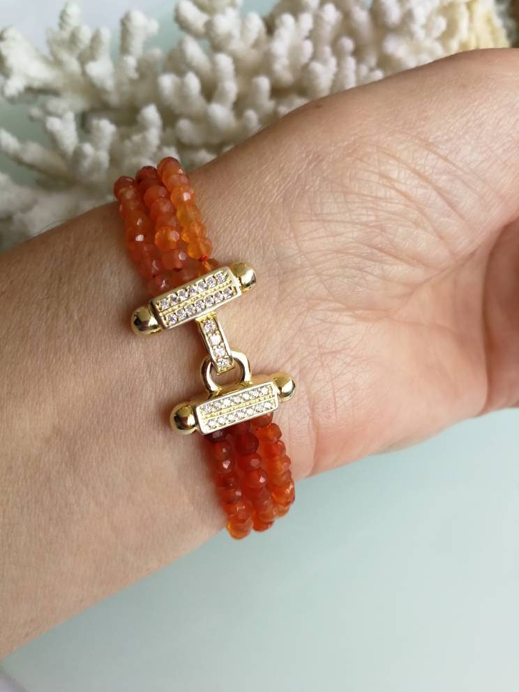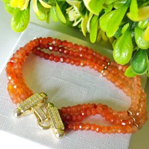 Bracciale a 3 fili con pietre dure corniola naturali non trattati montate a gradazione di colore e chiusura a clip in argento 925 placcato oro con zirconi.