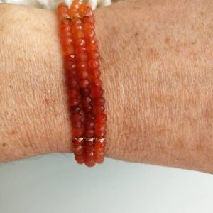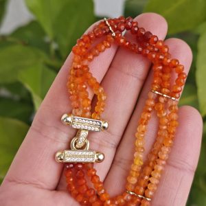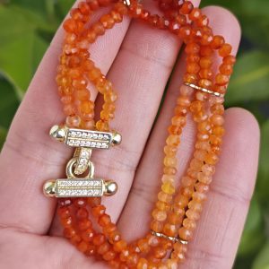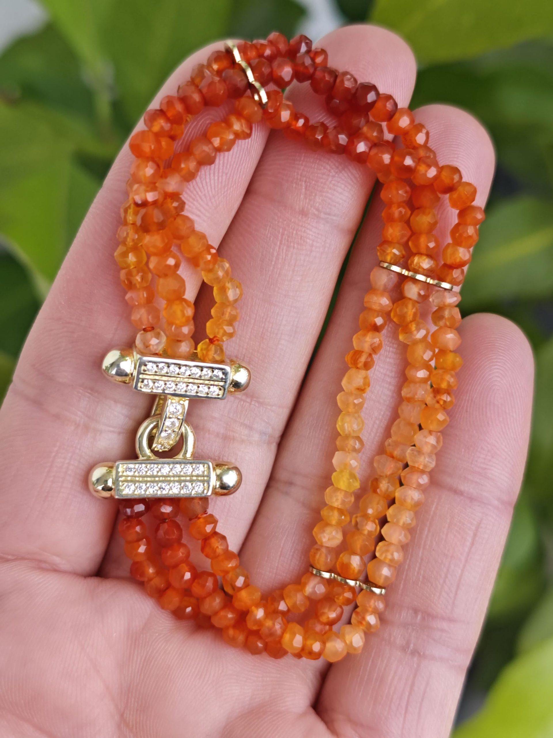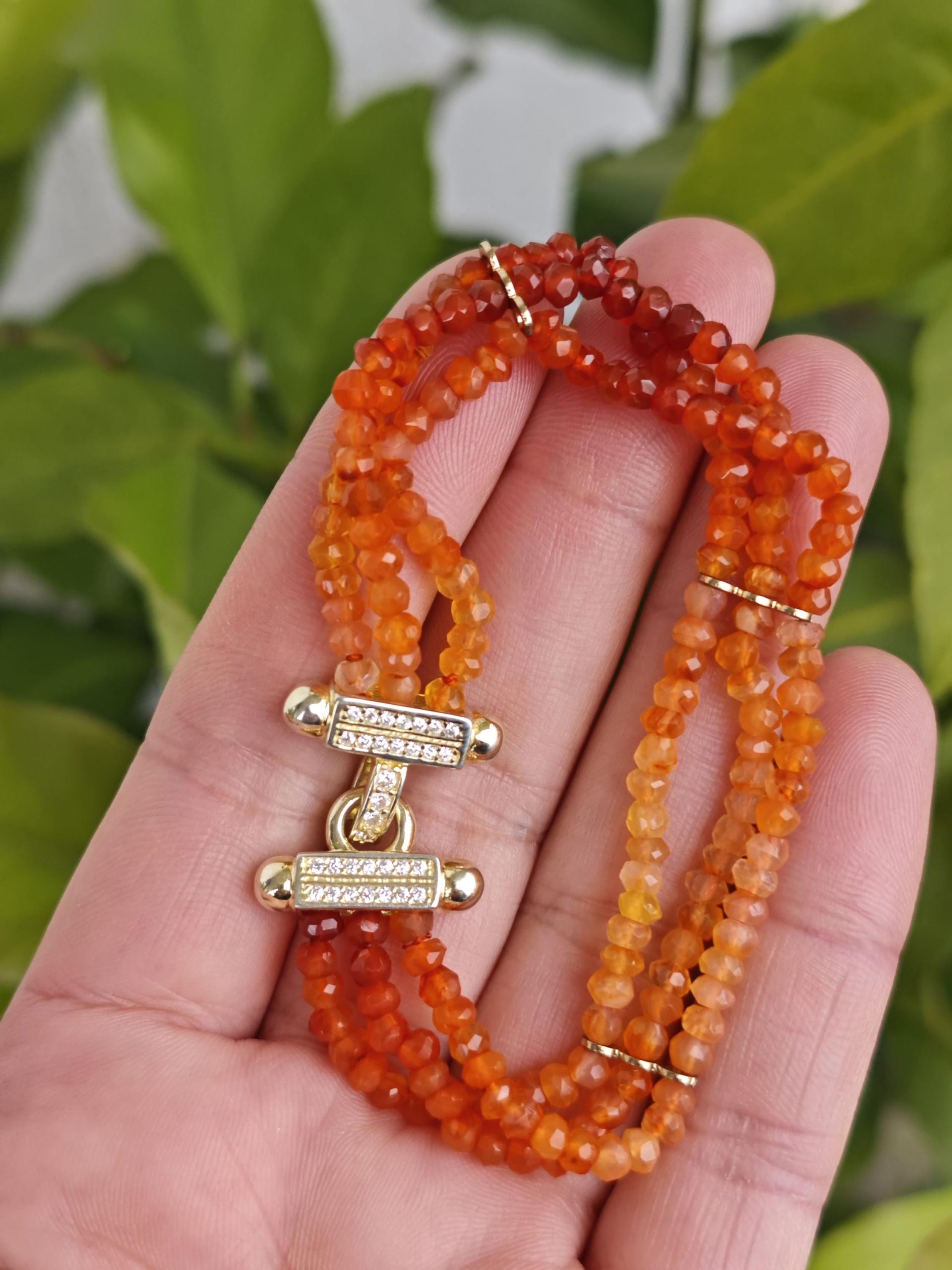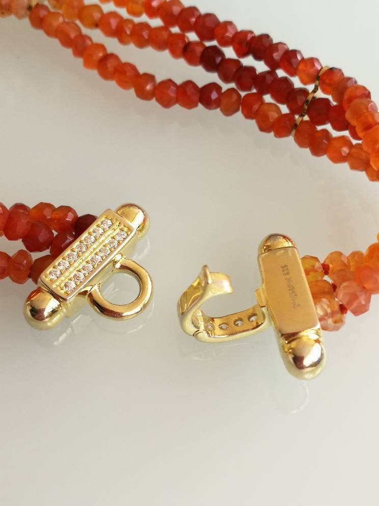 Bracciale a 3 fili con pietre dure corniola naturali non trattati montate a gradazione di colore e chiusura a clip in argento 925 placcato oro con zirconi.
