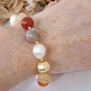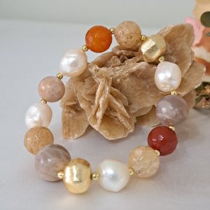 Bracciale elastico realizzato a mano con pietre dure corniola ,perle barocche bianche, pietra di luna e quarzo citrino e con perle metallo dorate smerigliate.