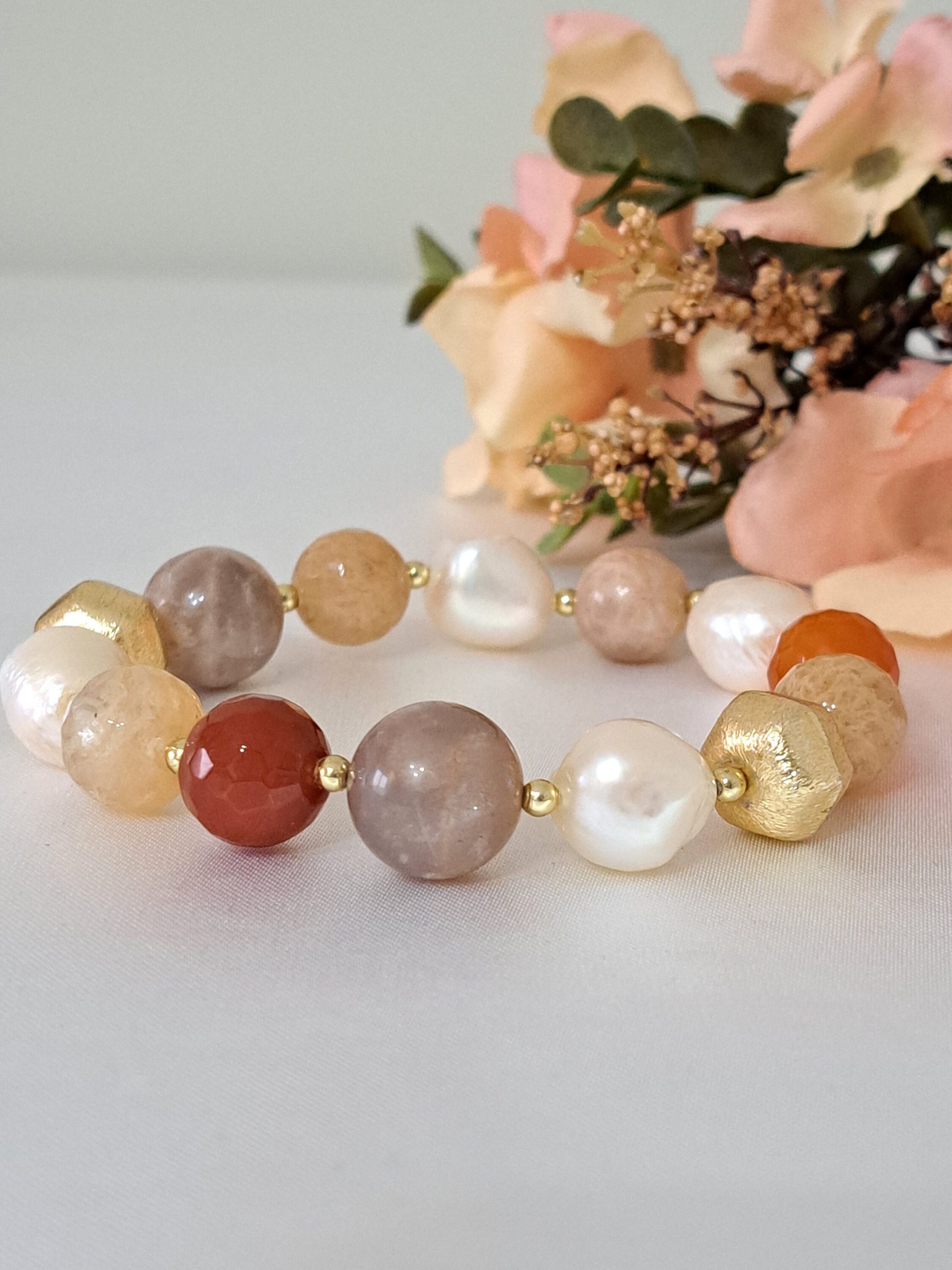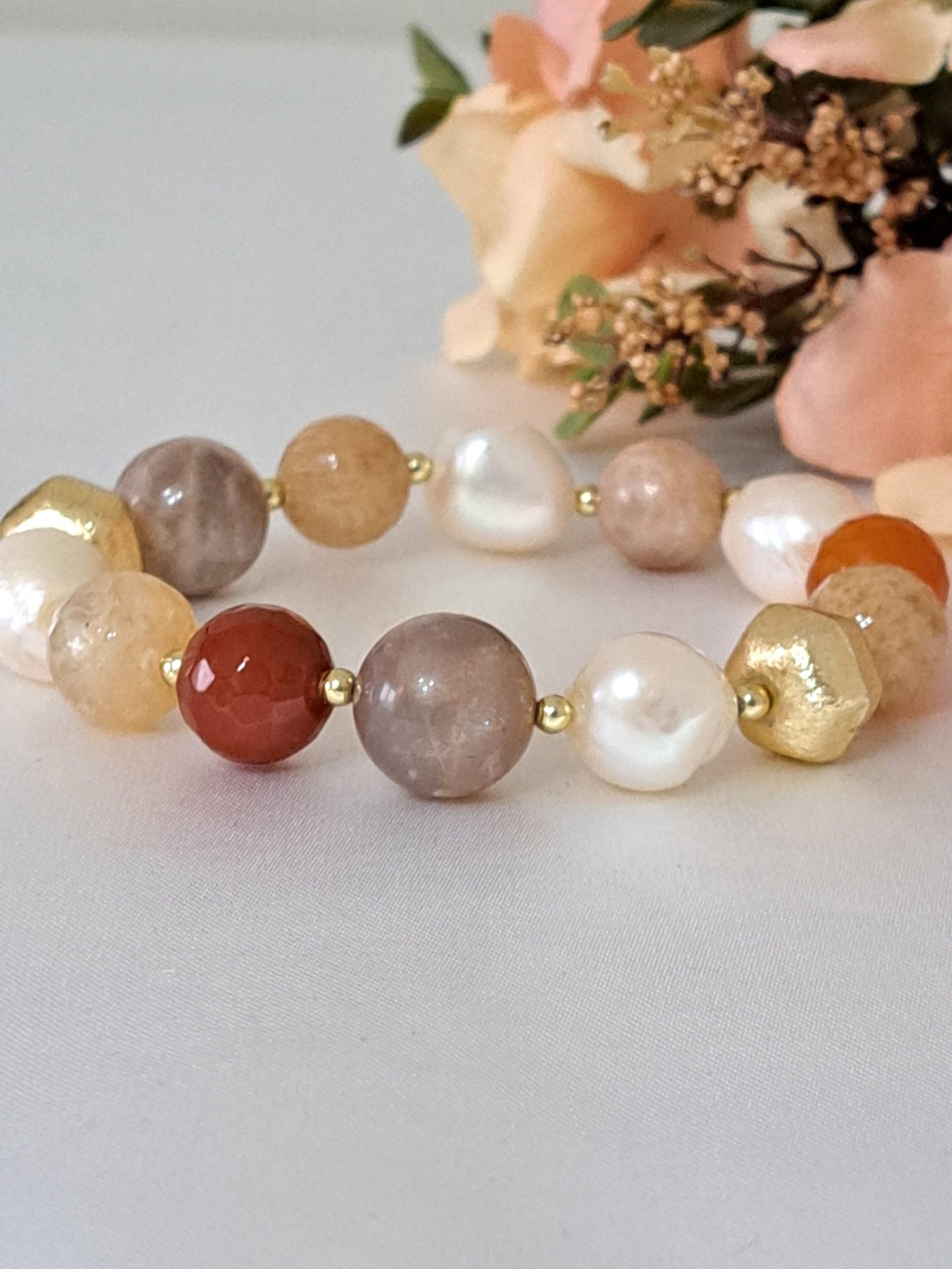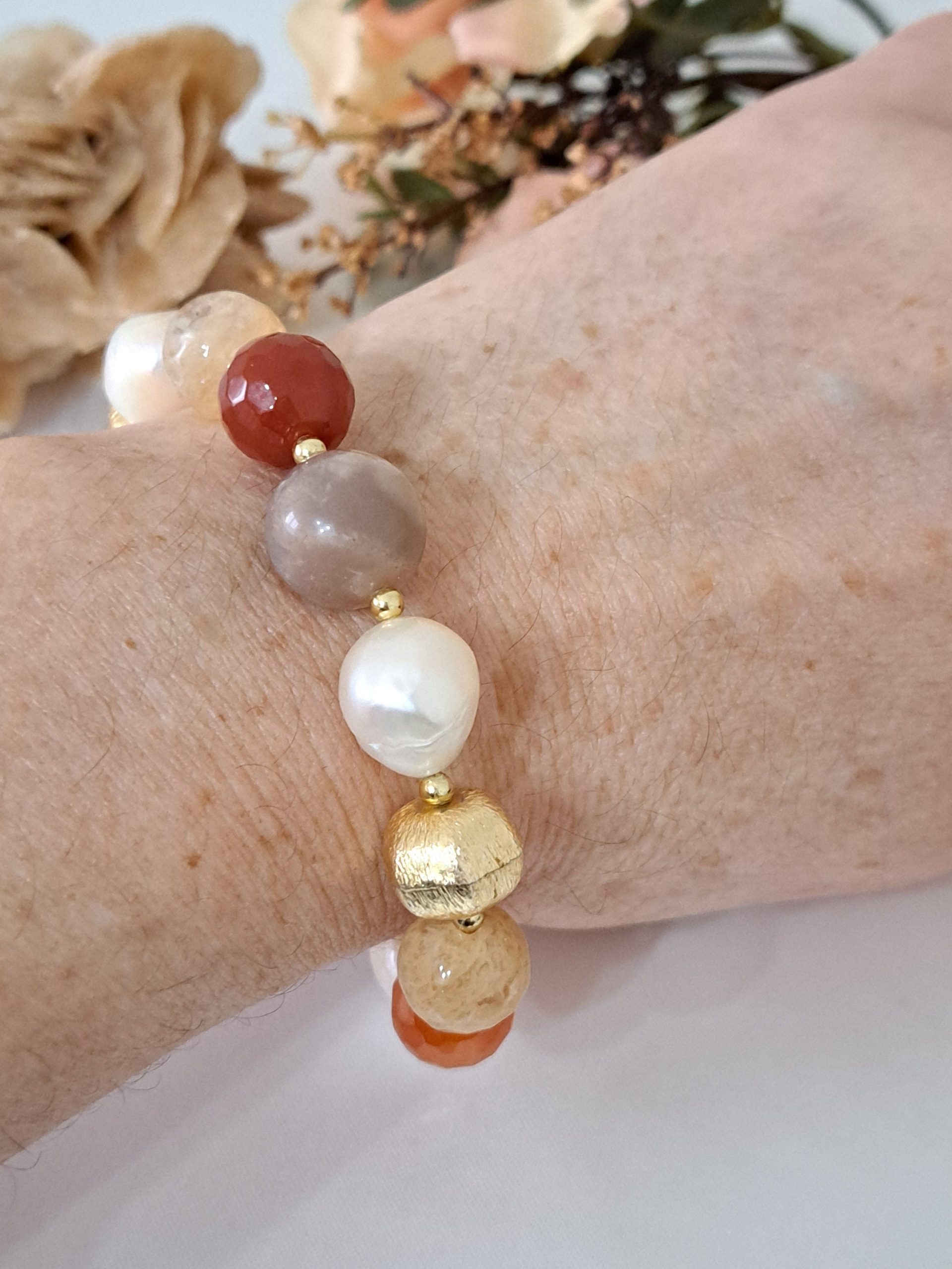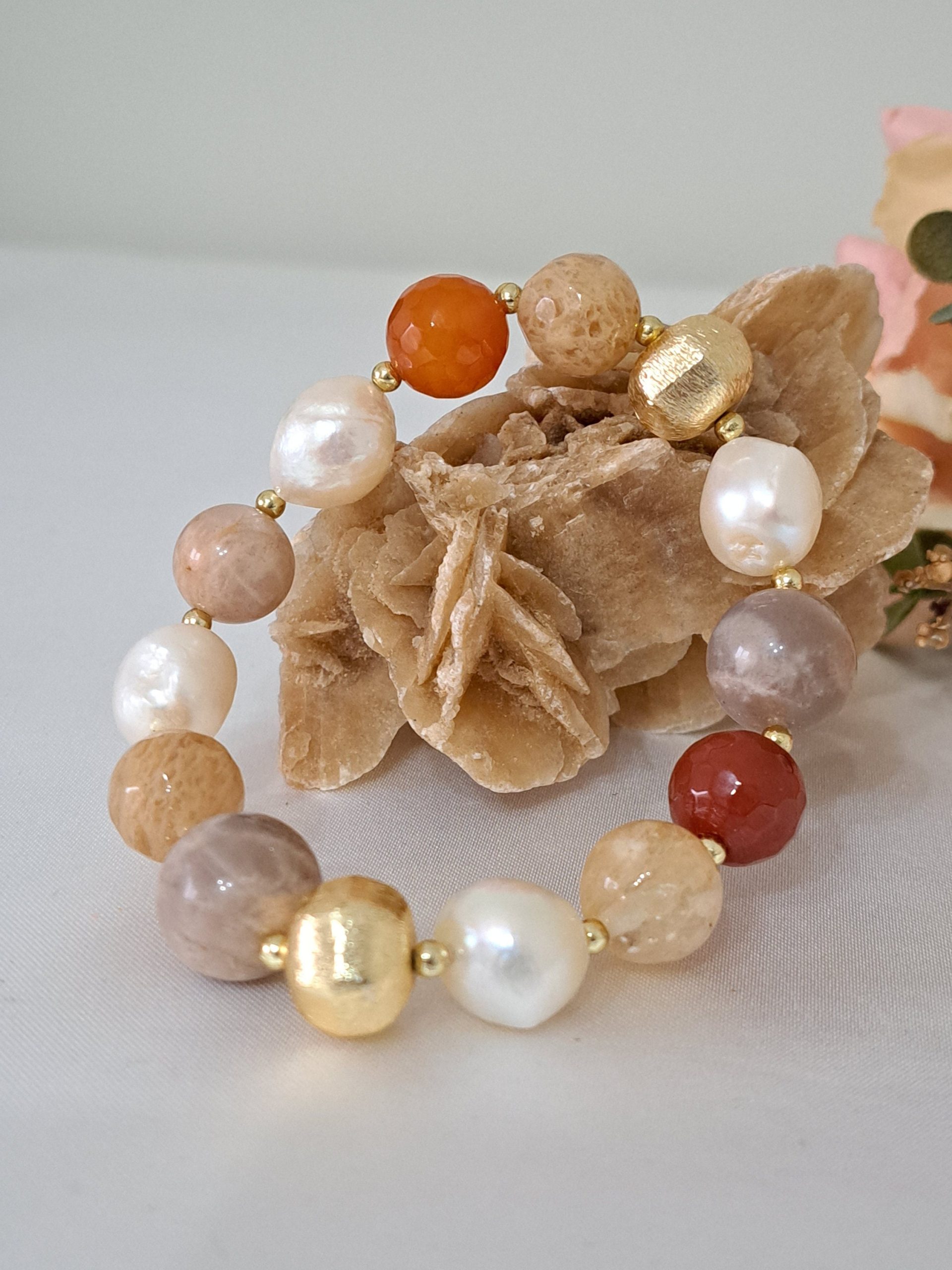 Bracciale pietre dure corniola,perle bianche barocche, Petra di luna e quarzo citrino con perle dorate, bracciale maxi