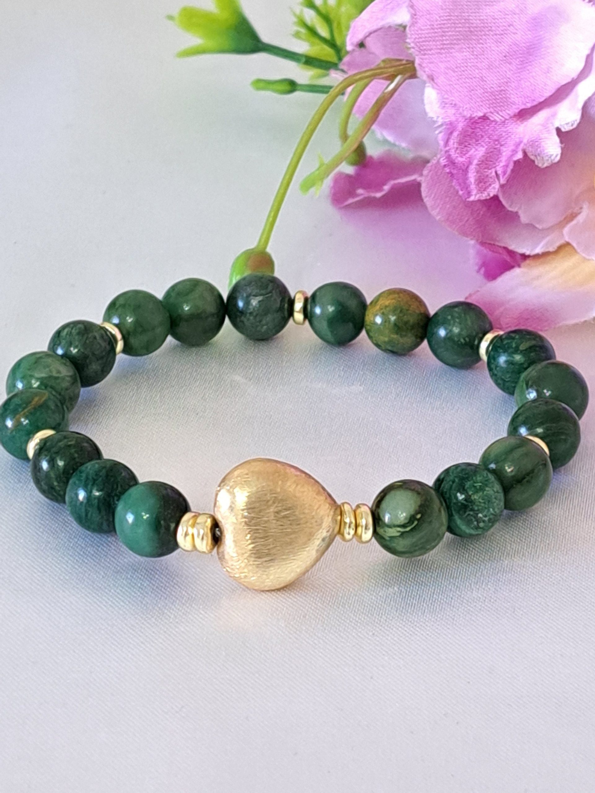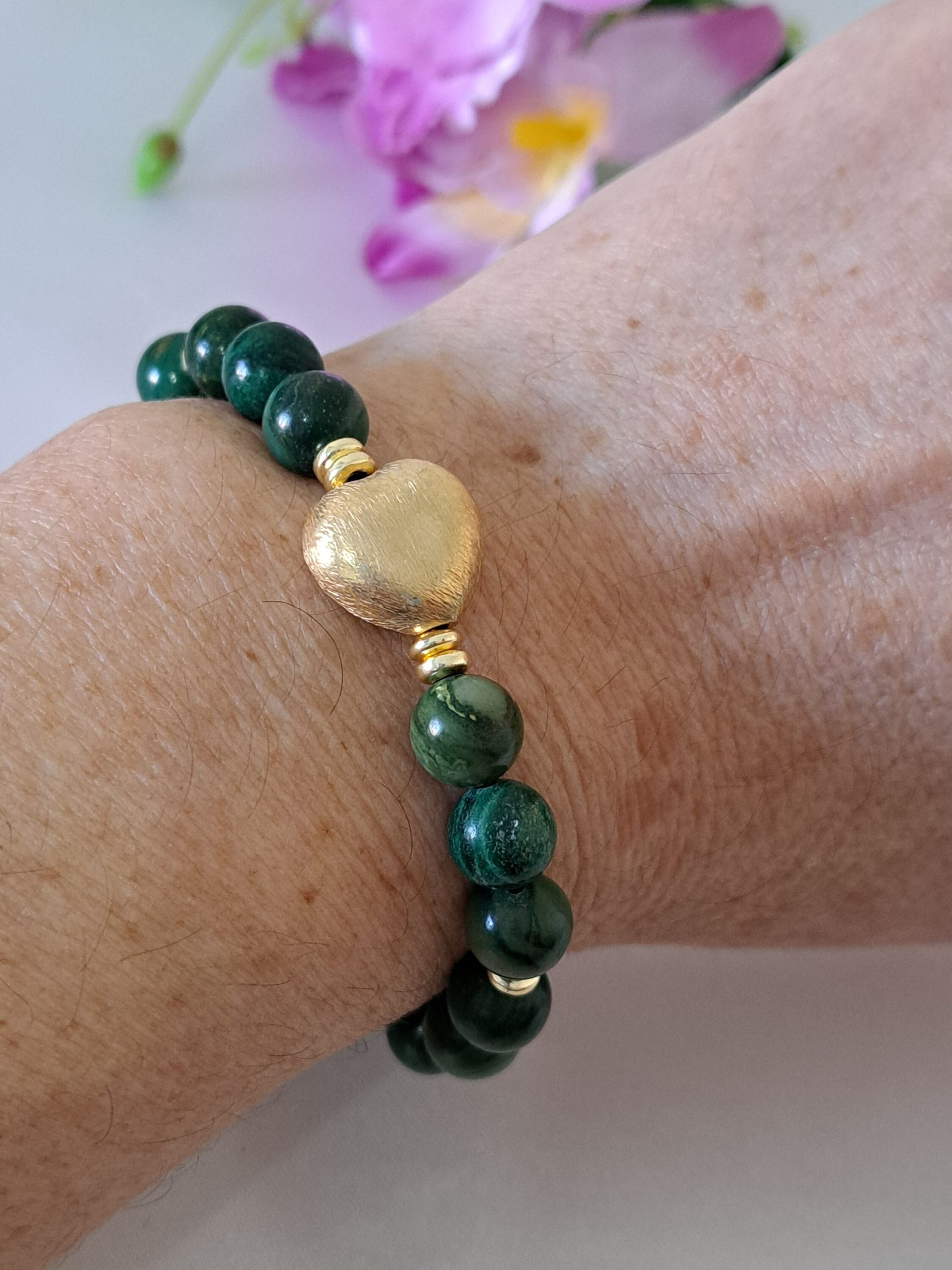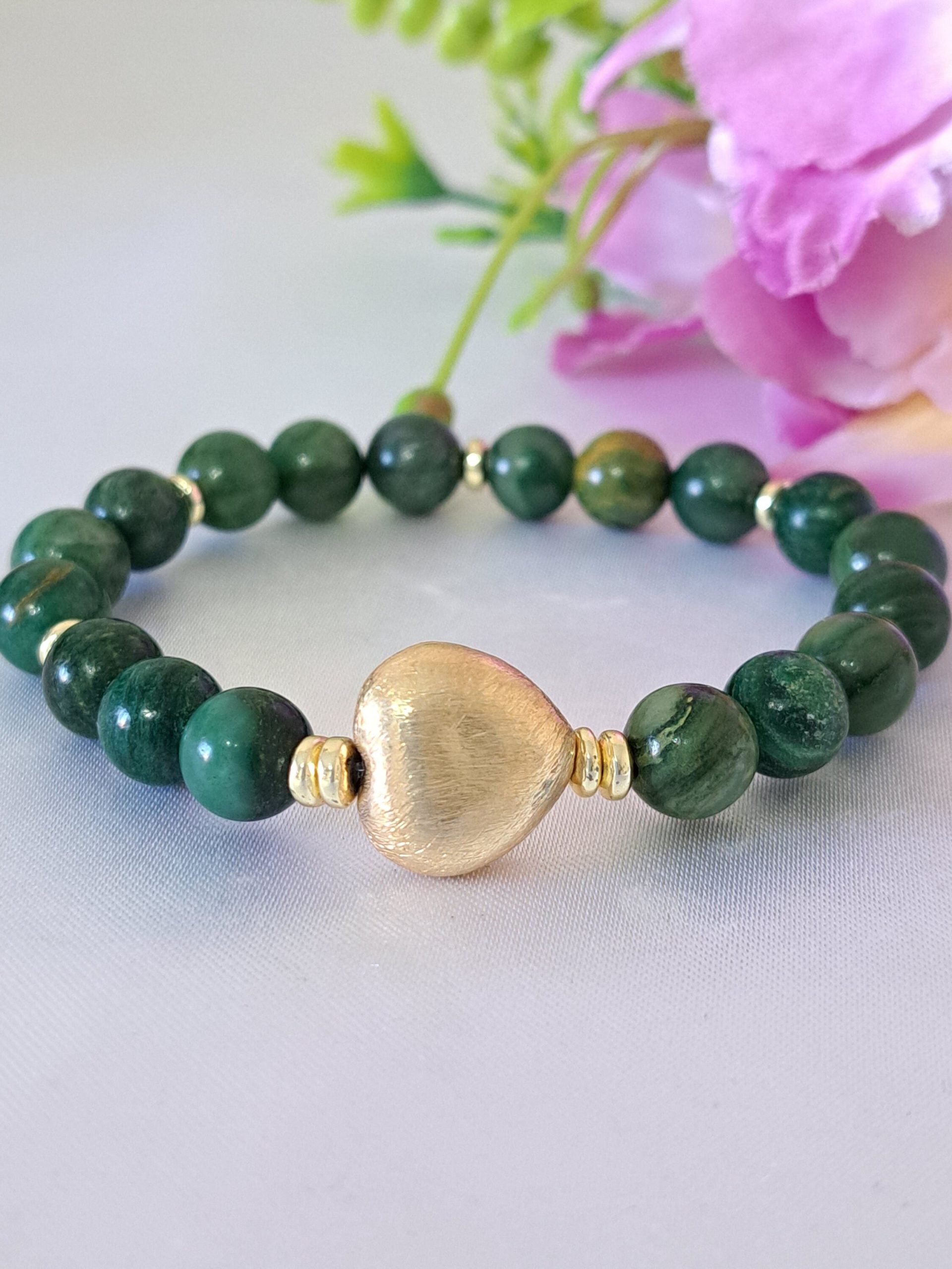 Bracciale elastico realizzato con pietre dure giada africana 8 mm e perla centrale cuore dorata .