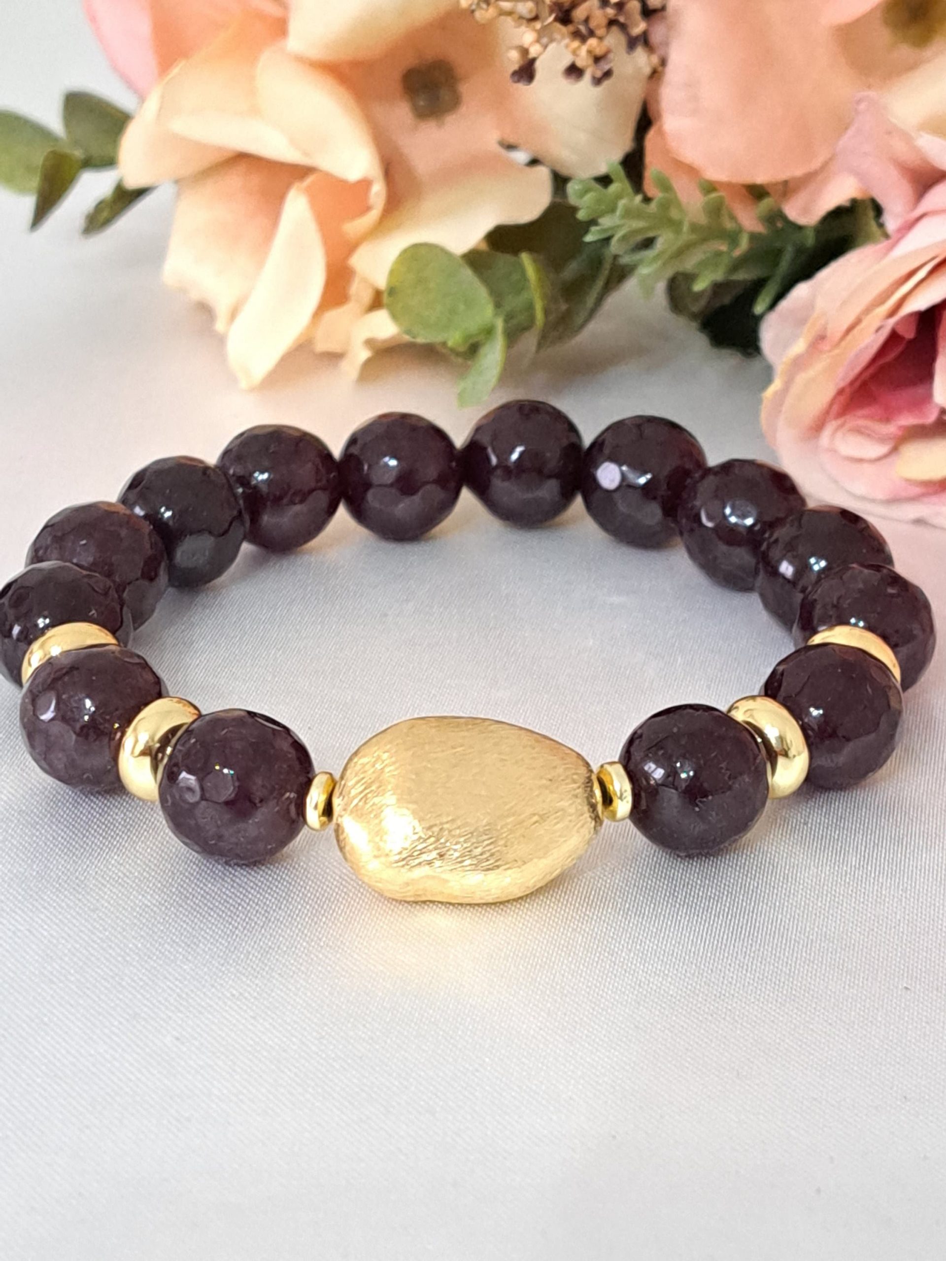 Bracciale elastico realizzato con pietre dure sfaccettate granato 11 mm e perla centrale dorata .