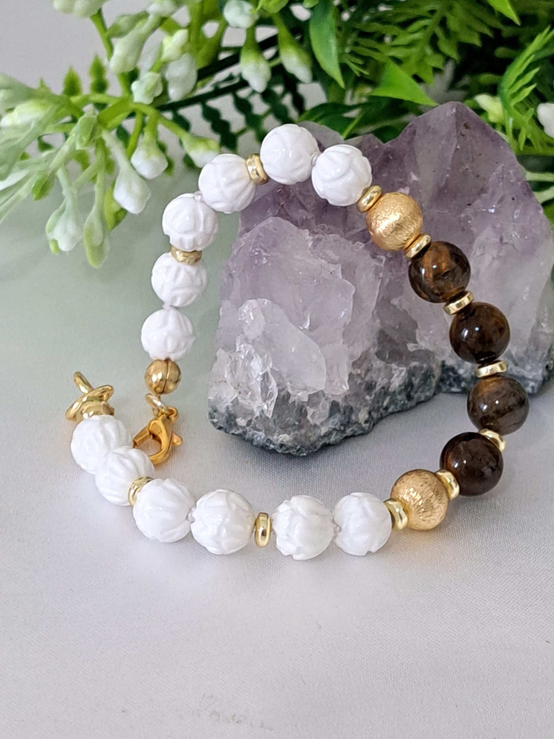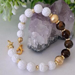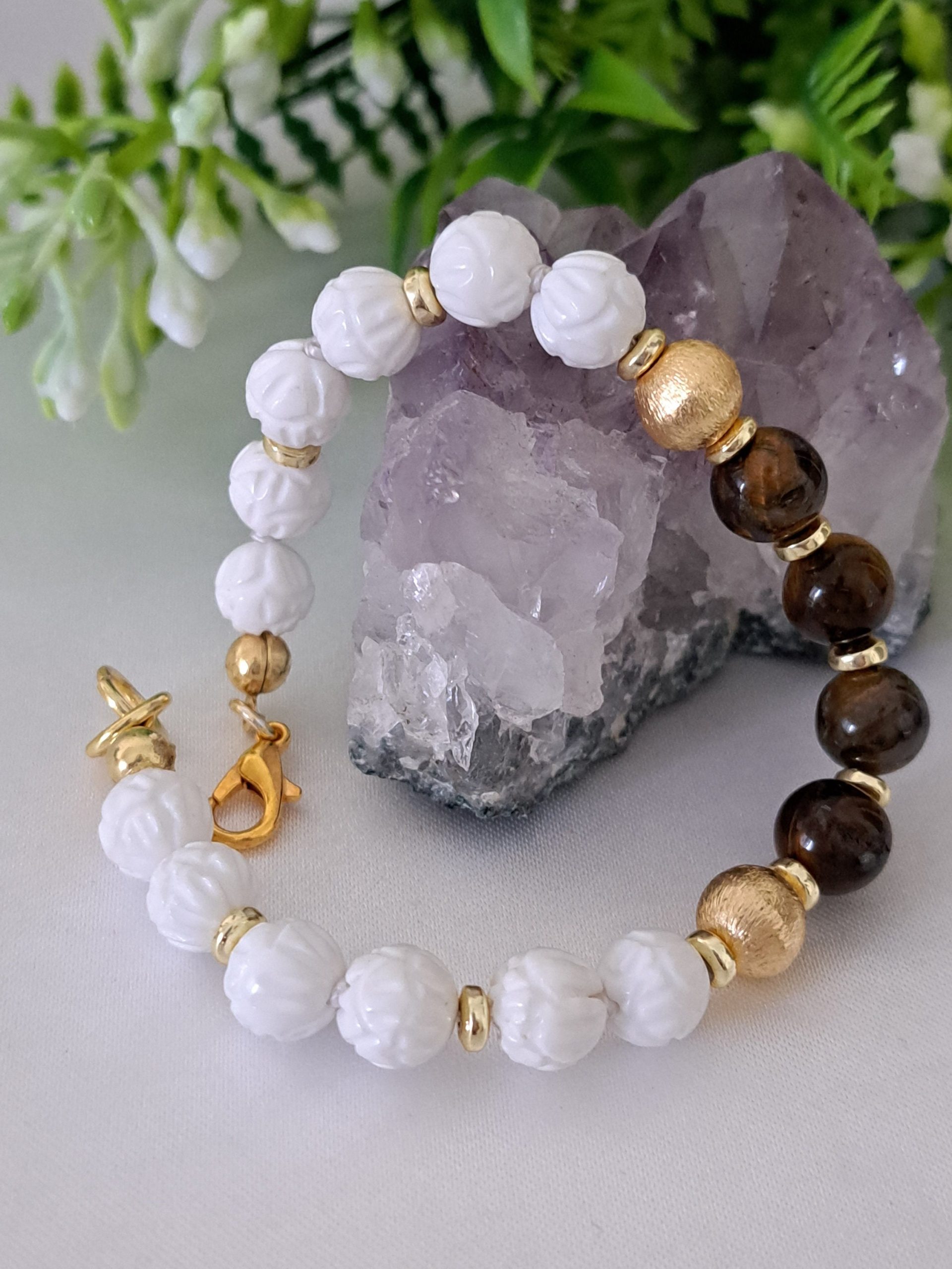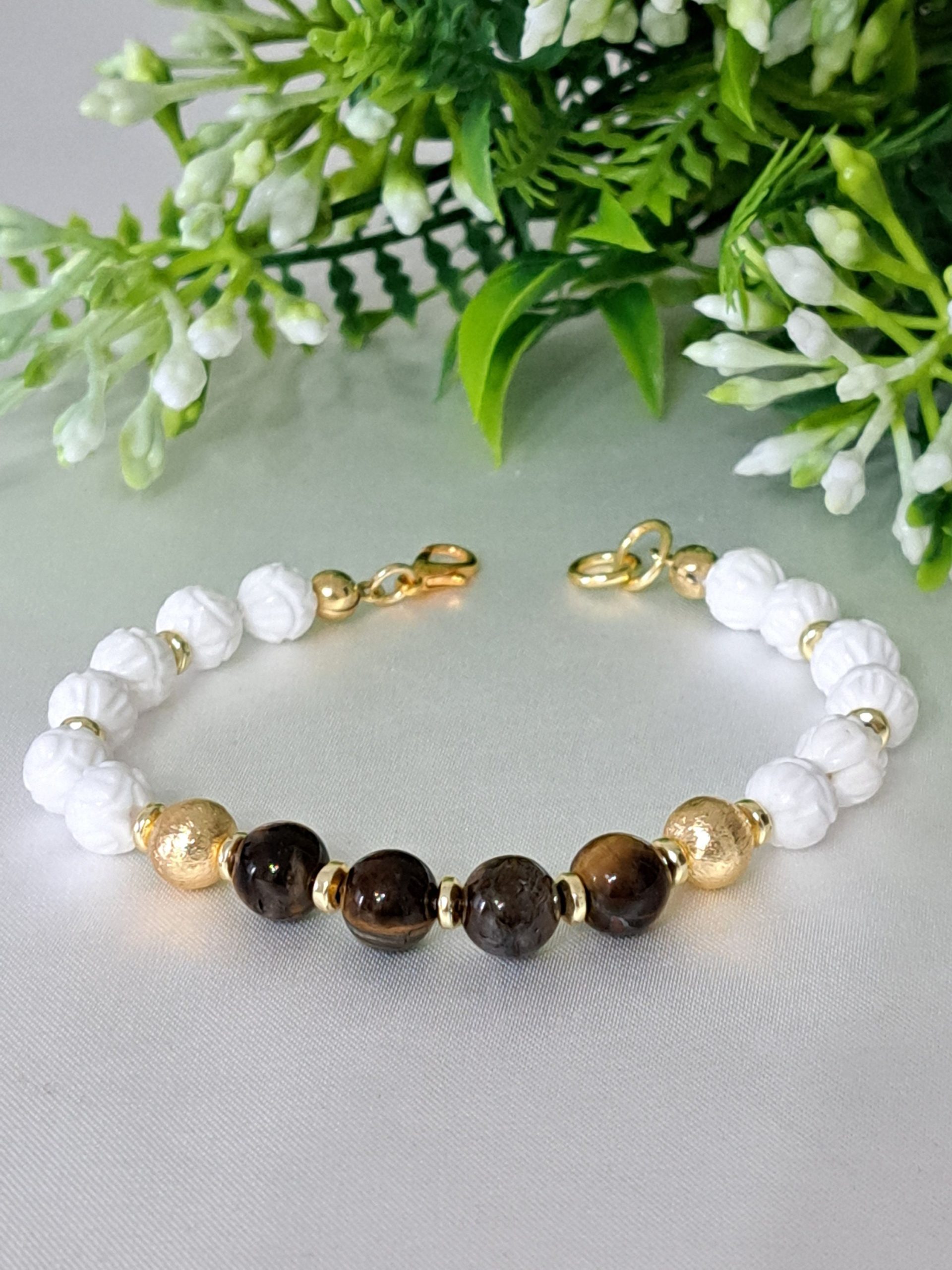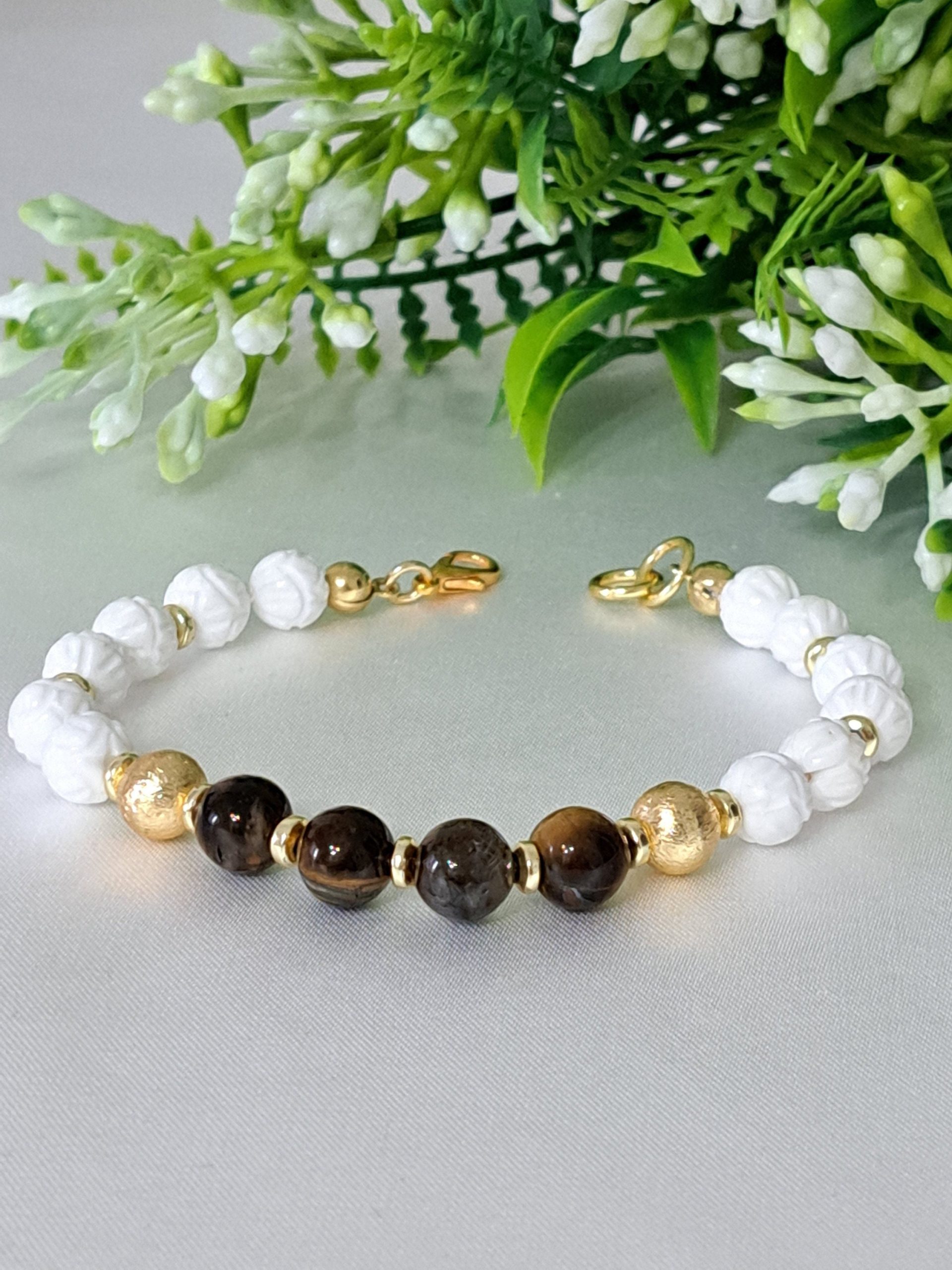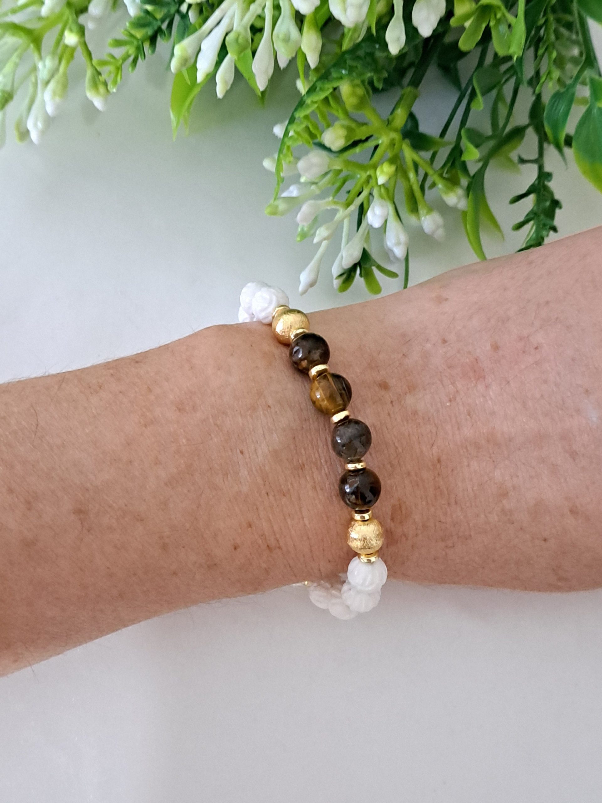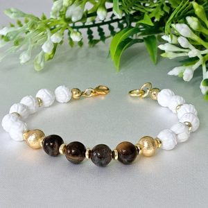 Bracciale realizzato a mano con pietre dure onice bianco intagliato 8 mm diametro, quarzo occhio di tigre e perline ottone dorato smerigliato