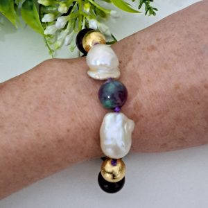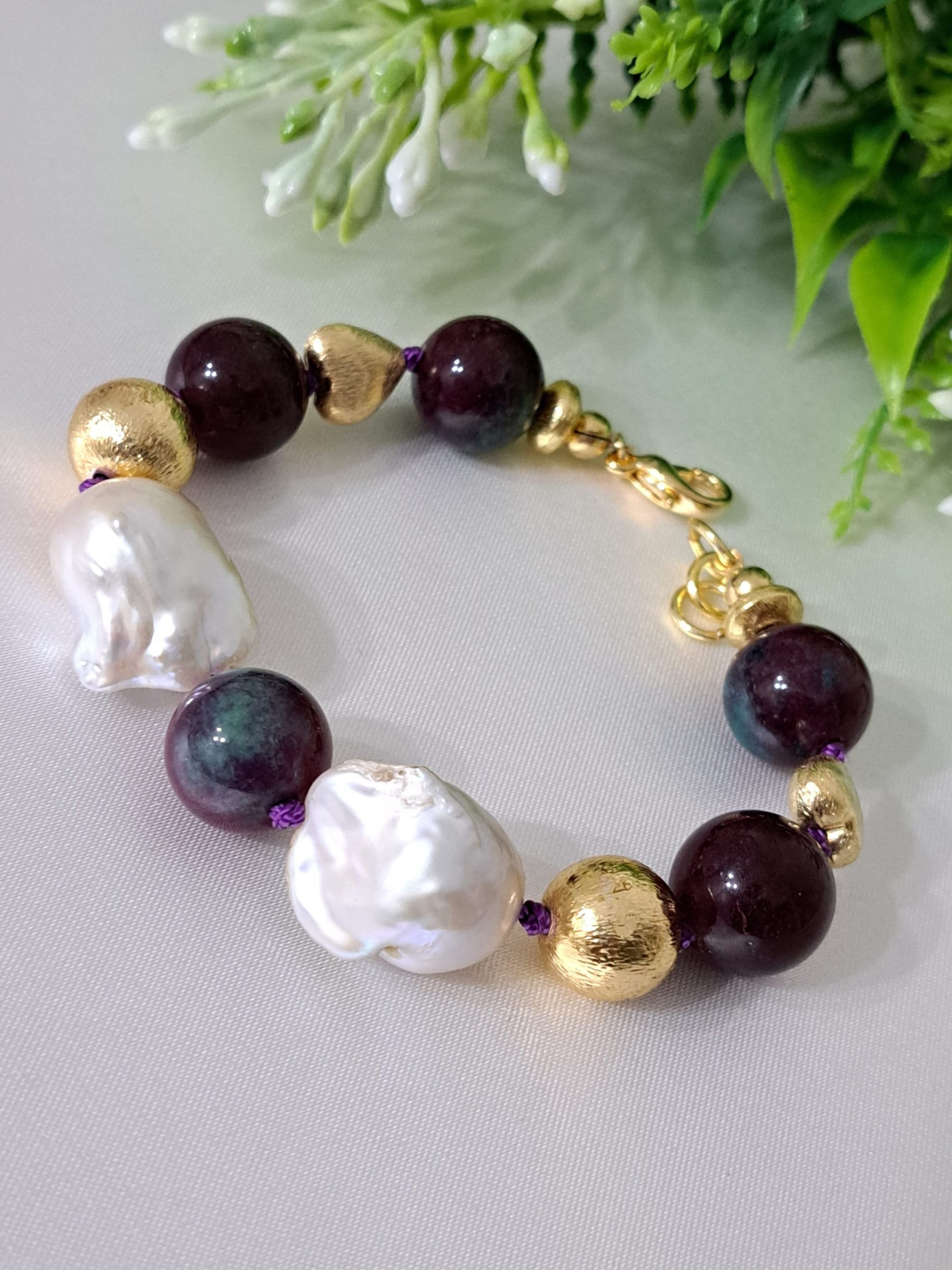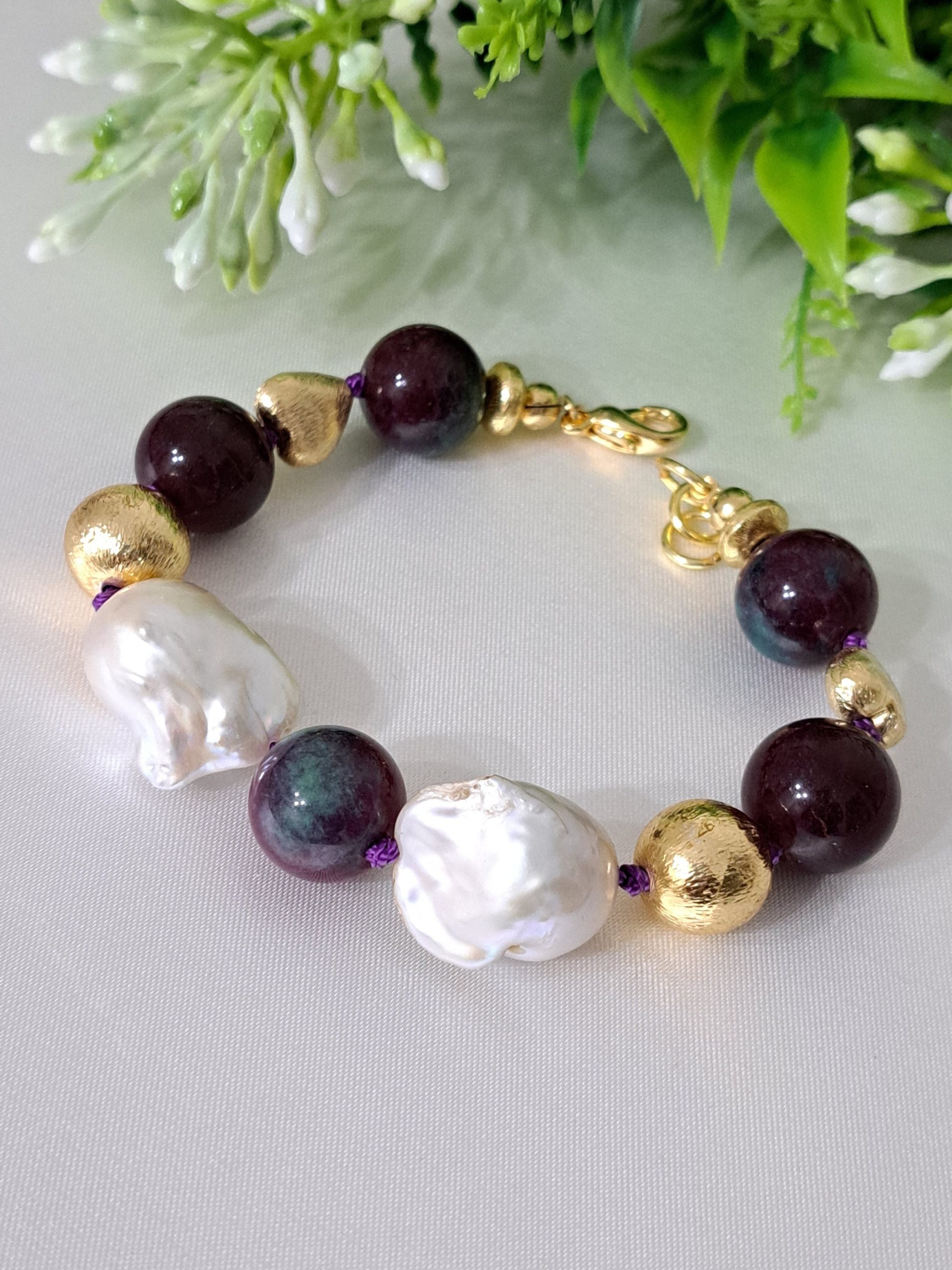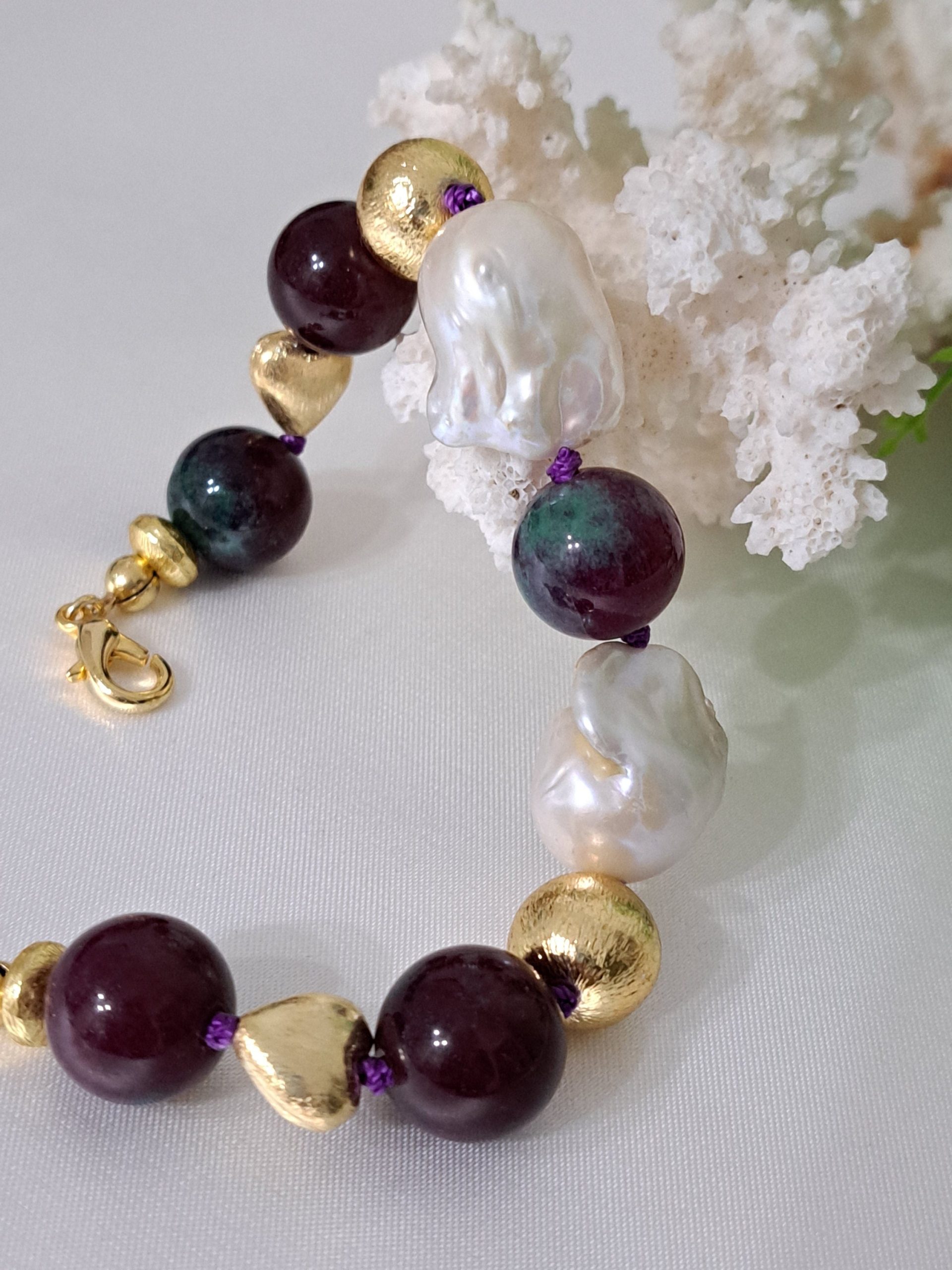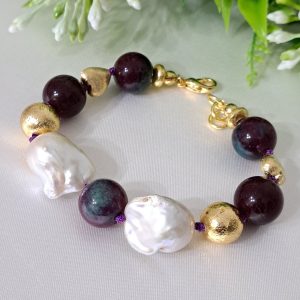 Bracciale pietre dure rubizoisite,perle bianche barocche con perle dorate, bracciale maxi