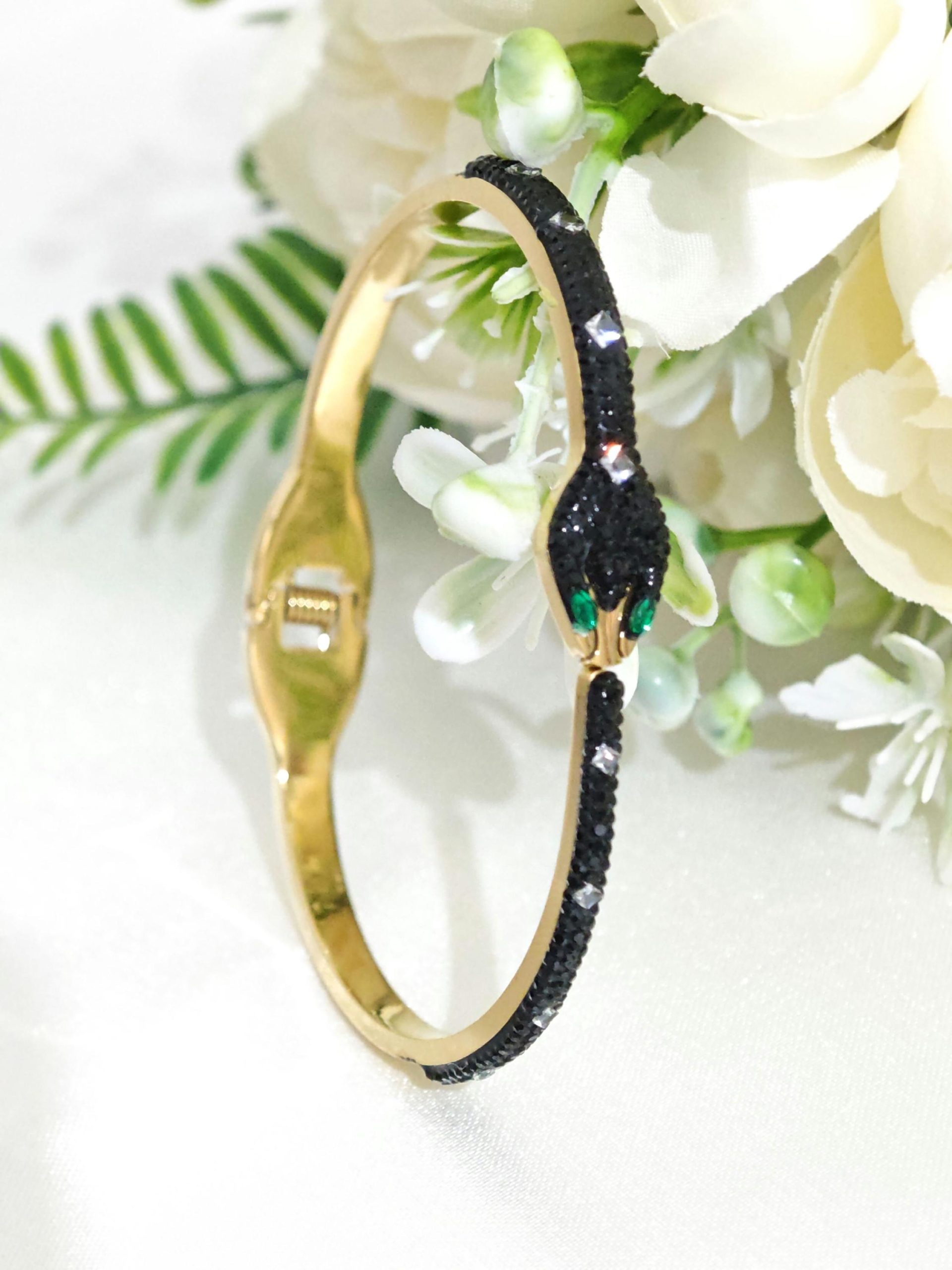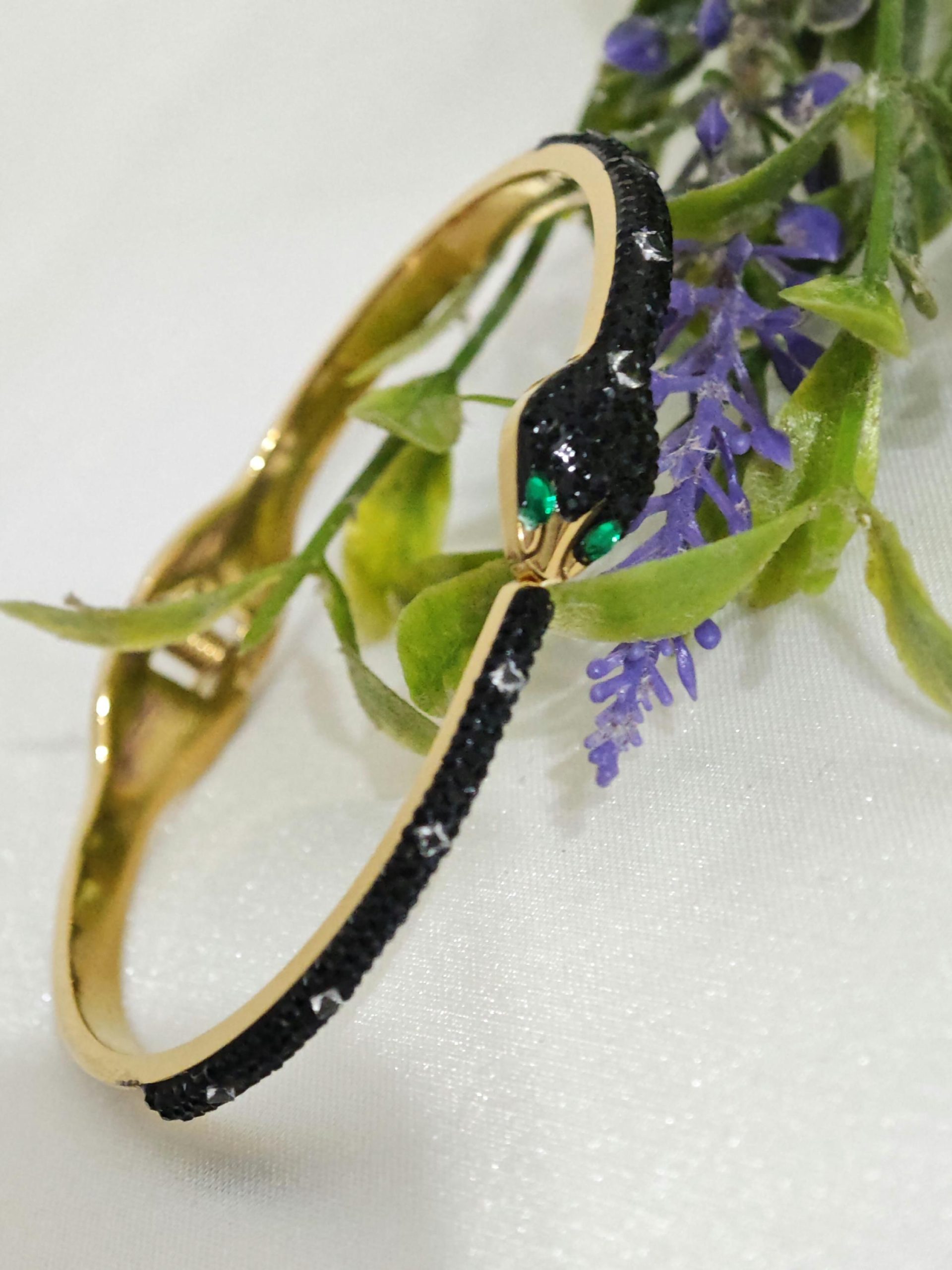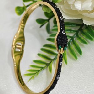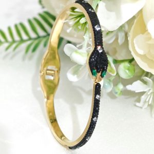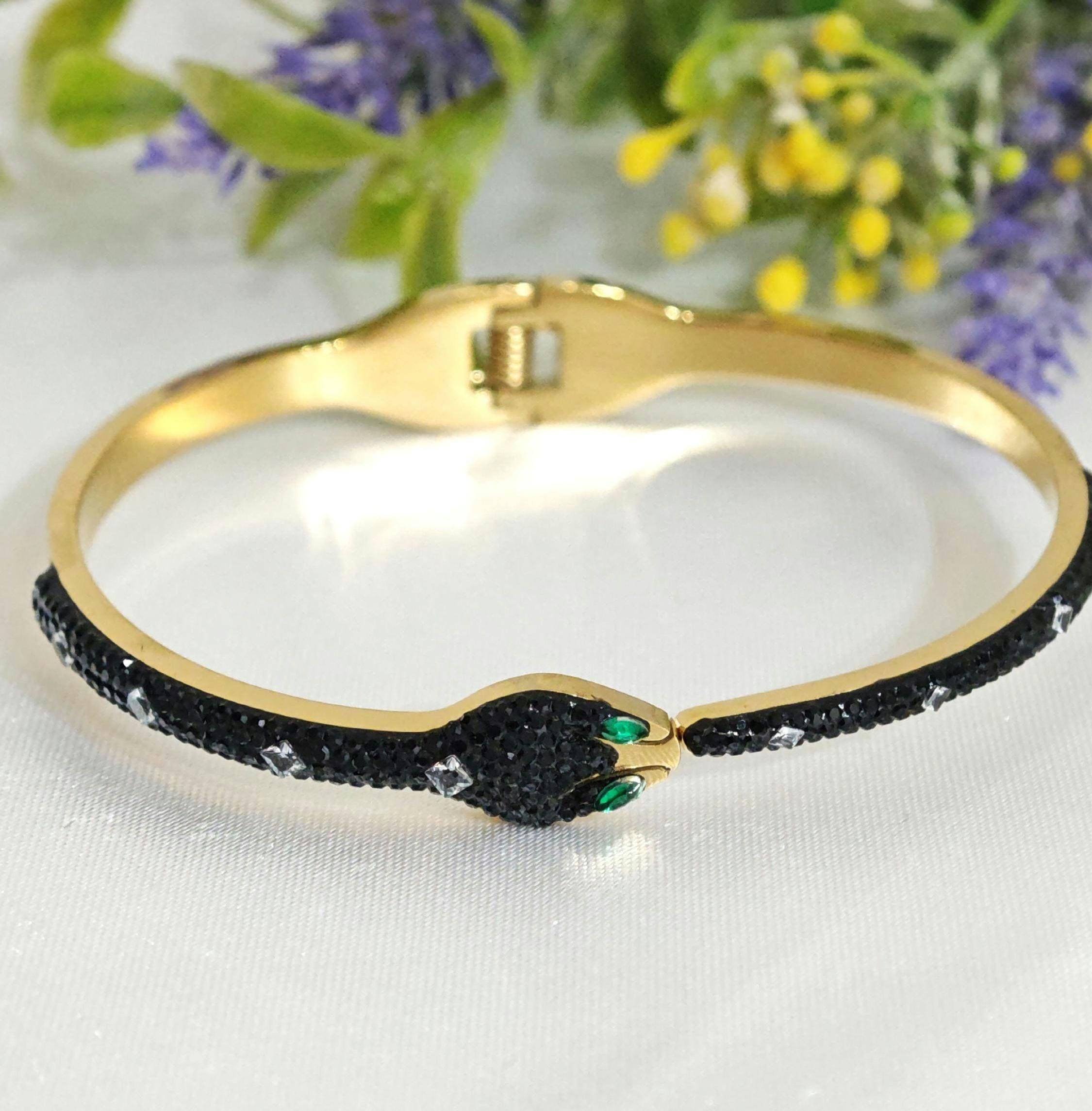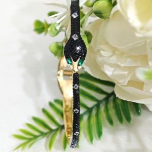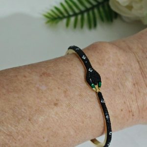 Bracciale rigido a forma di serpente in ottone dorato con cristalli.