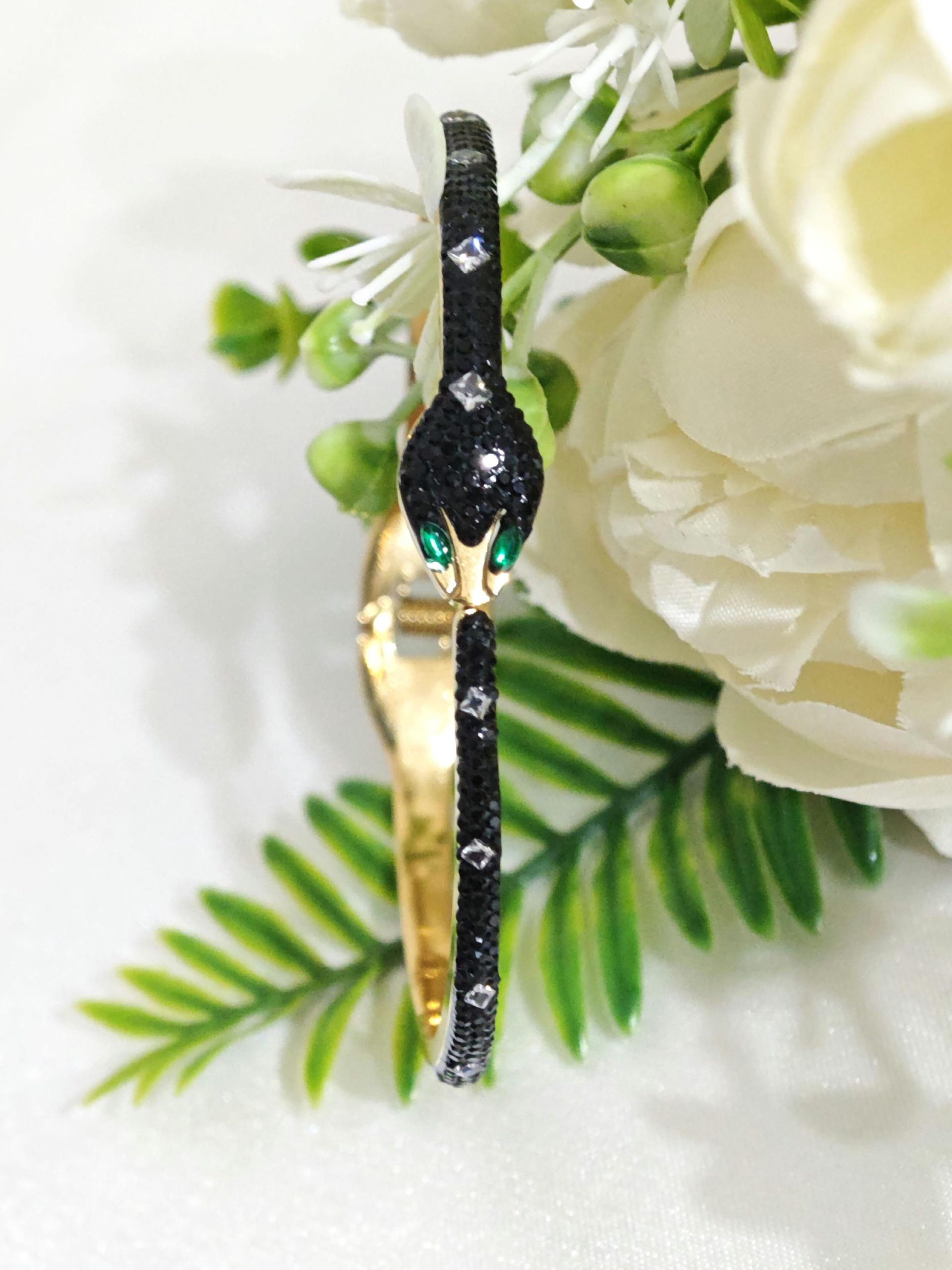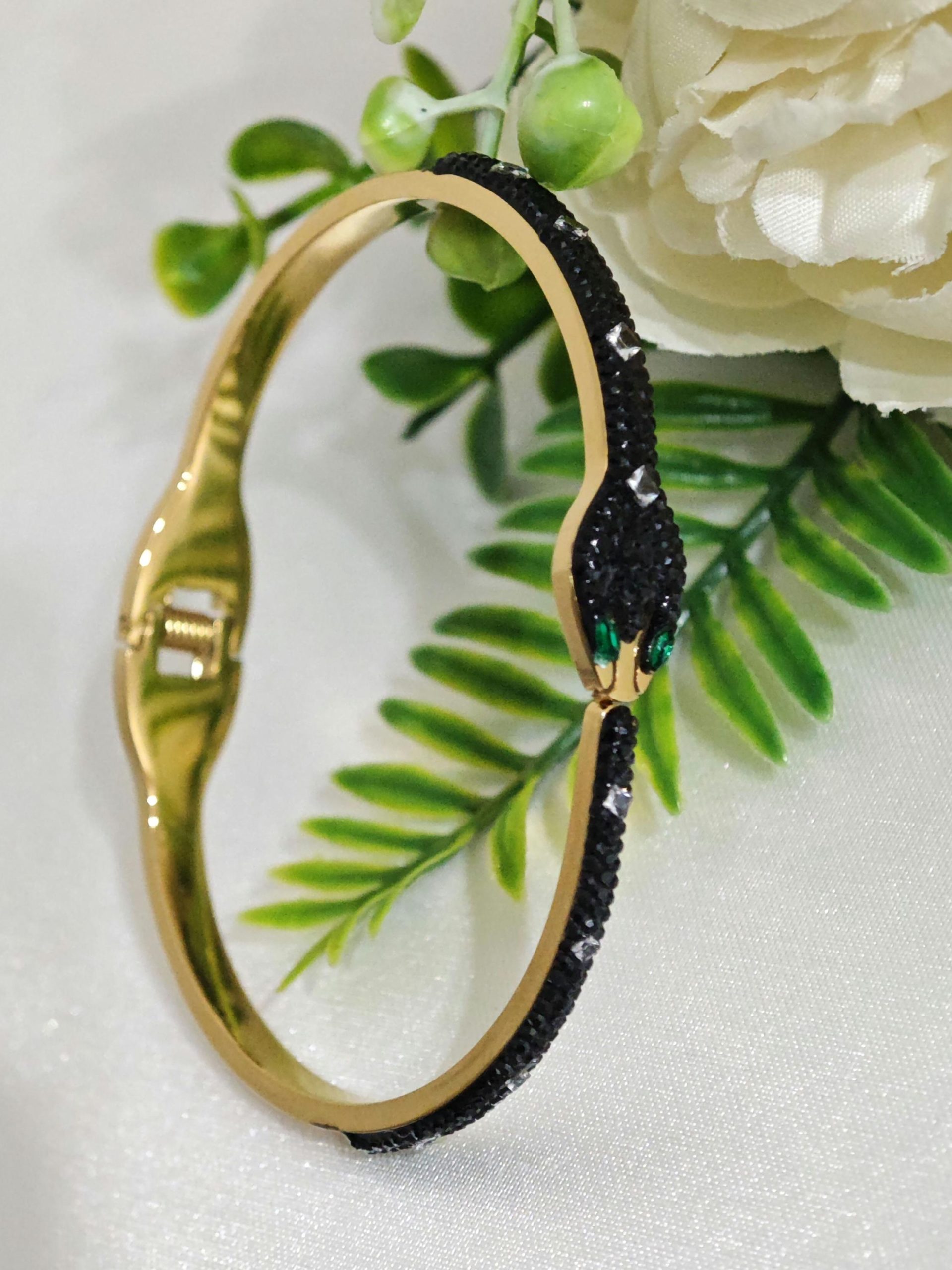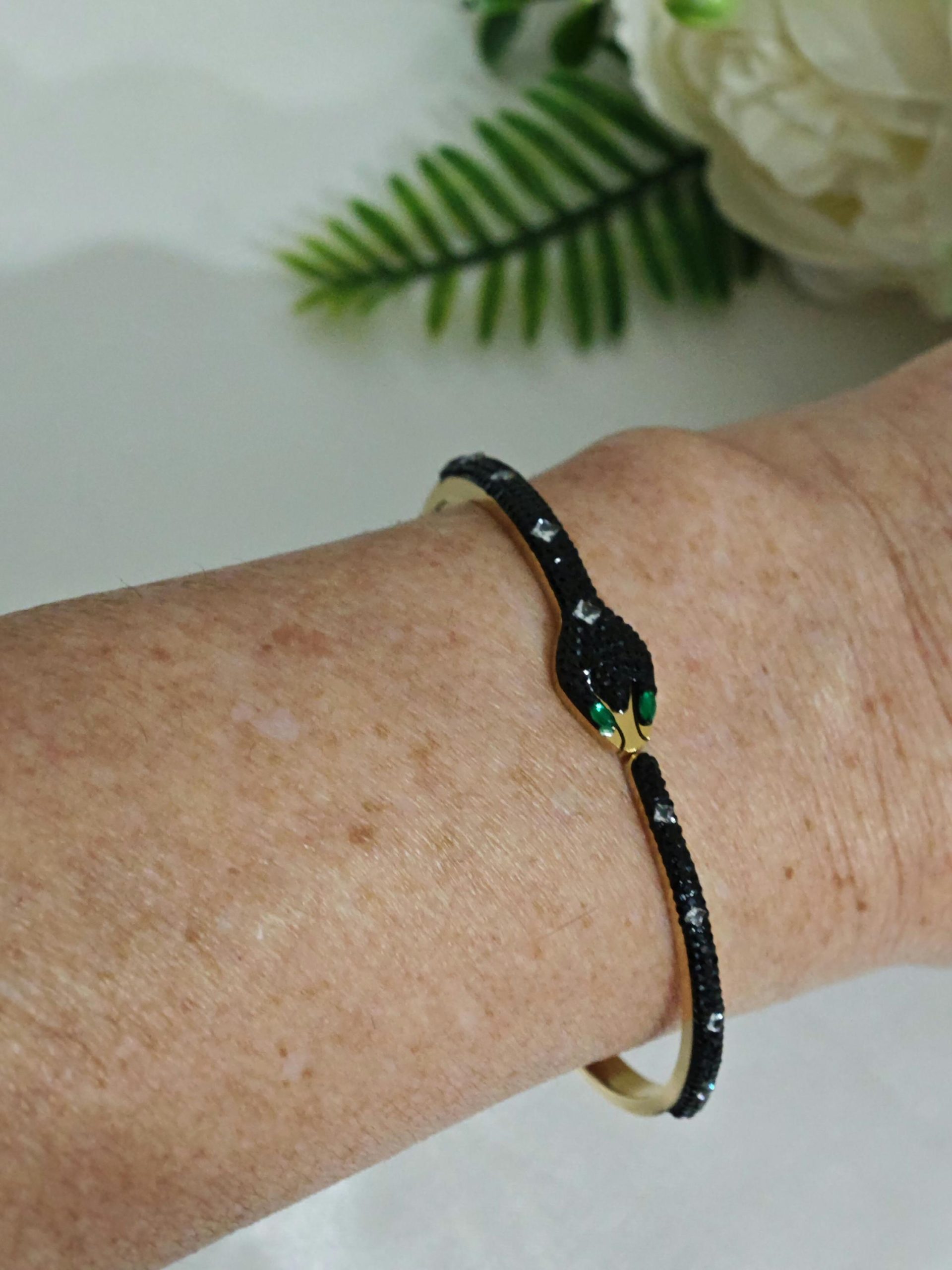 Bracciale rigido a forma di serpente in ottone dorato con cristalli.