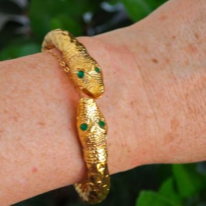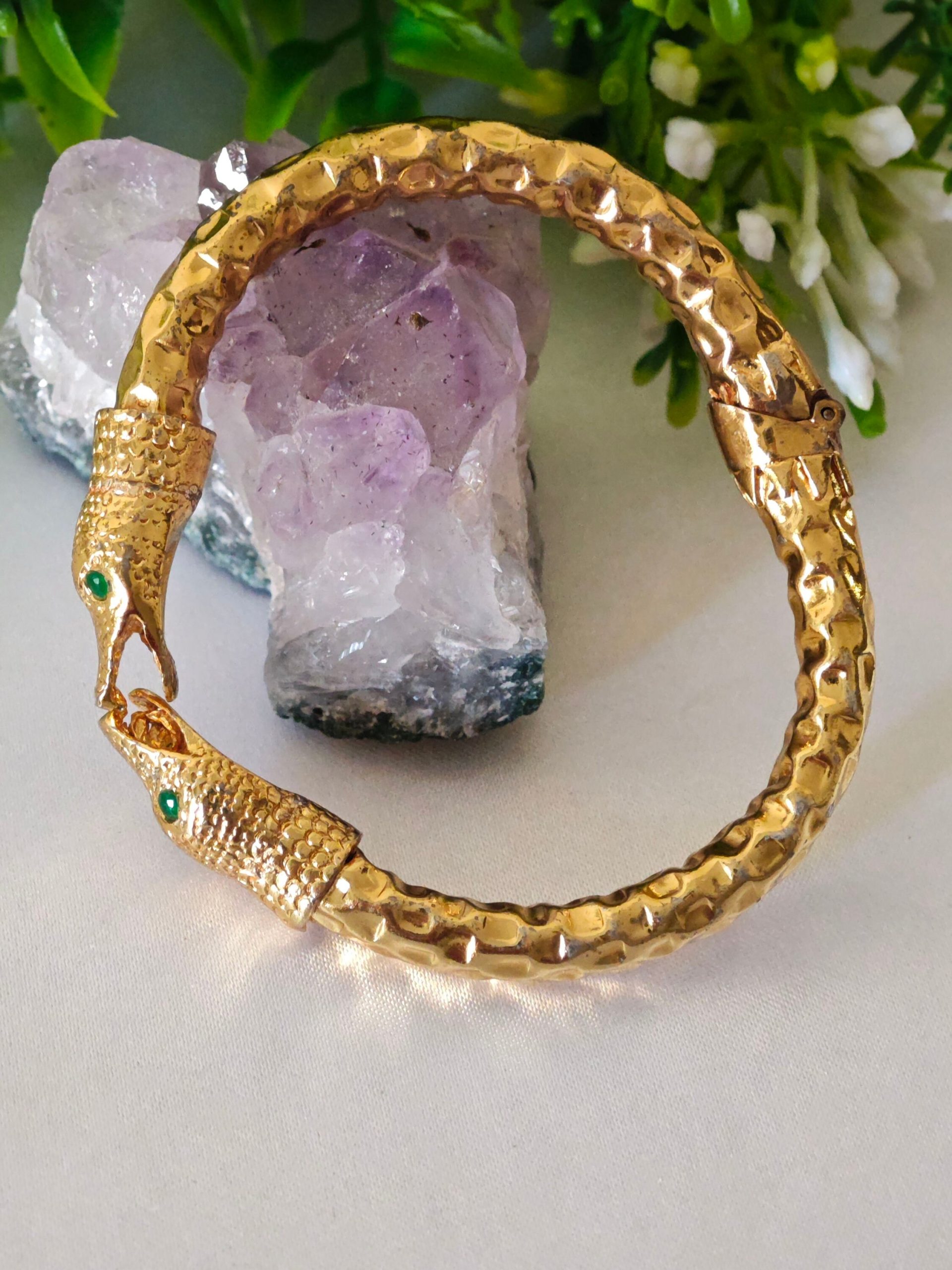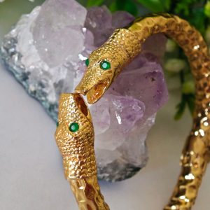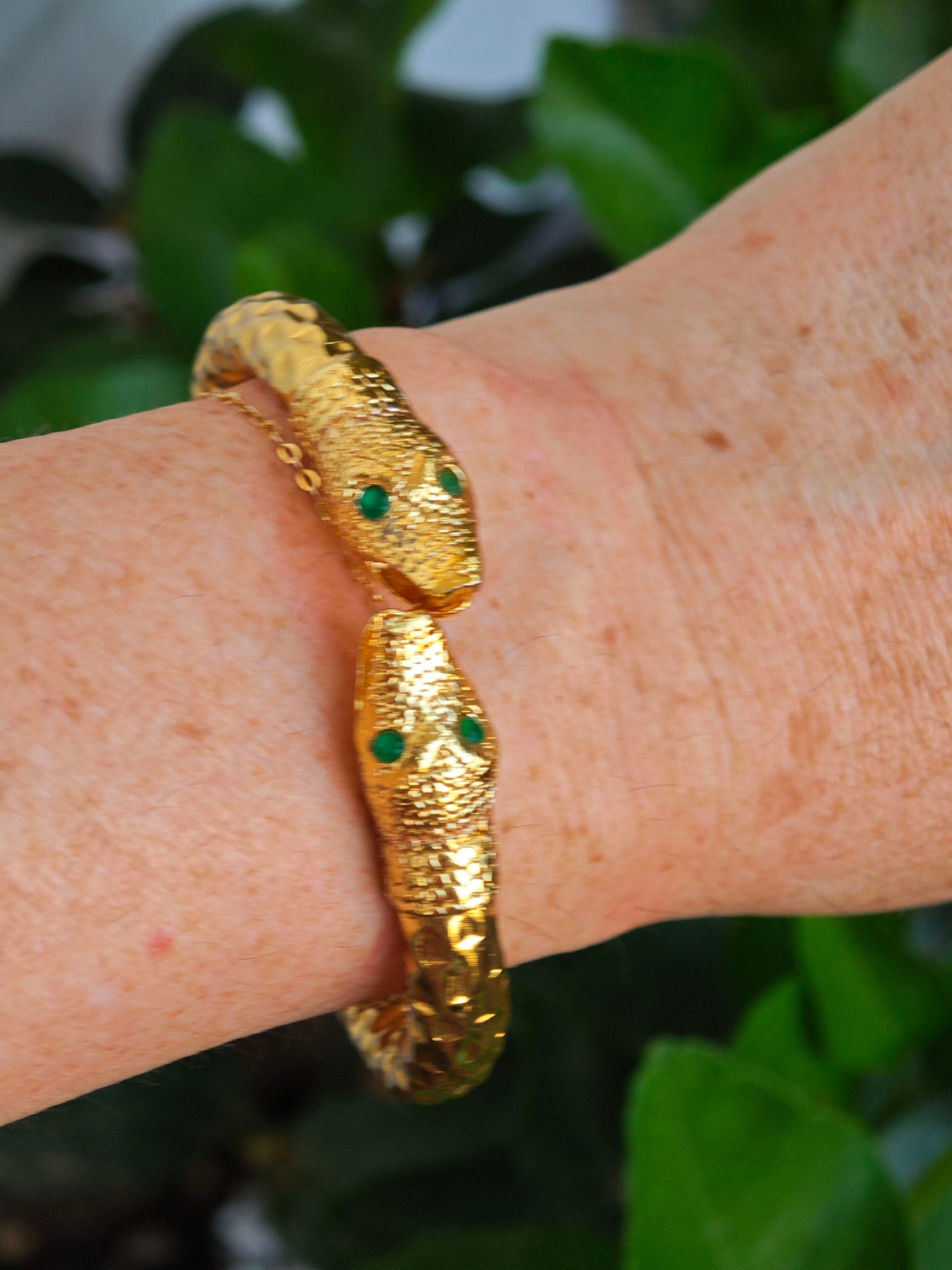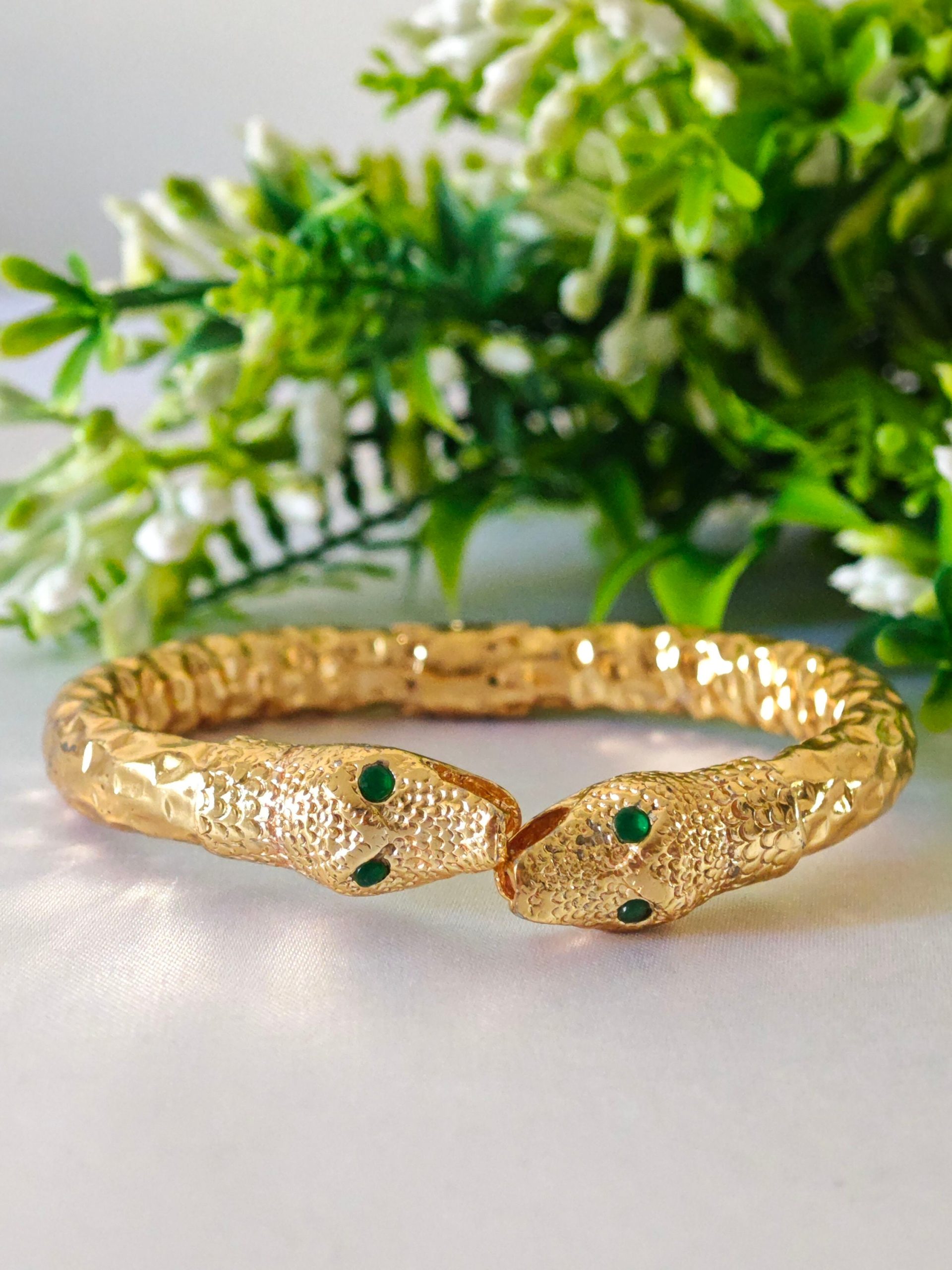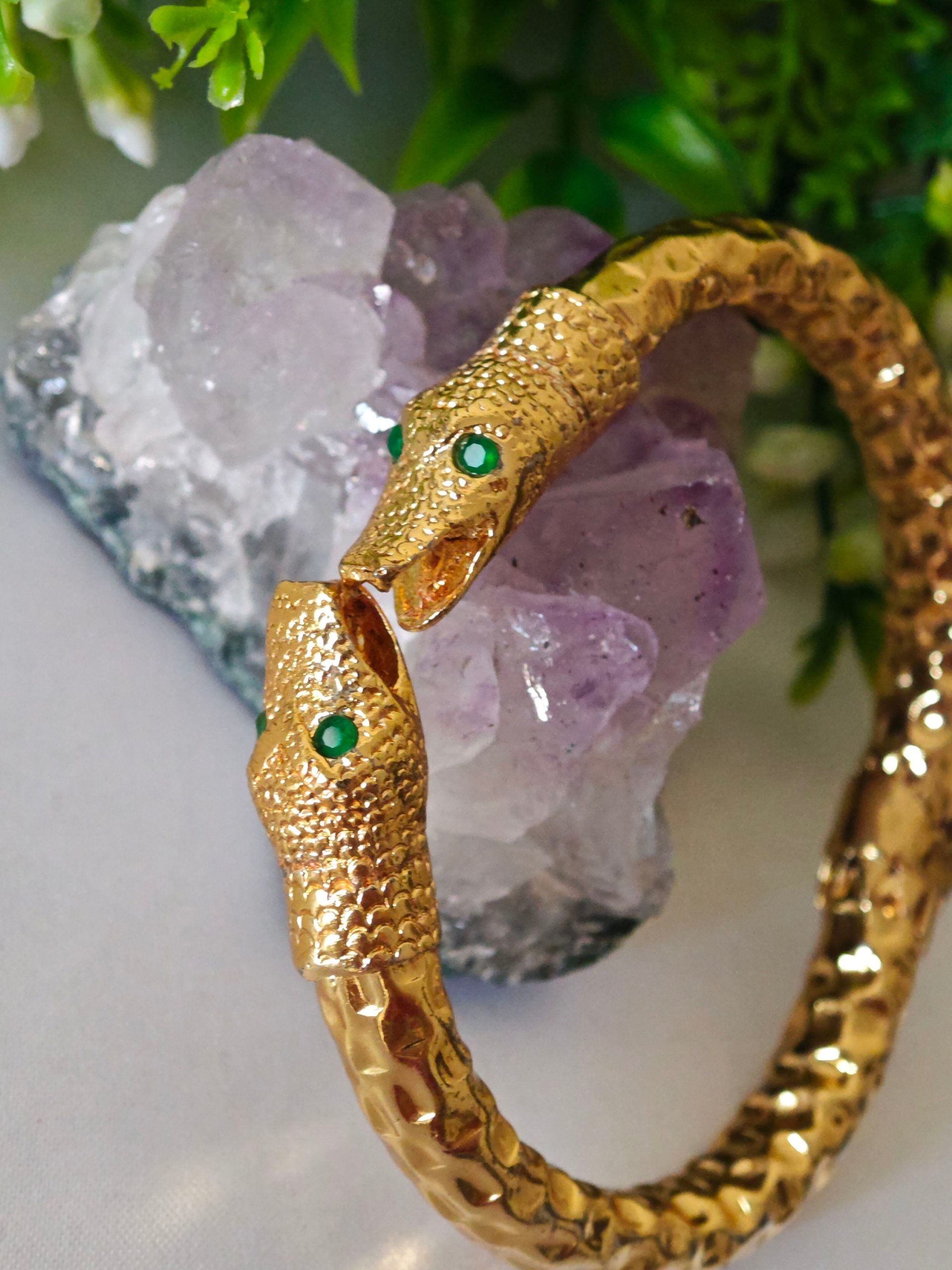 Bracciale rigido in ottone dorato a forma di serpente con zirconi verdi