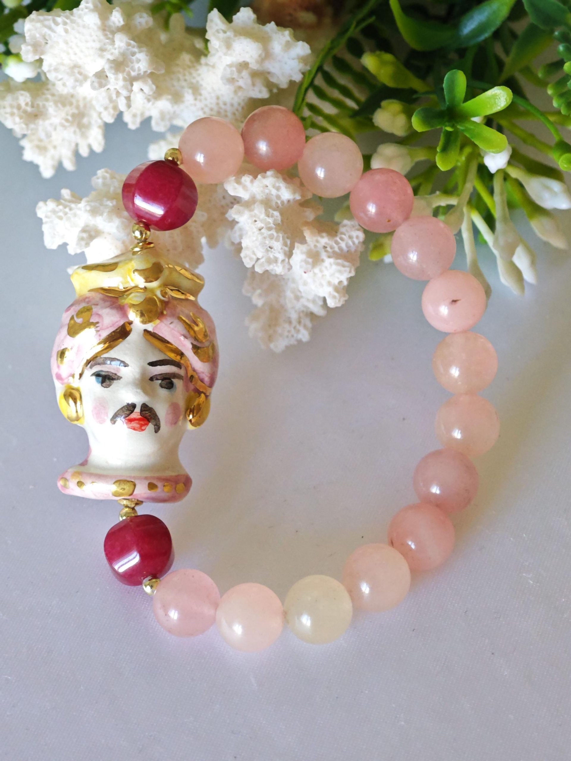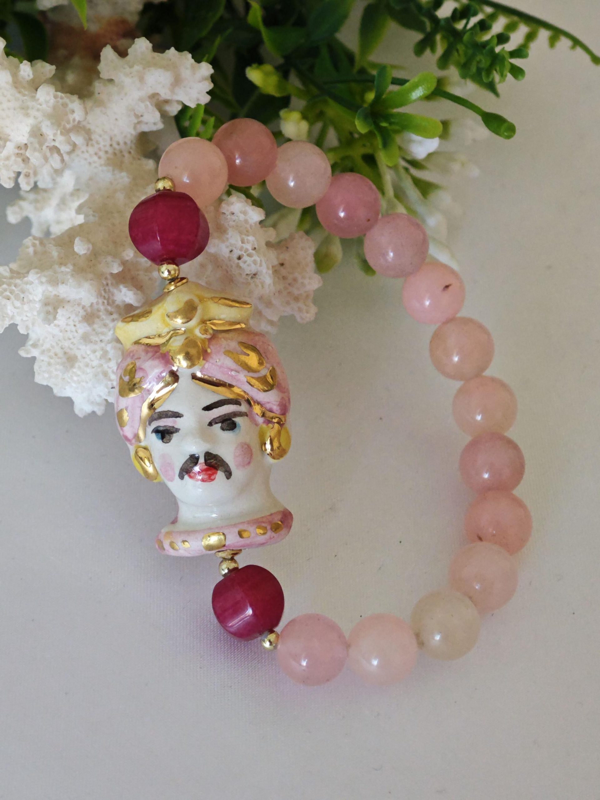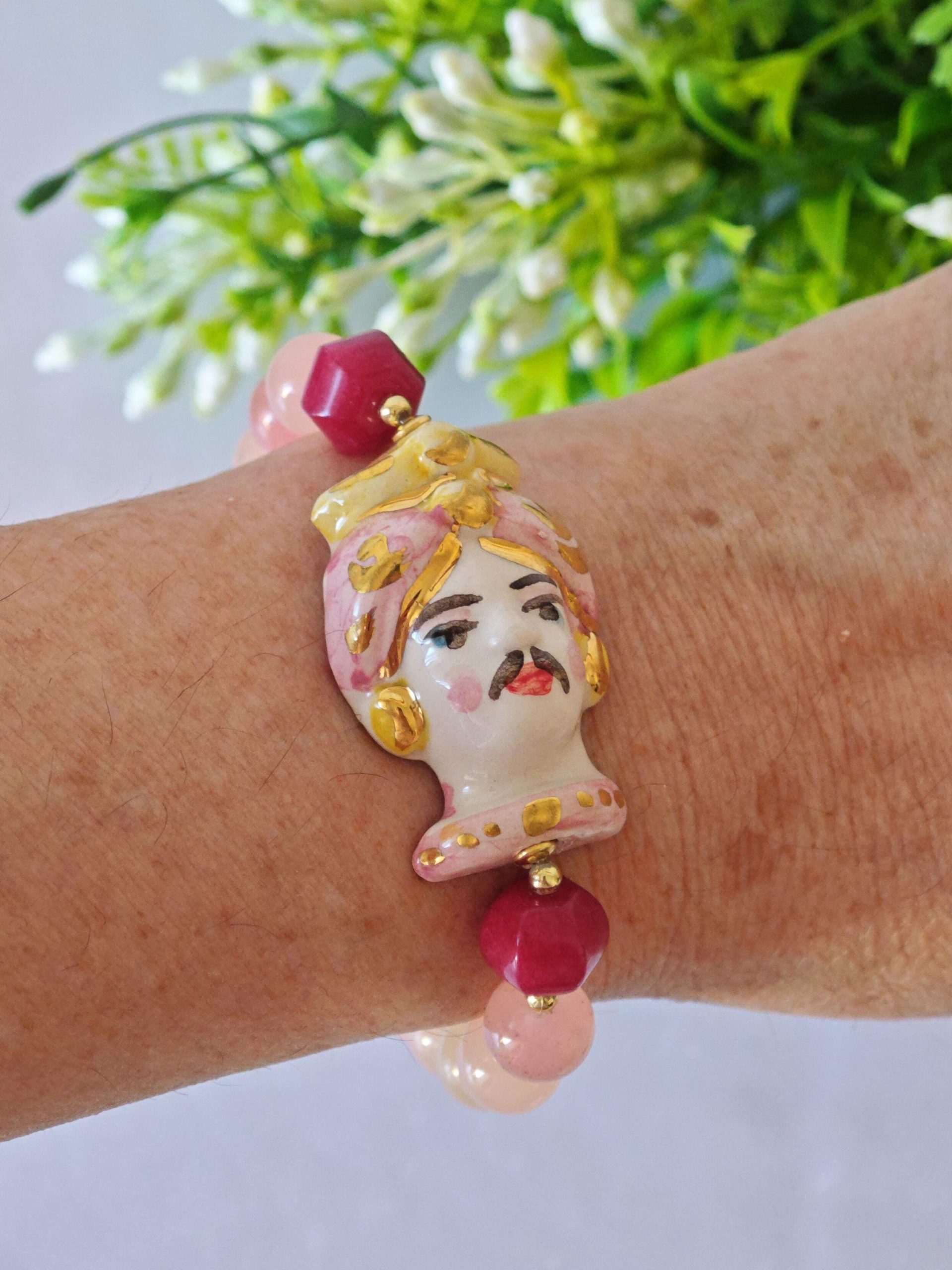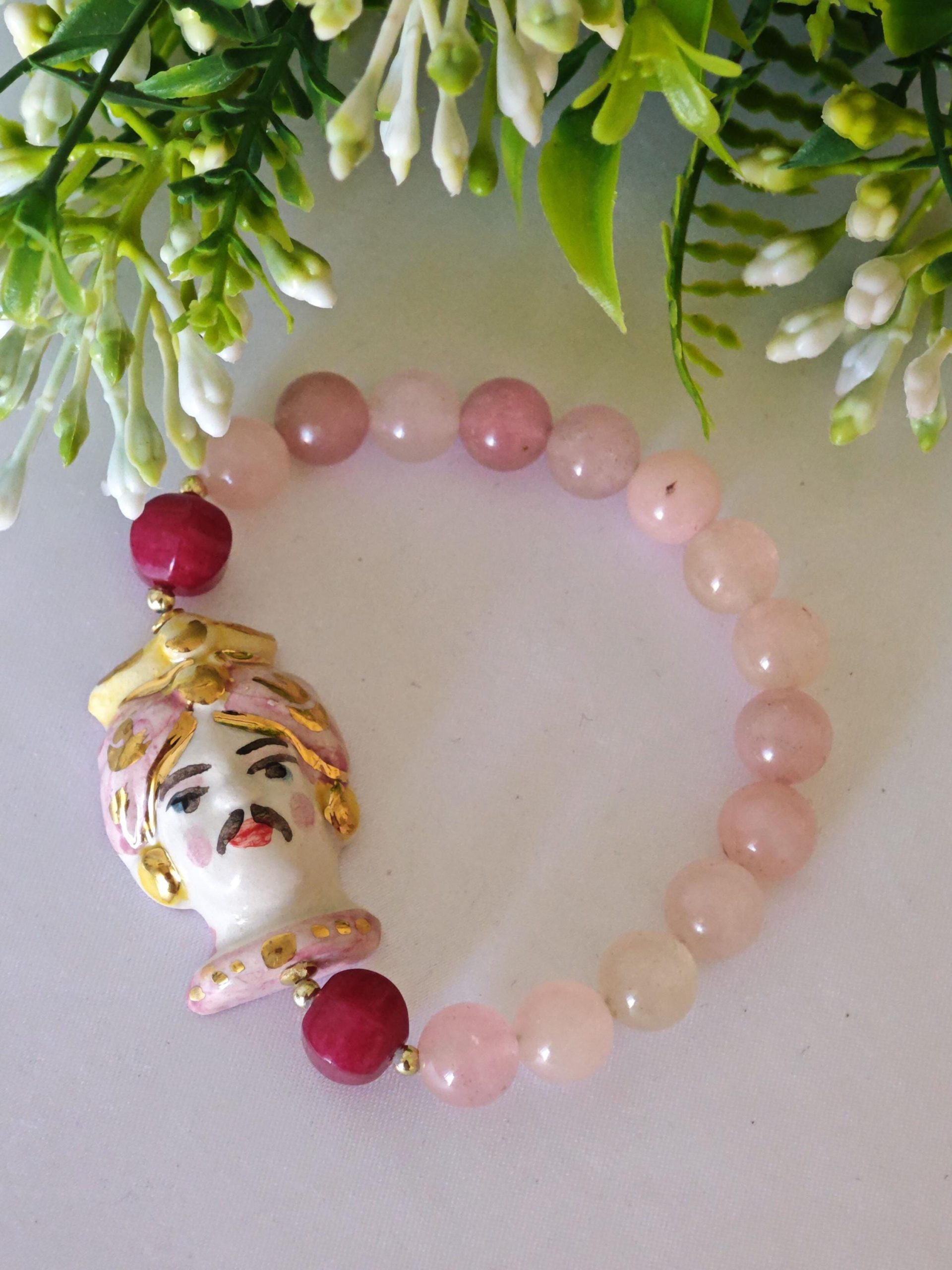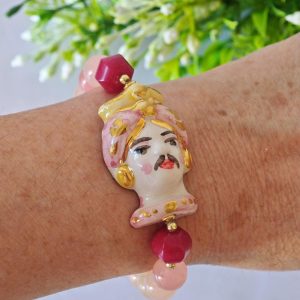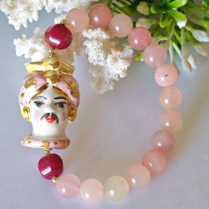 Bracciale testa di moro ceramica Caltagirone , bracciale pietre dure quarzo rosa , bracciale siciliano