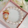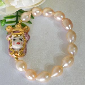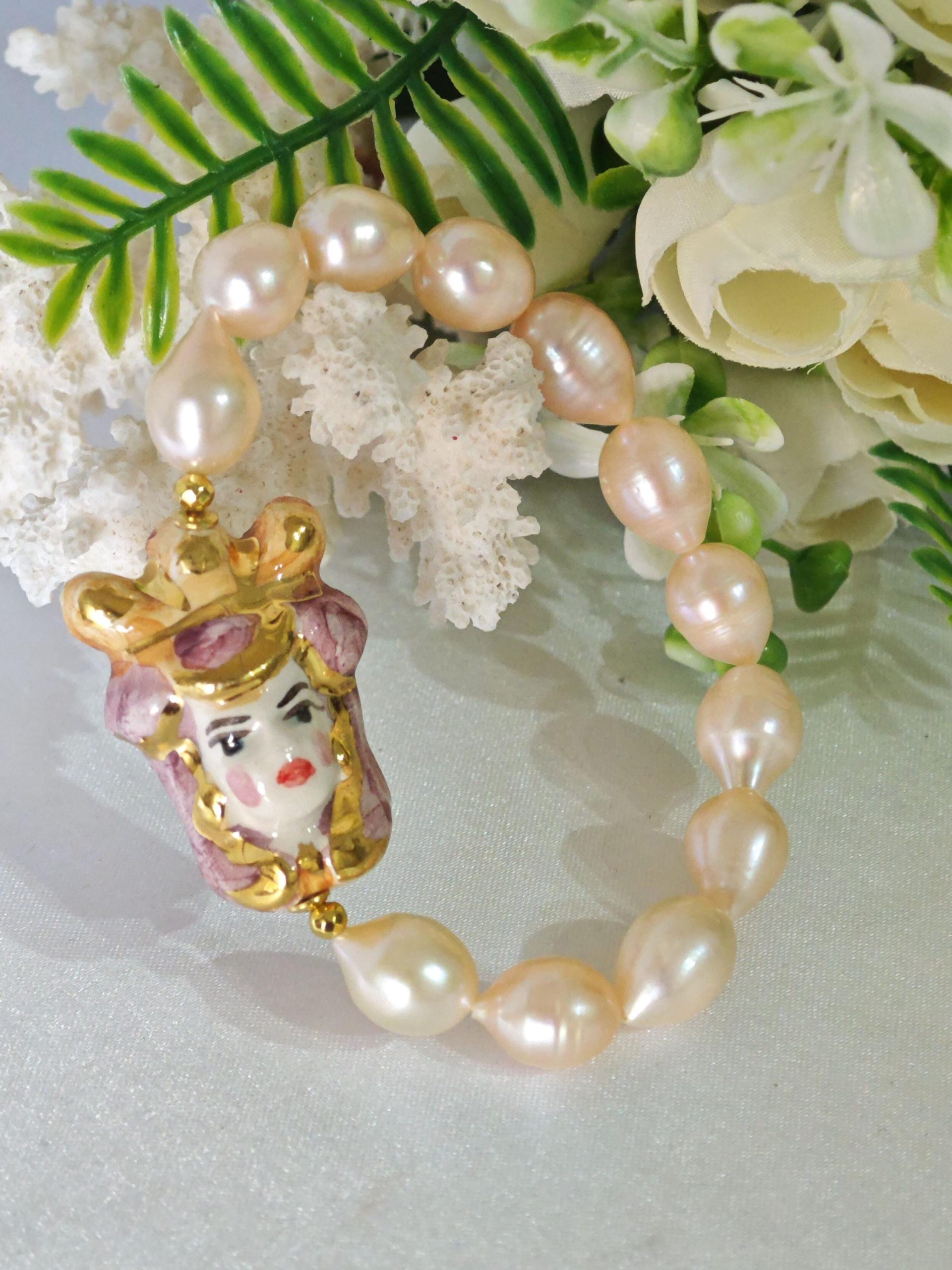 Bracciale elastico con perle barocche rosa e con testa di moro donna in ceramica di Caltagirone realizzata e dipinta a mano con applicazioni foglia oro 22 kt, 3 cm dimensioni .