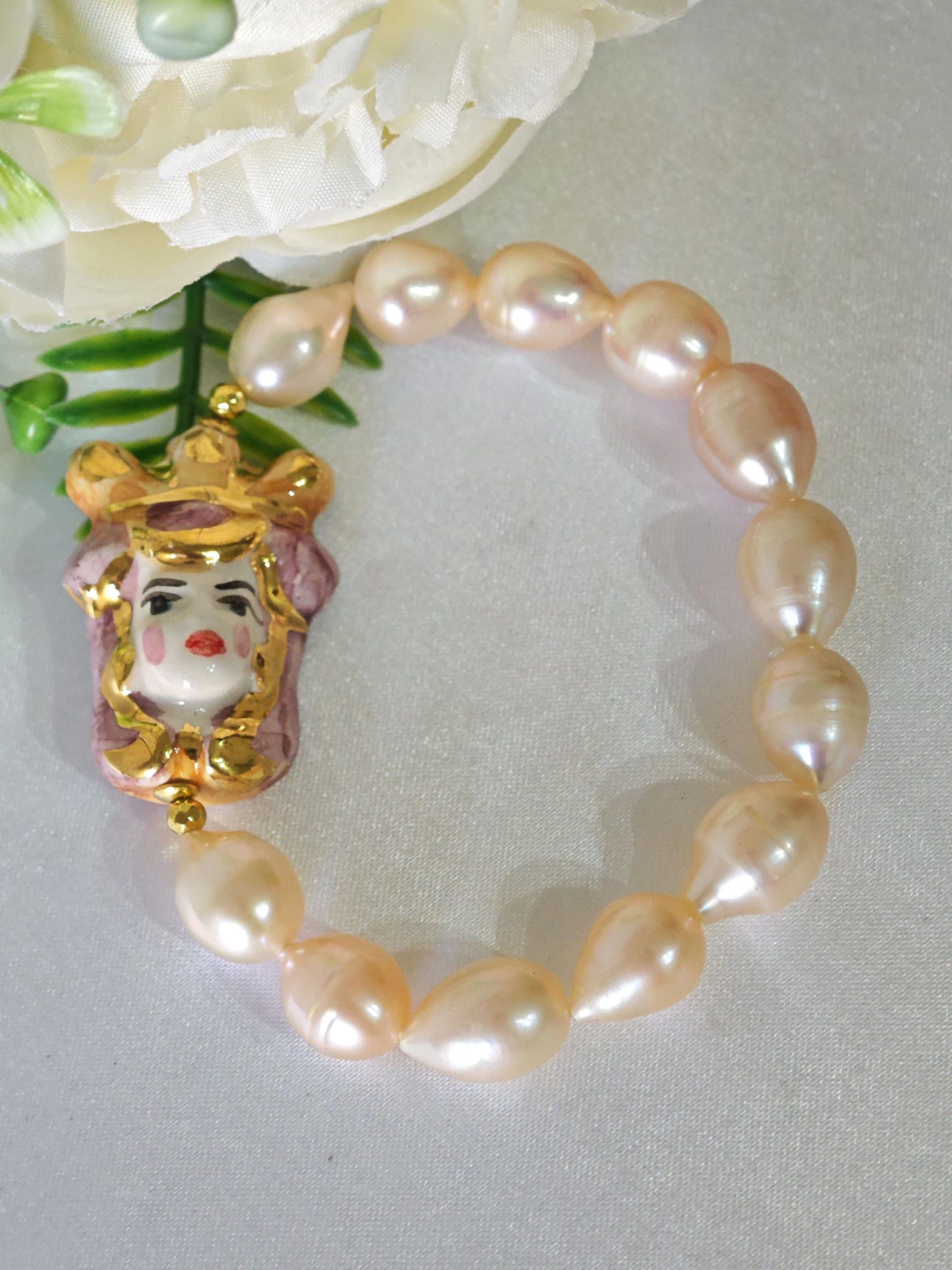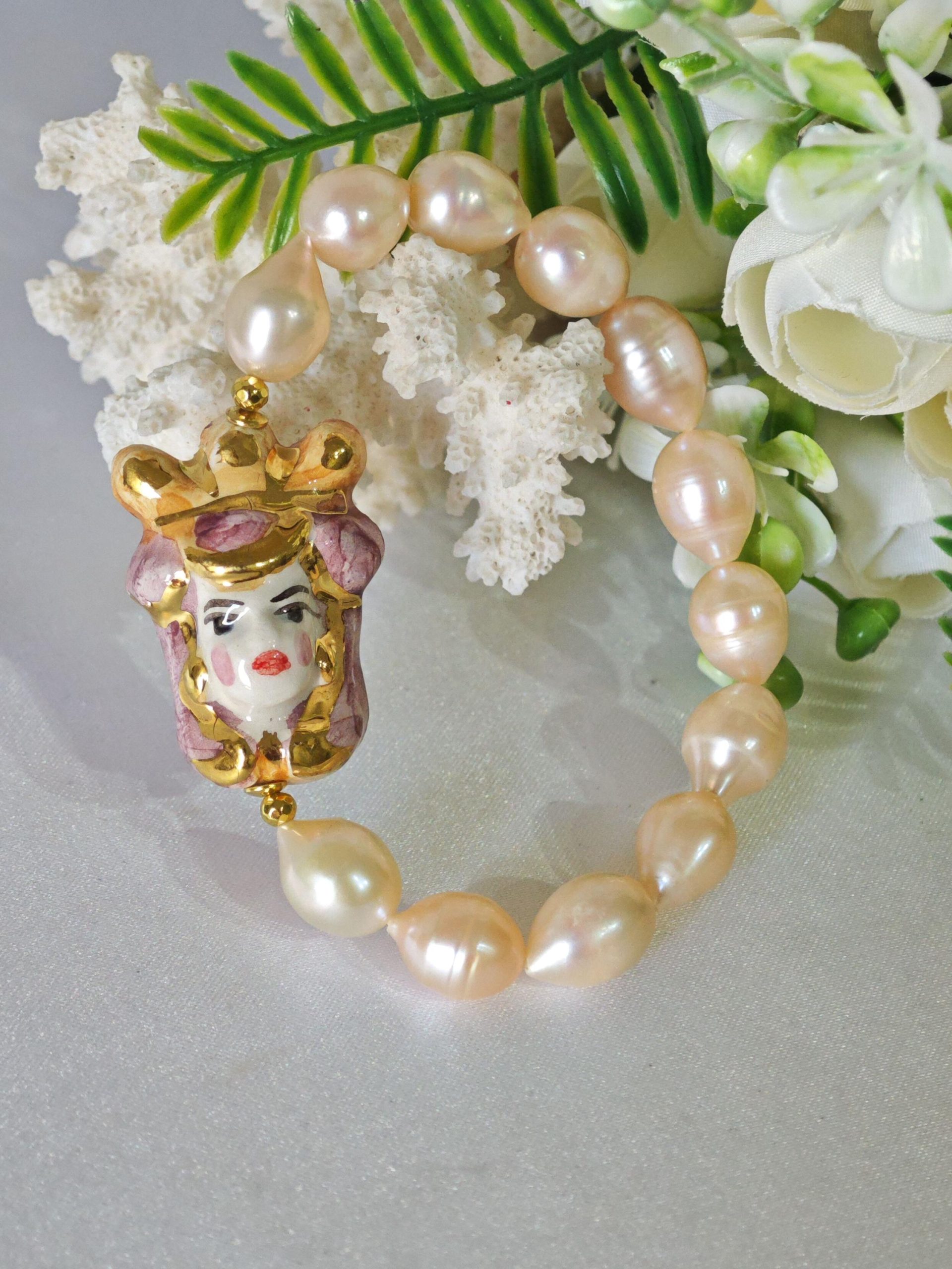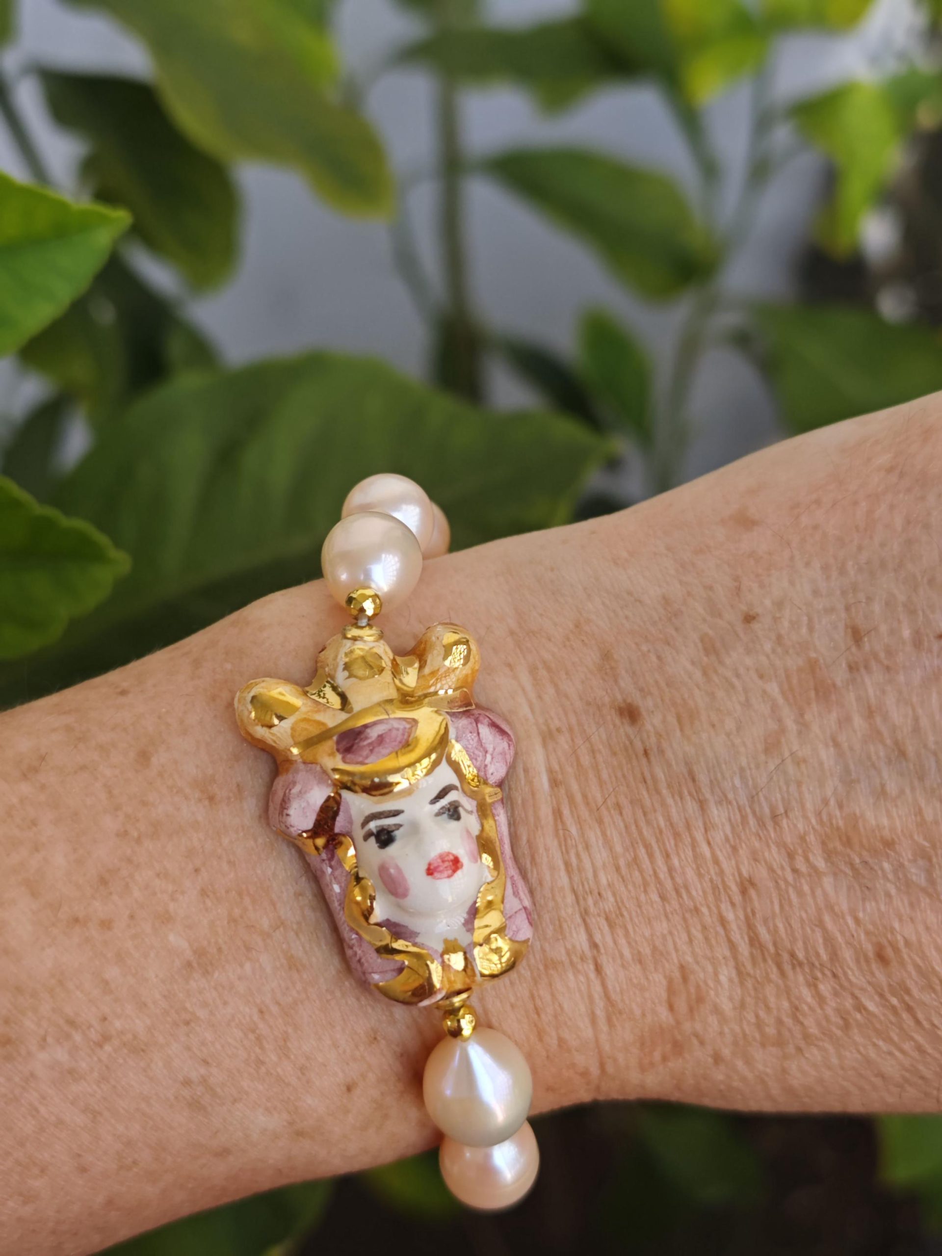 Bracciale testa di moro ceramica Caltagirone con bracciale perle barocche rosa, bracciale siciliano maxi