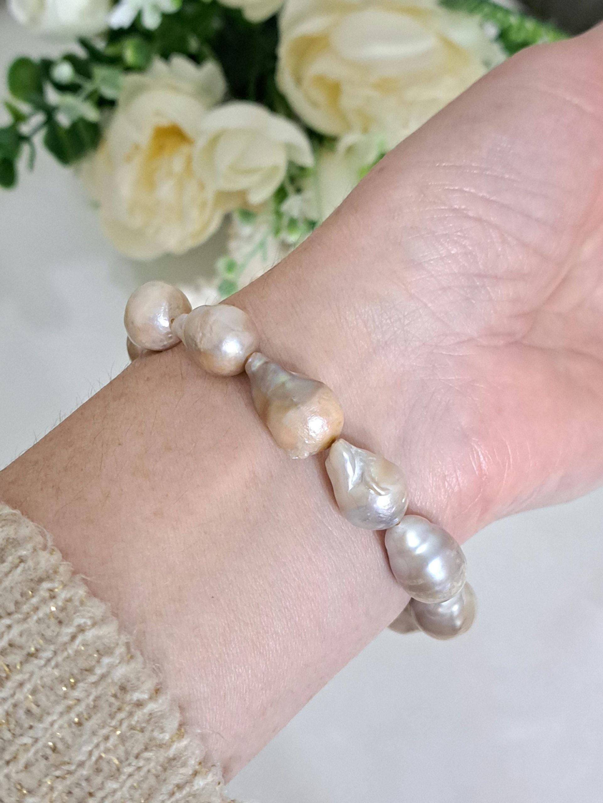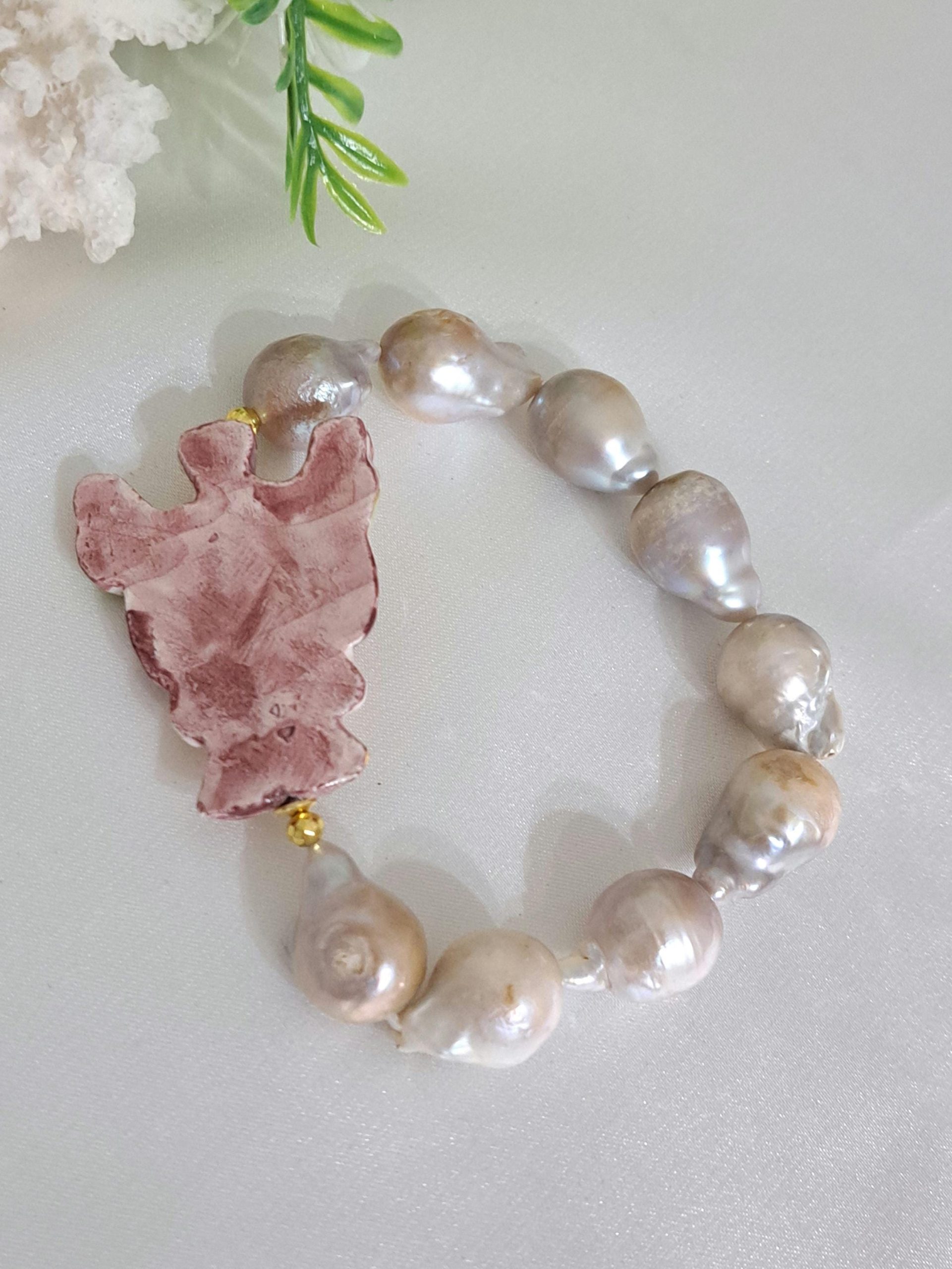 Bracciale elastico realizzato con perle barocche bianche-malva, testa di moro donna in ceramica di Caltagirone realizzata e dipinta a mano con applicazioni foglia oro 22 kt, 4 cm dimensioni .