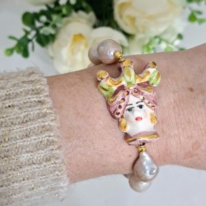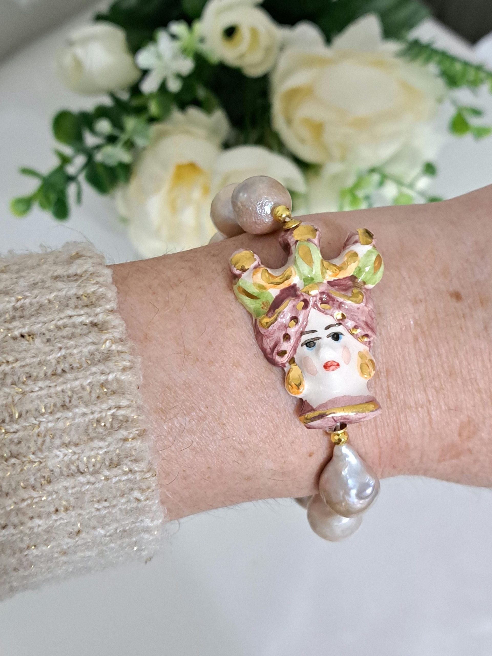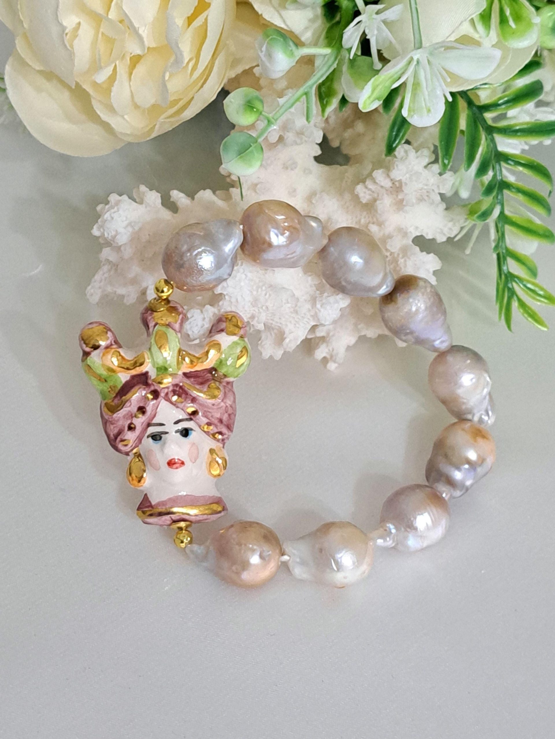 Bracciale testa di moro in ceramica di Caltagirone , bracciale perle barocche malva, bracciale siciliano