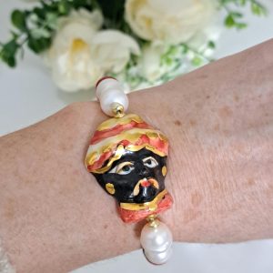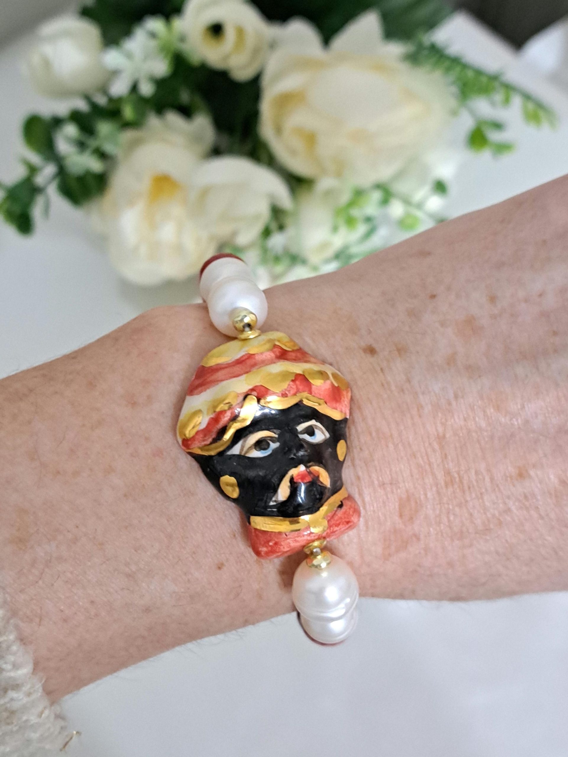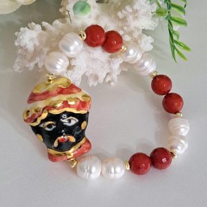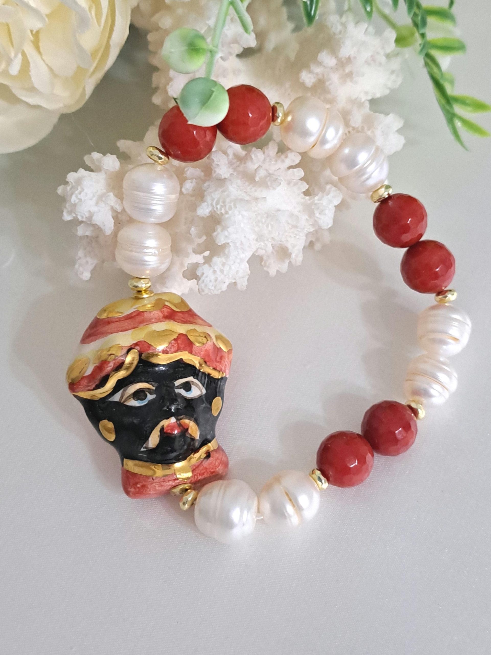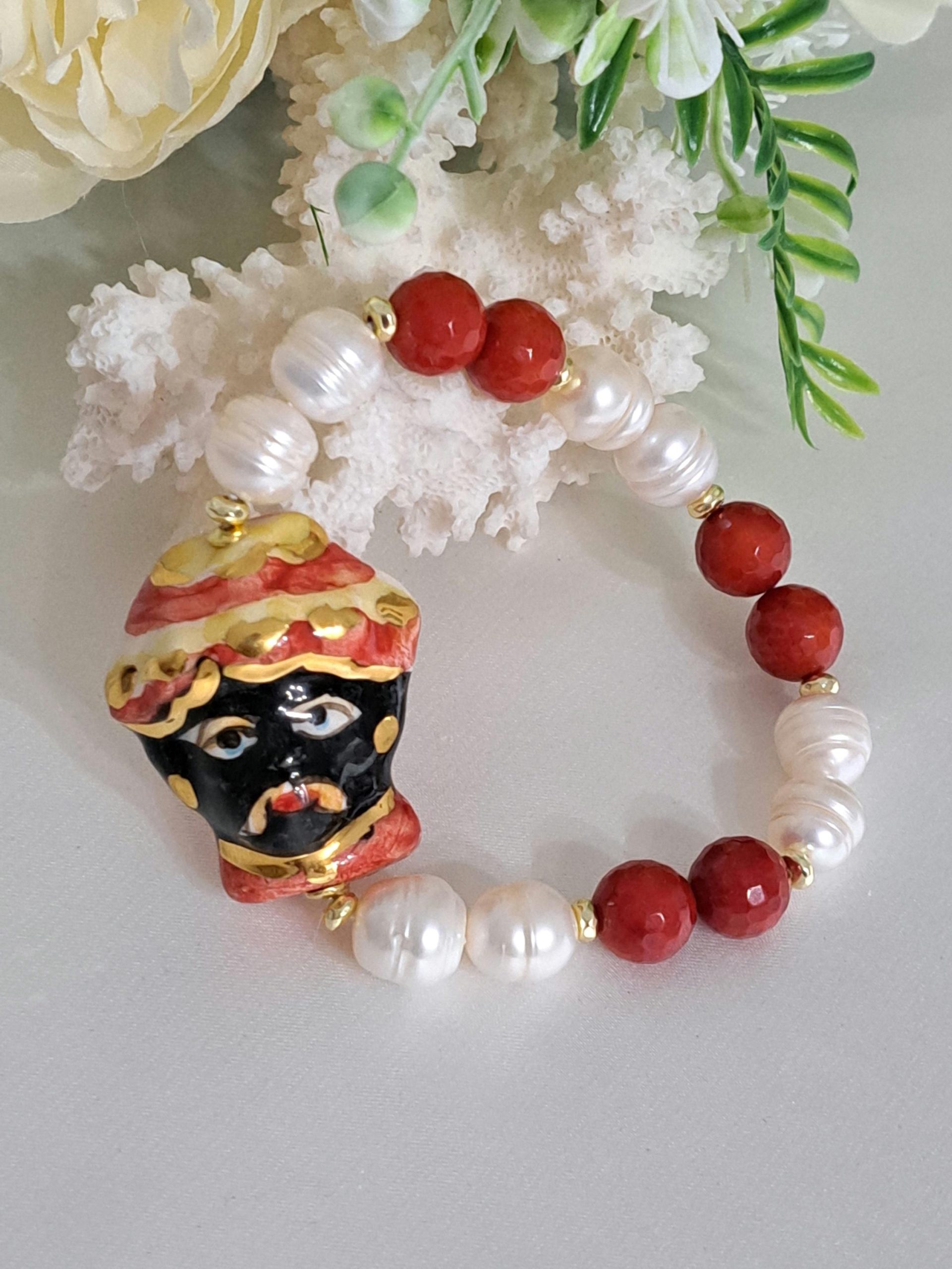 Bracciale testa di moro in ceramica di Caltagirone, bracciale perle bianche e corallo rosso, bracciale siciliano