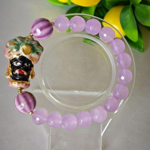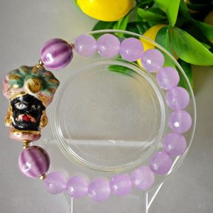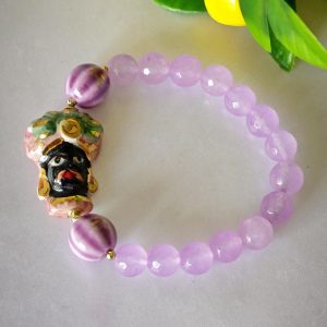 Bracciale elastico con pietre dure sfaccettate agata viola lavanda 10 mm, perle ceramica viola e con testa in ceramica di Caltagirone realizzata e dipinta a mano, 3 cm dimensioni.