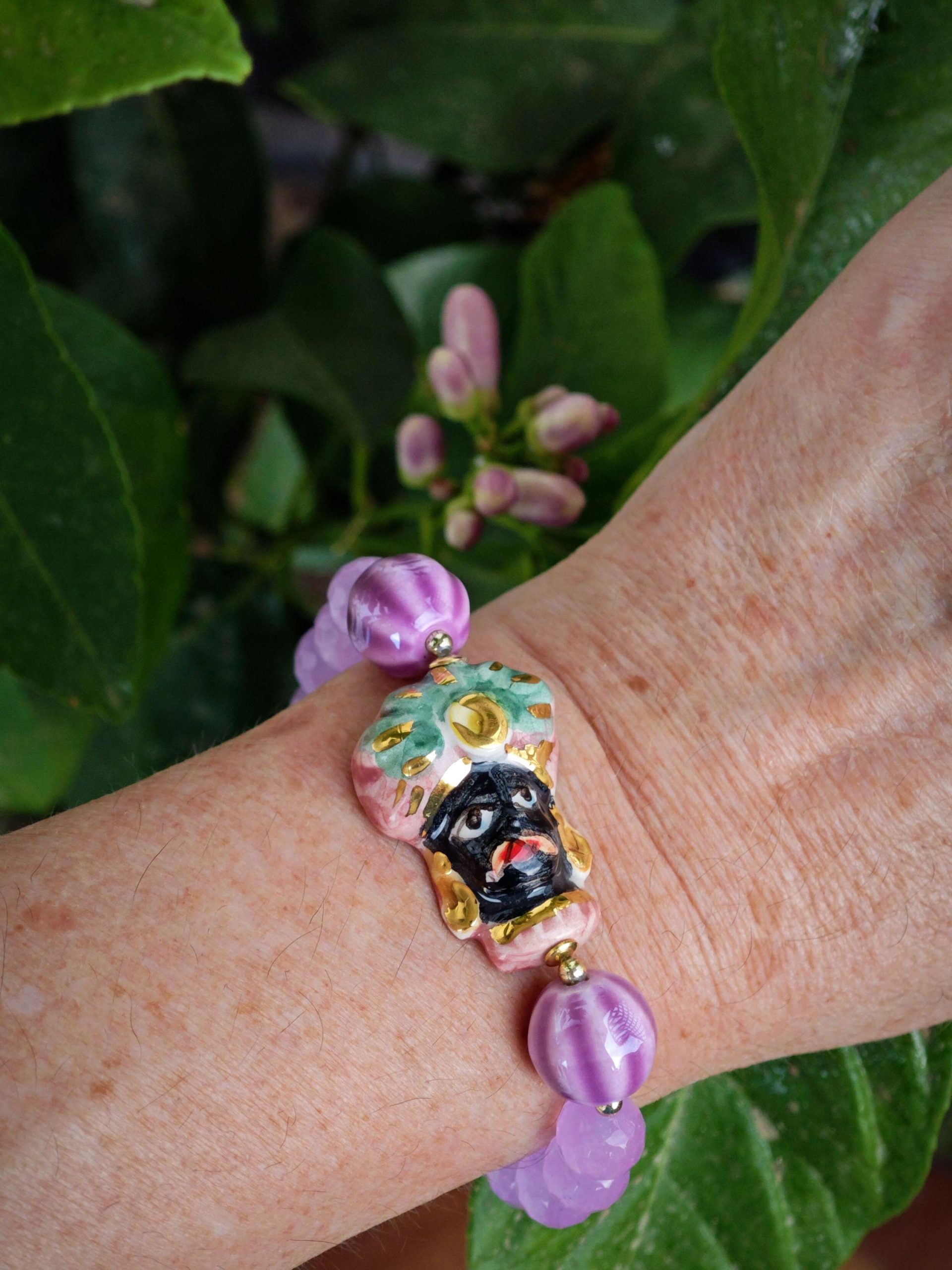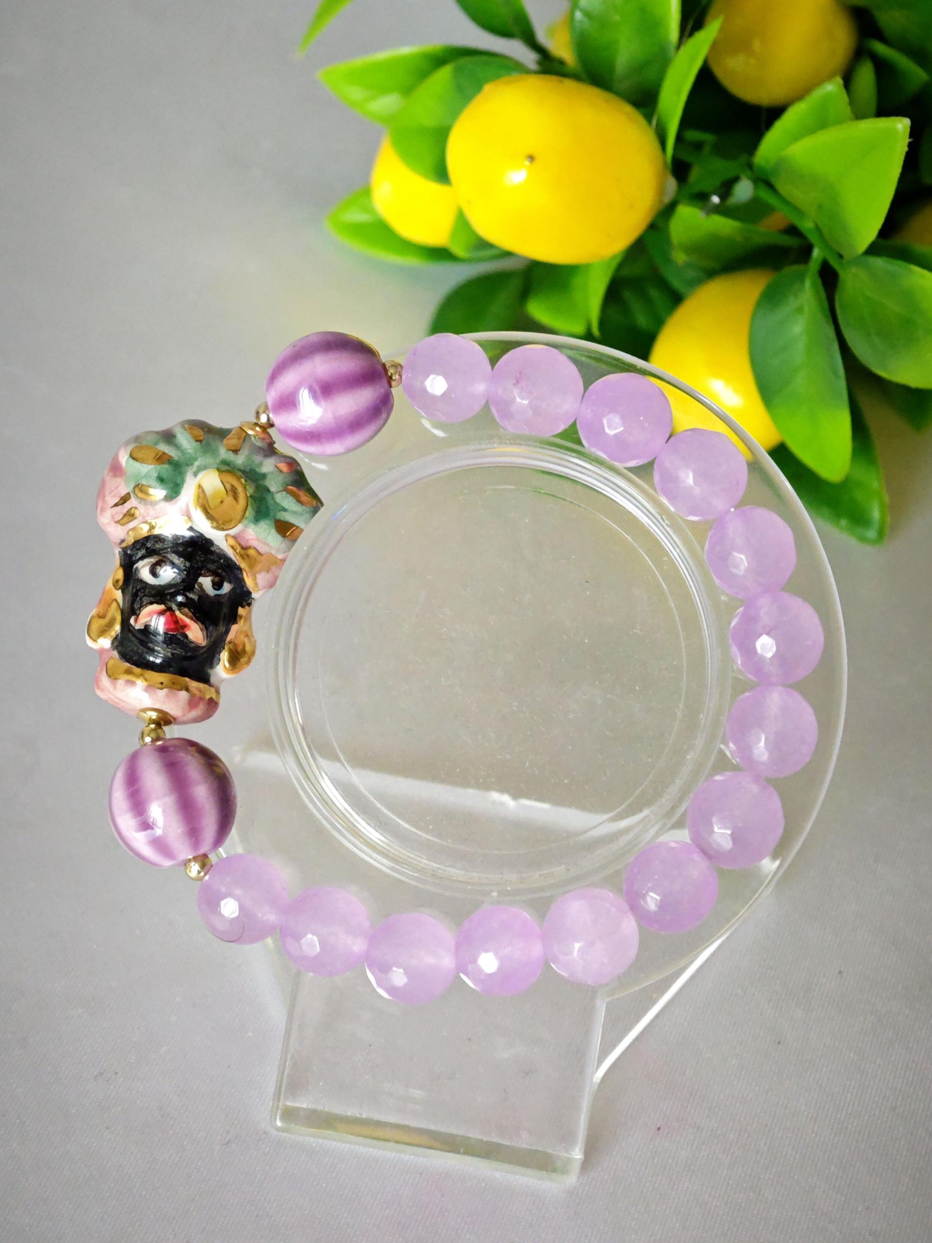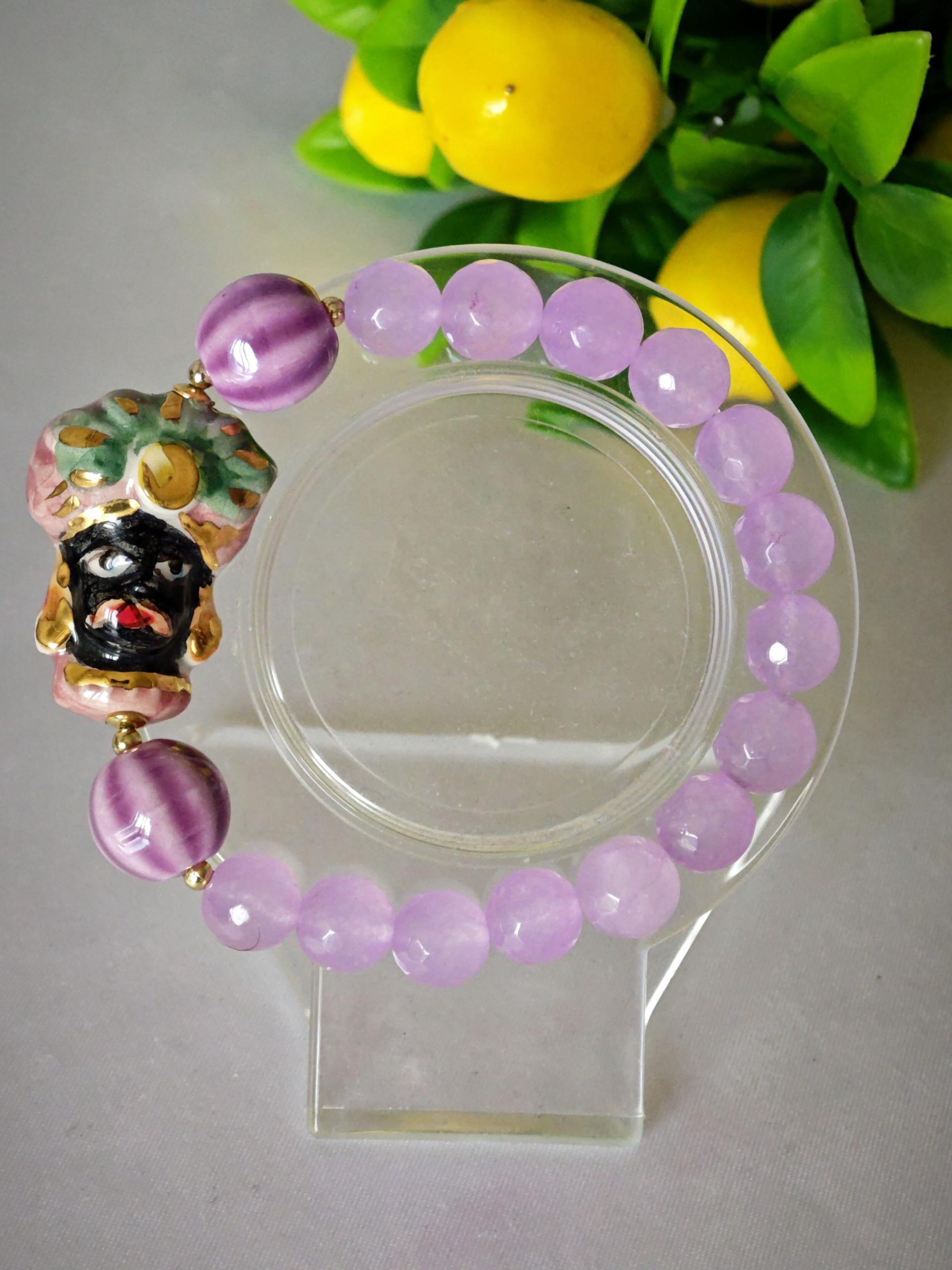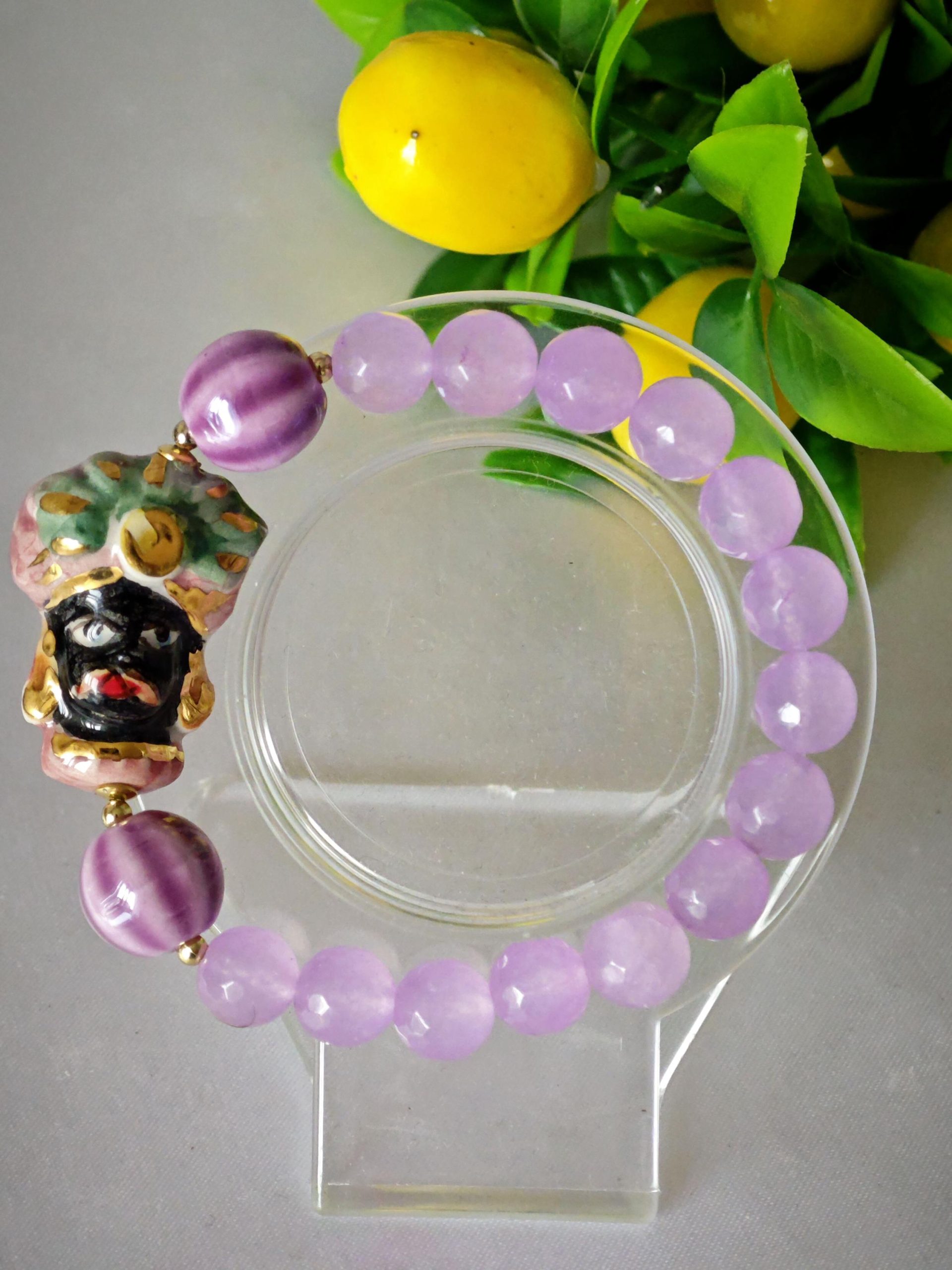 Bracciale testa di moro in ceramica di Caltagirone con pietre agata viola, bracciale siciliano