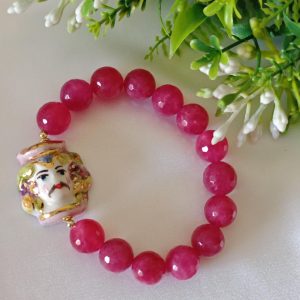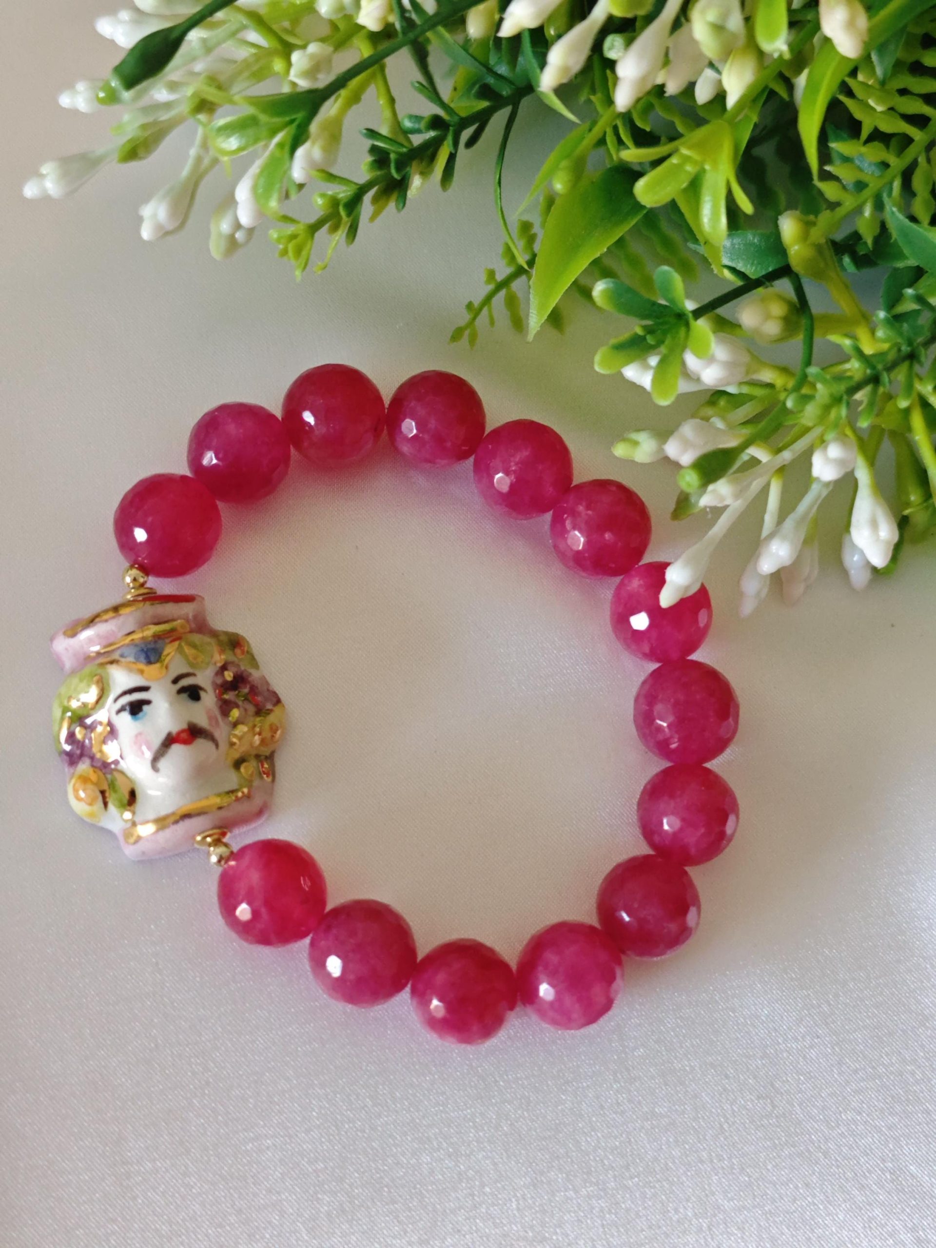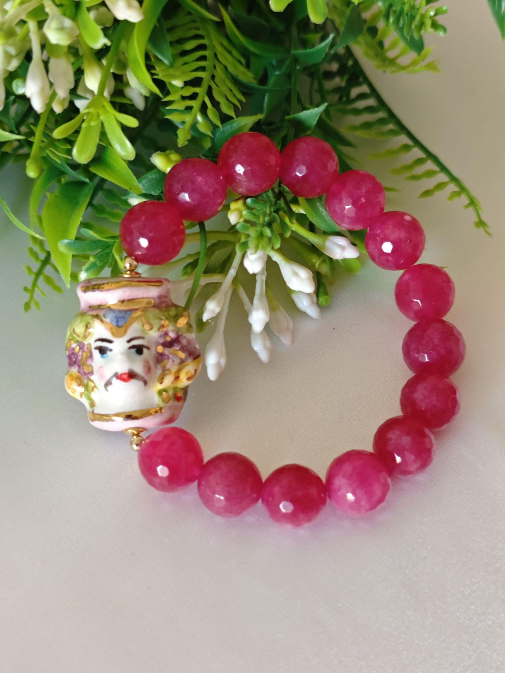 Bracciale elastico realizzato con pietre dure sfaccettate agata rosa fragola 12 mm e testa di moro in ceramica di Caltagirone realizzata e dipinta a mano, 3 cm dimensioni, con applicazioni foglia d’oro 24 kt.