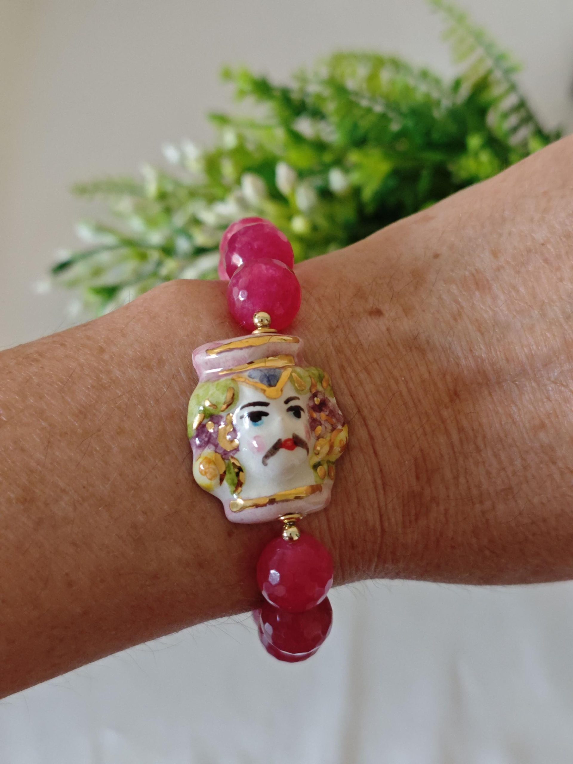 Bracciale testa di moro in ceramica di Caltagirone con pietre dure agata rosa , bracciale siciliano