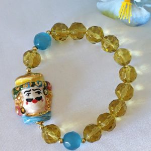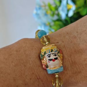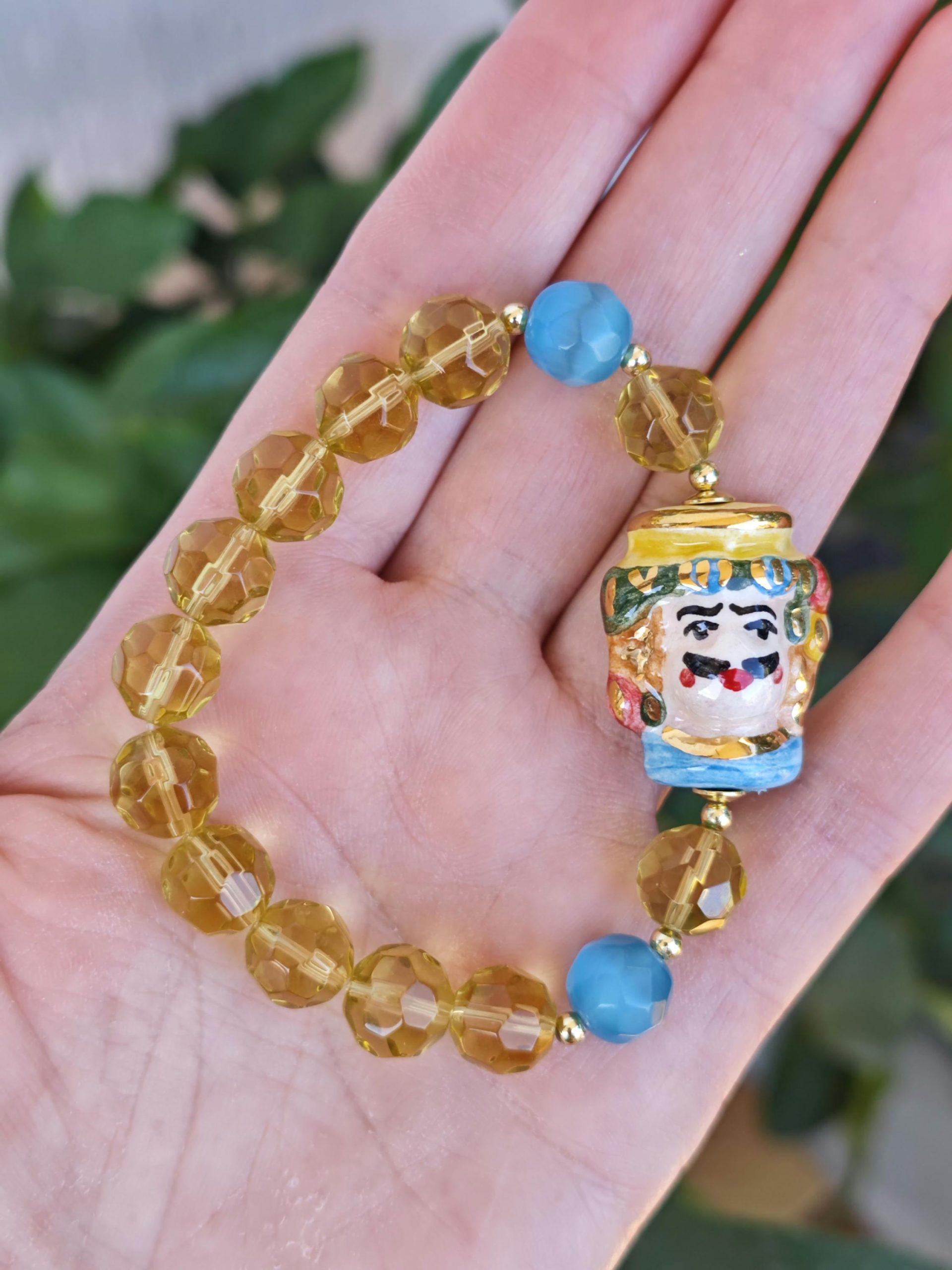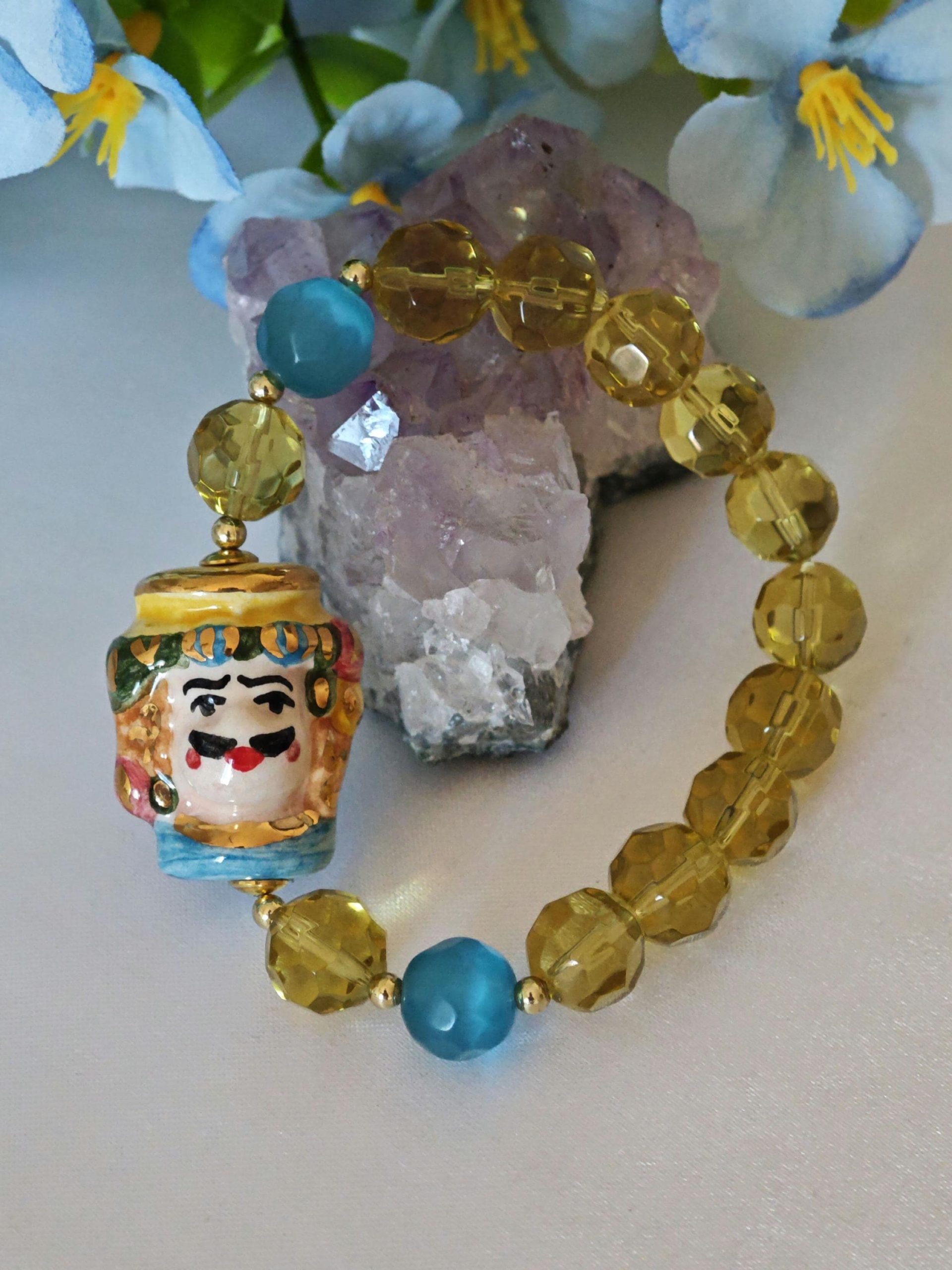 Bracciale elastico realizzato con cristalli gialli sfaccettati 10 mm, pietre quarzo blu occhio di gatto e testa in ceramica di Caltagirone realizzata e dipinta a mano con applicazioni foglia oro 22 kt, 3 cm dimensioni.