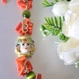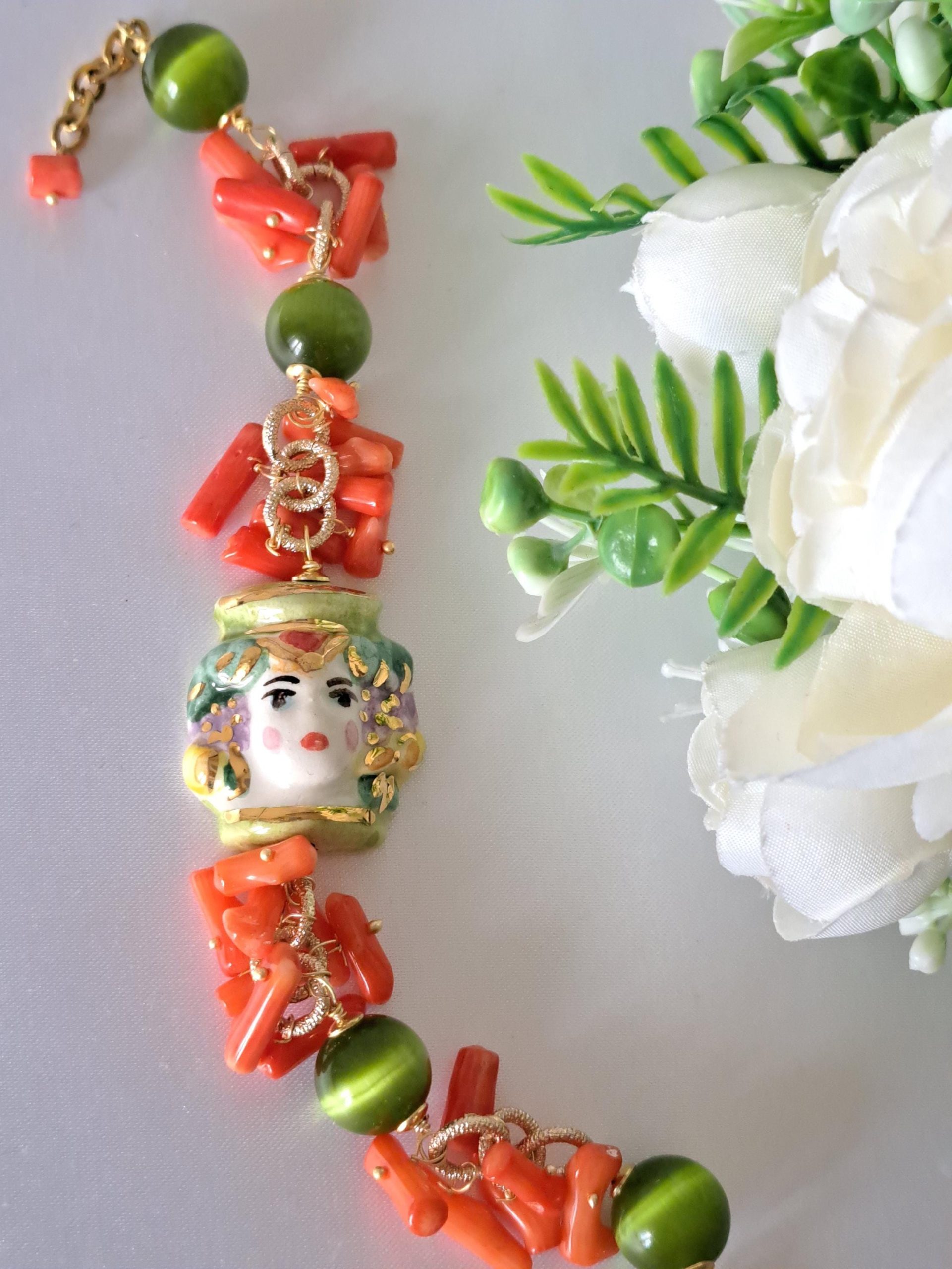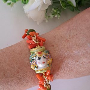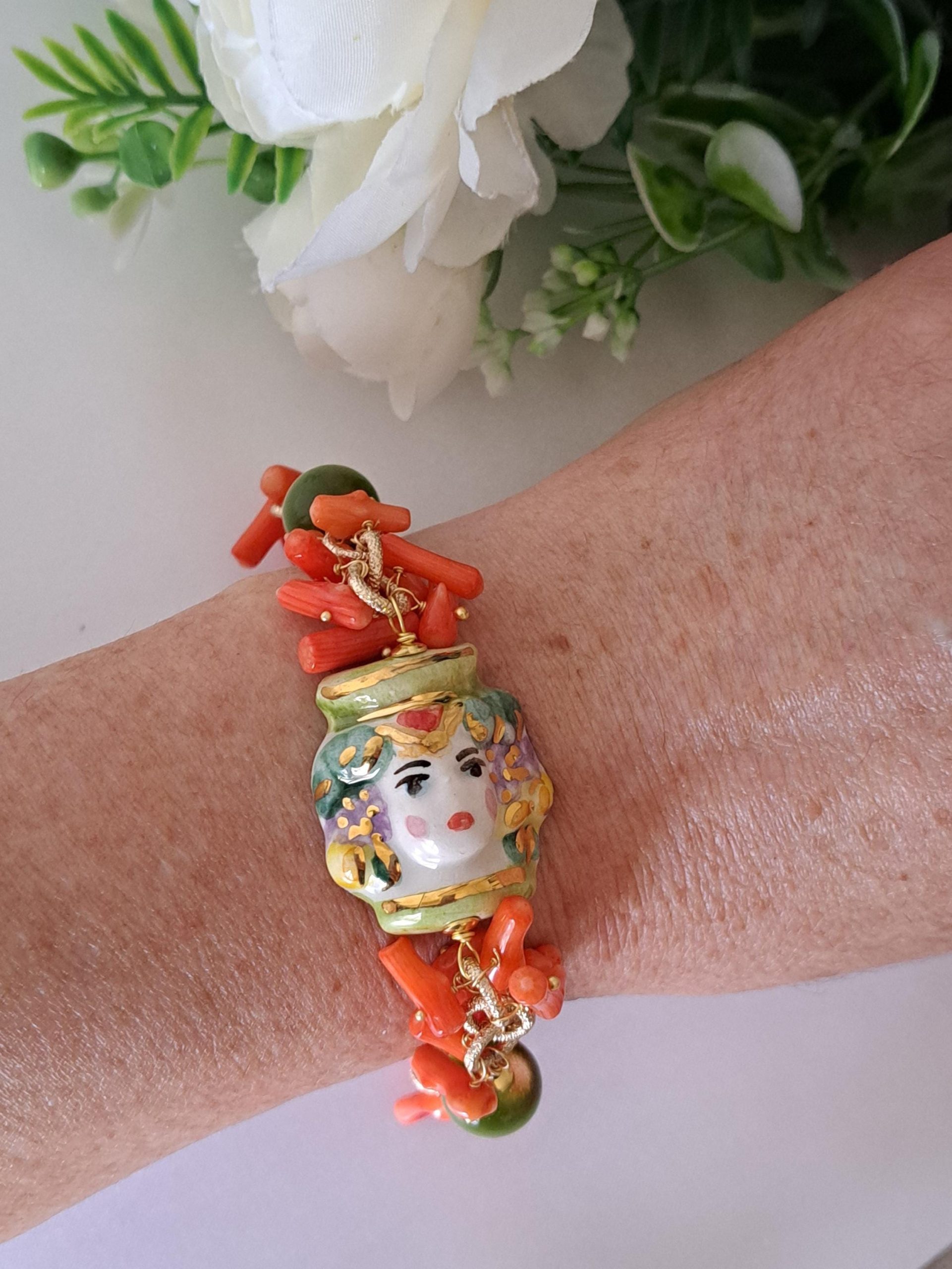Bracciale testa di moro in ceramica di Caltagirone pietre quarzo verde e corallo, bracciale siciliano