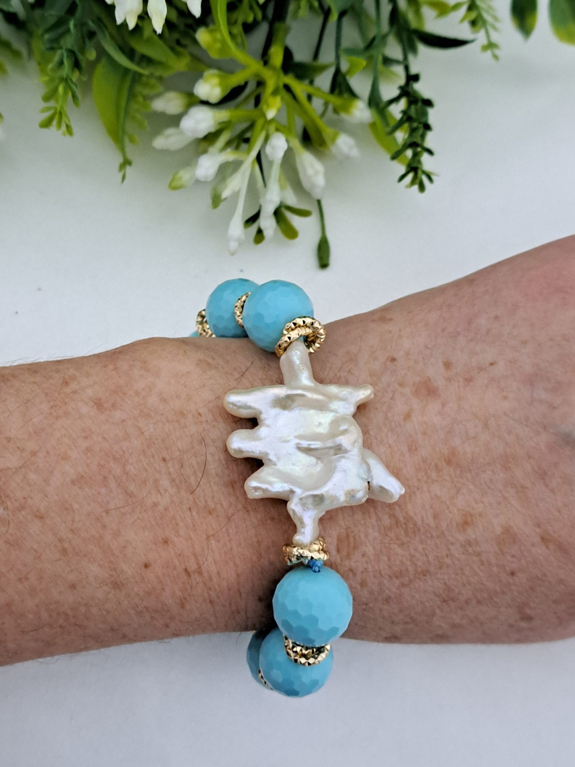 Bracciale maxi realizzato a mano con perle sfaccettate pasta di turchese imitazione 14 mm e con perla barocca piatta irregolare bianca centrale e anelli in alluminio dorato smerigliato.