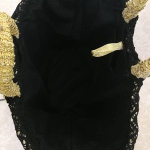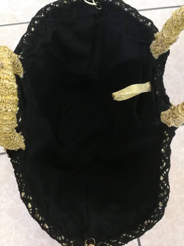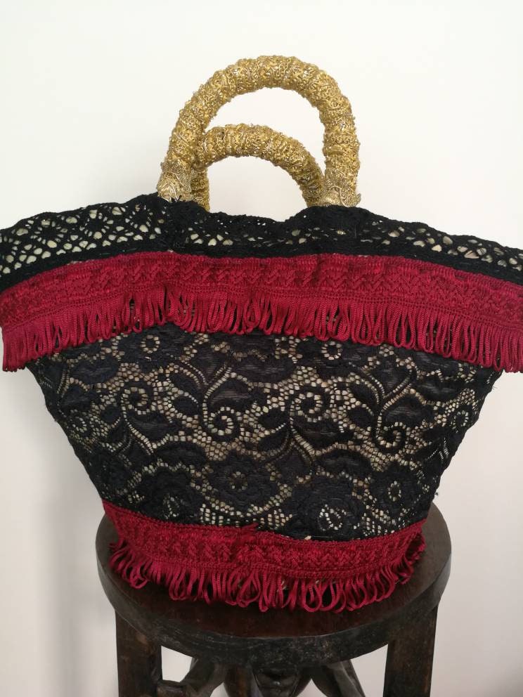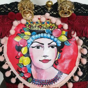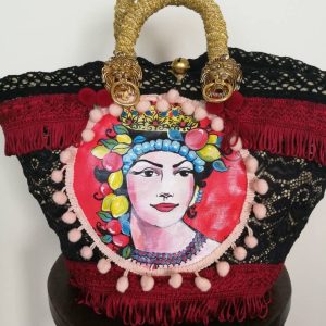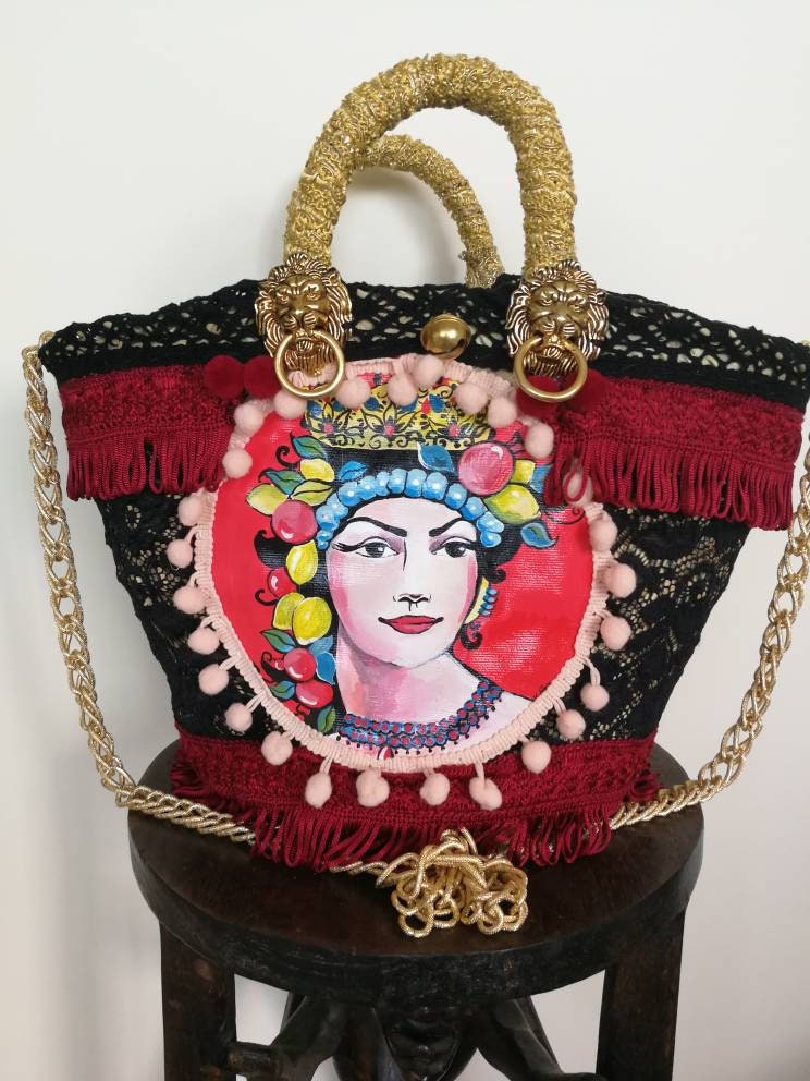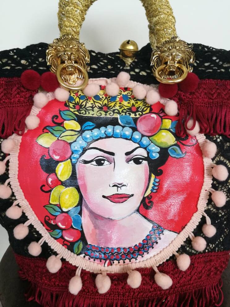 Borsa misura media in palma nana cucita e decorata a mano in stile siciliano con tela dipinta a mano raffigurante volto donna, passamanerie, ponpon e leoni ottone, fodera interna con tasca, chiusura a bottone campanella, con 2 manici,tracolla catena alluminio.