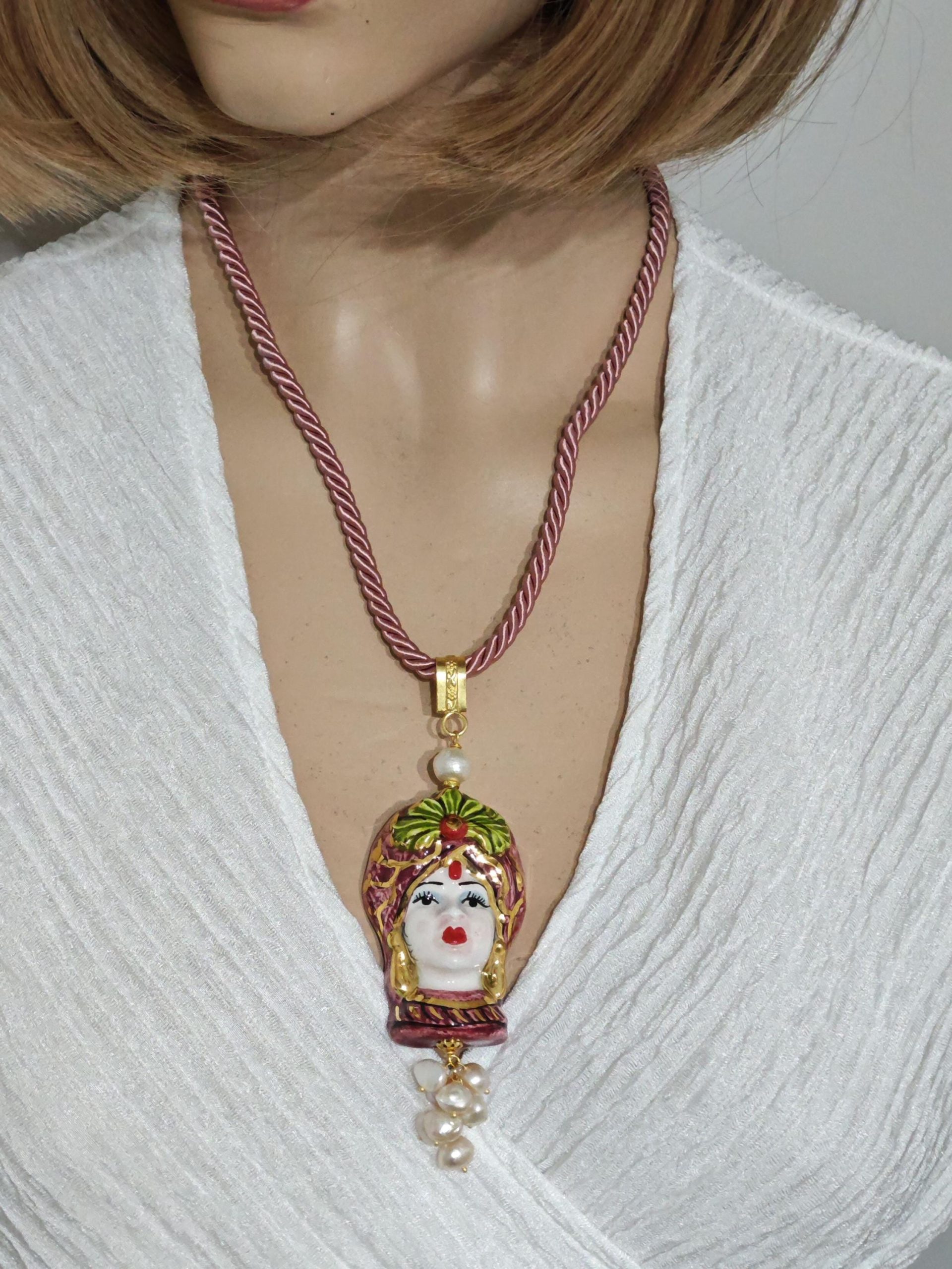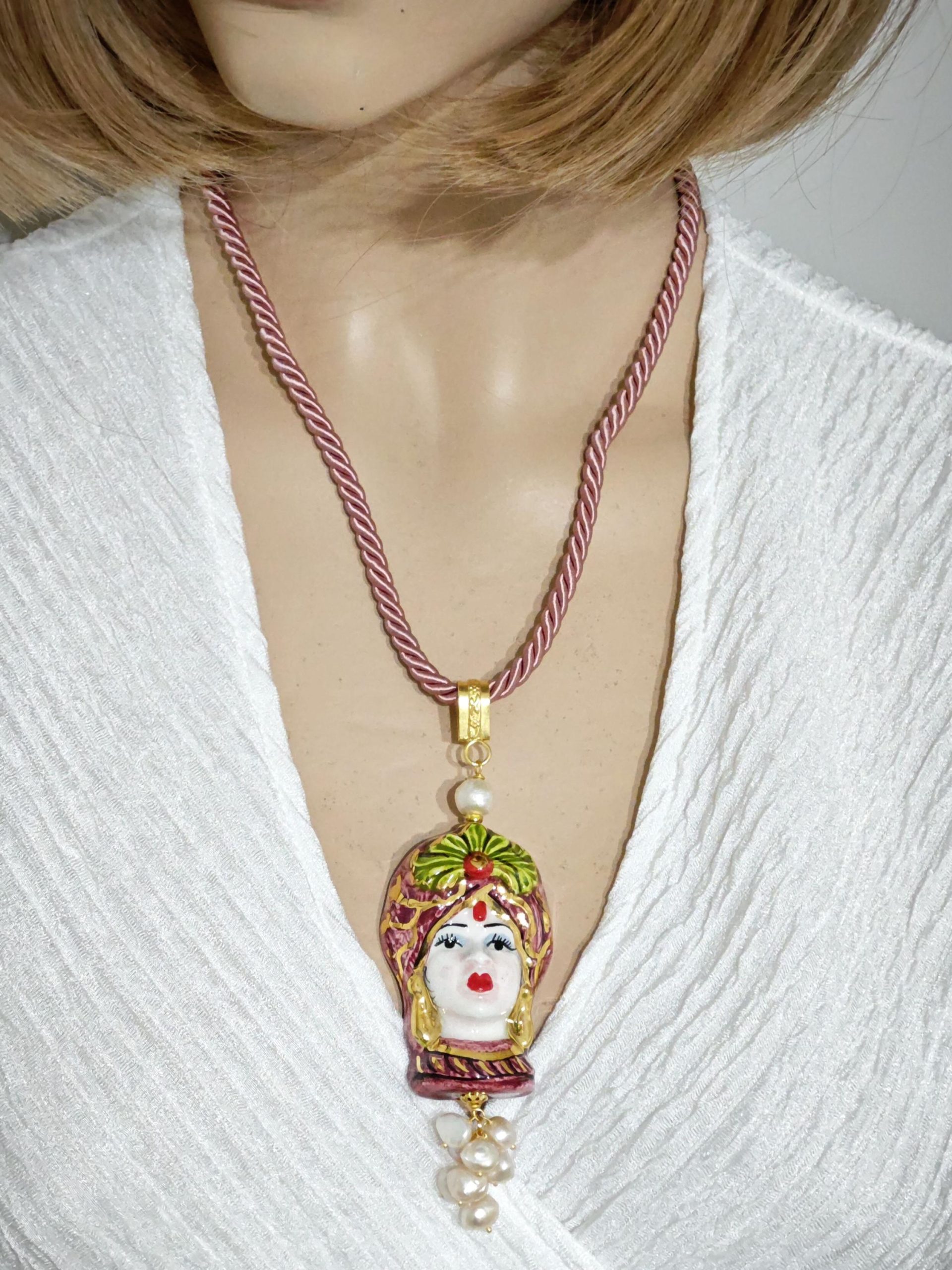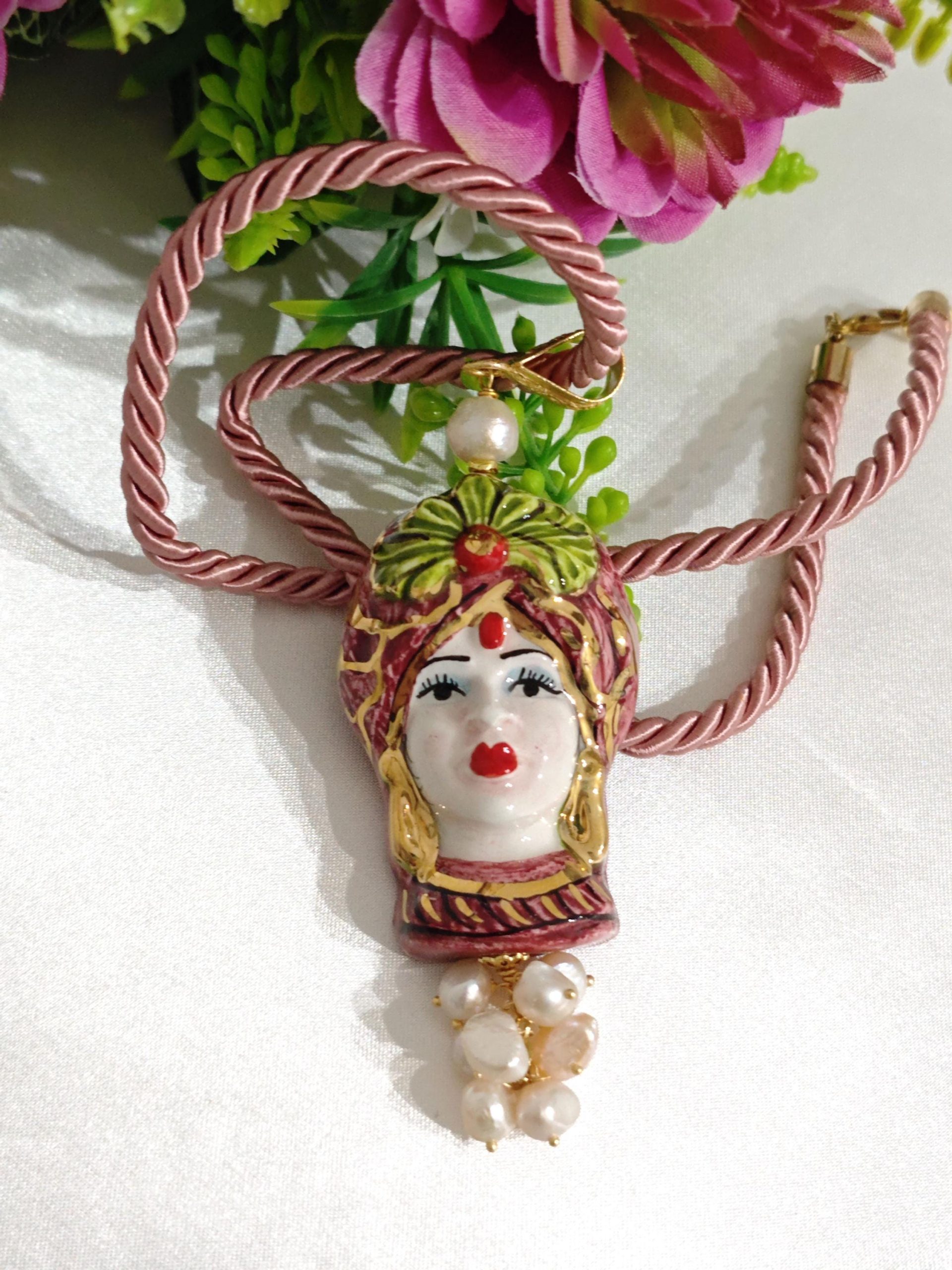 Collana a corda in seta rosa con pendente testa di moro donna in ceramica di Caltagirone realizzata e dipinta a mano, con applicazioni foglia oro 22 kt , 6 cm dimensioni con grappolo perle bianche naturali .