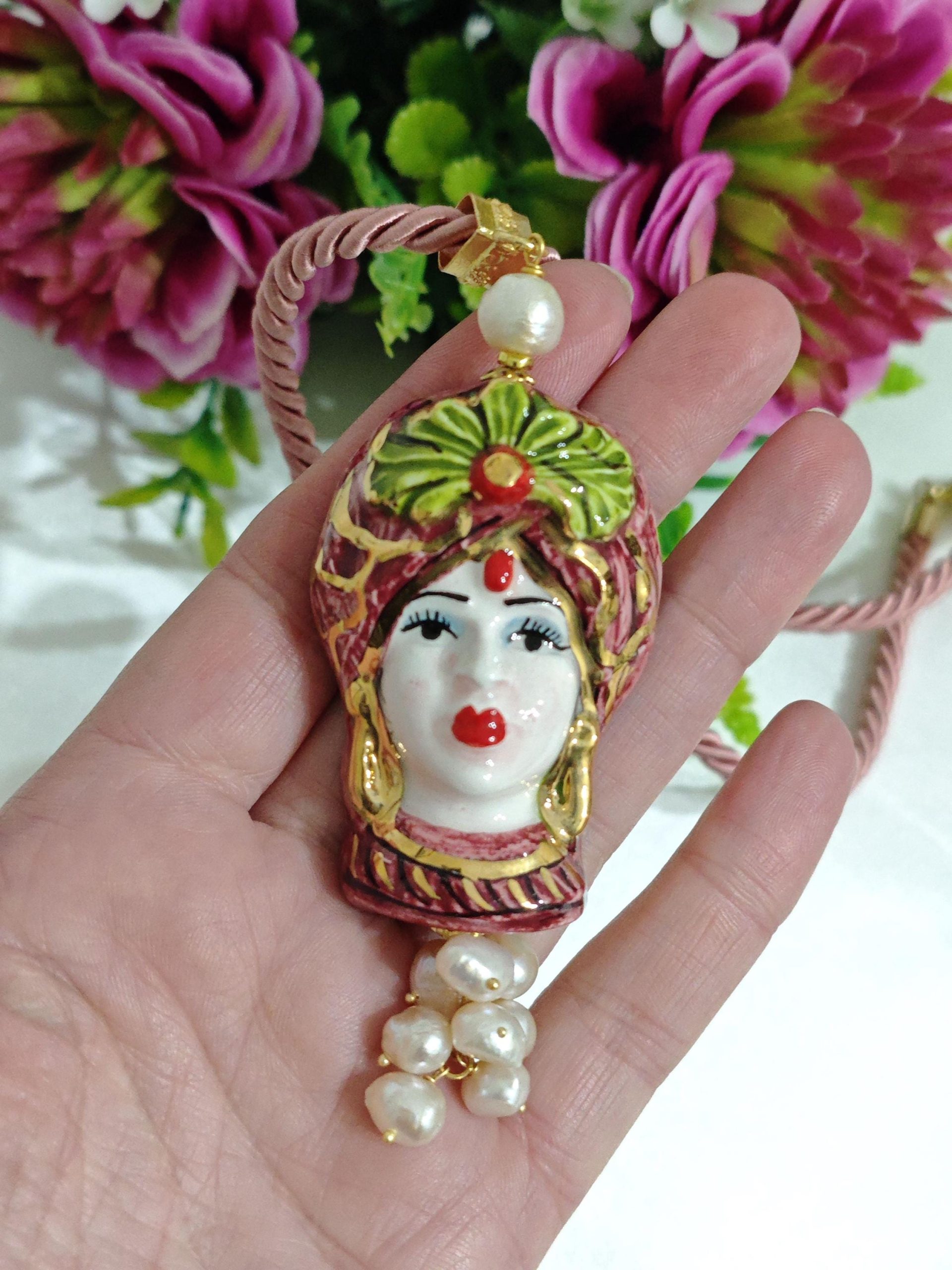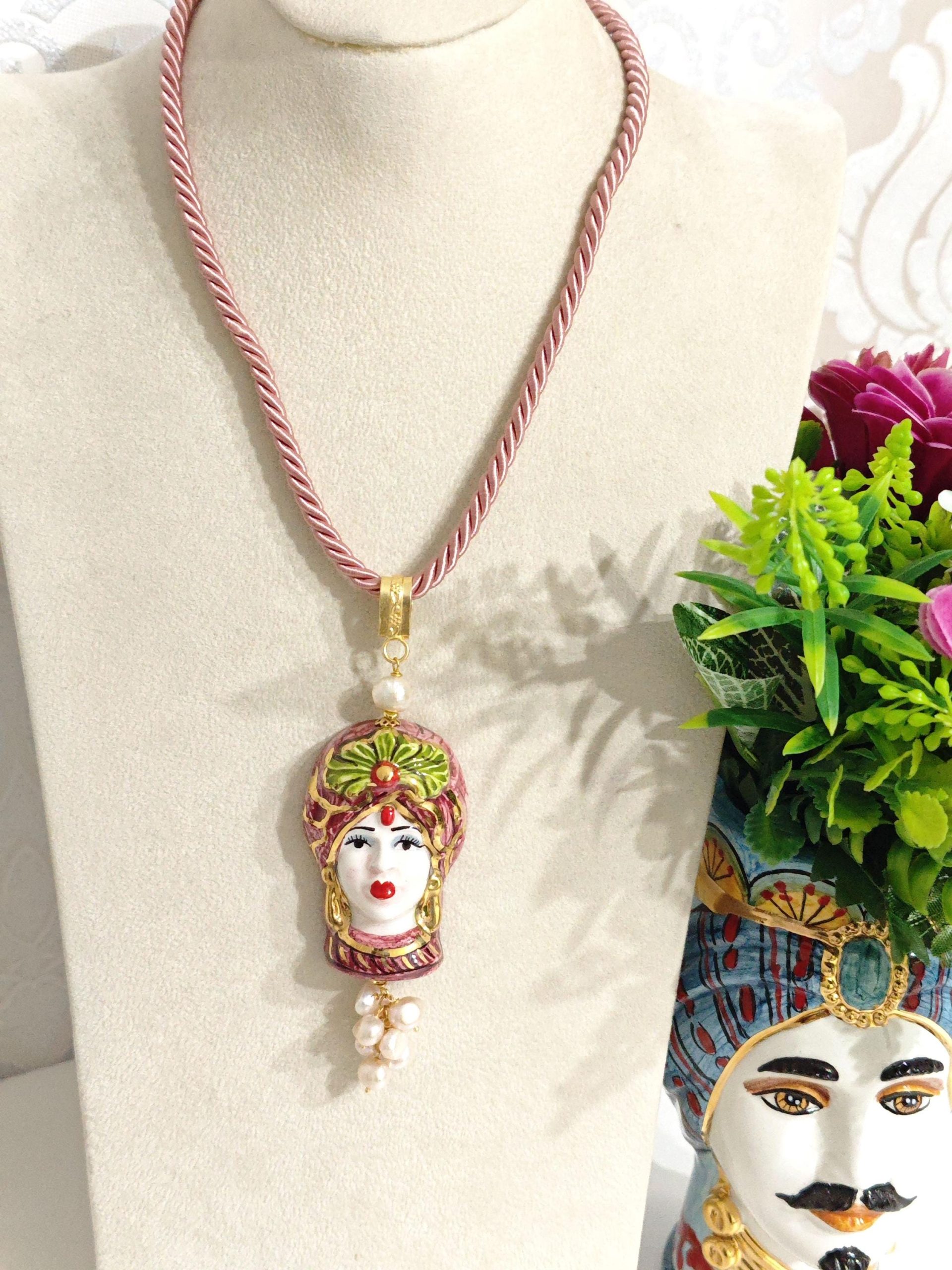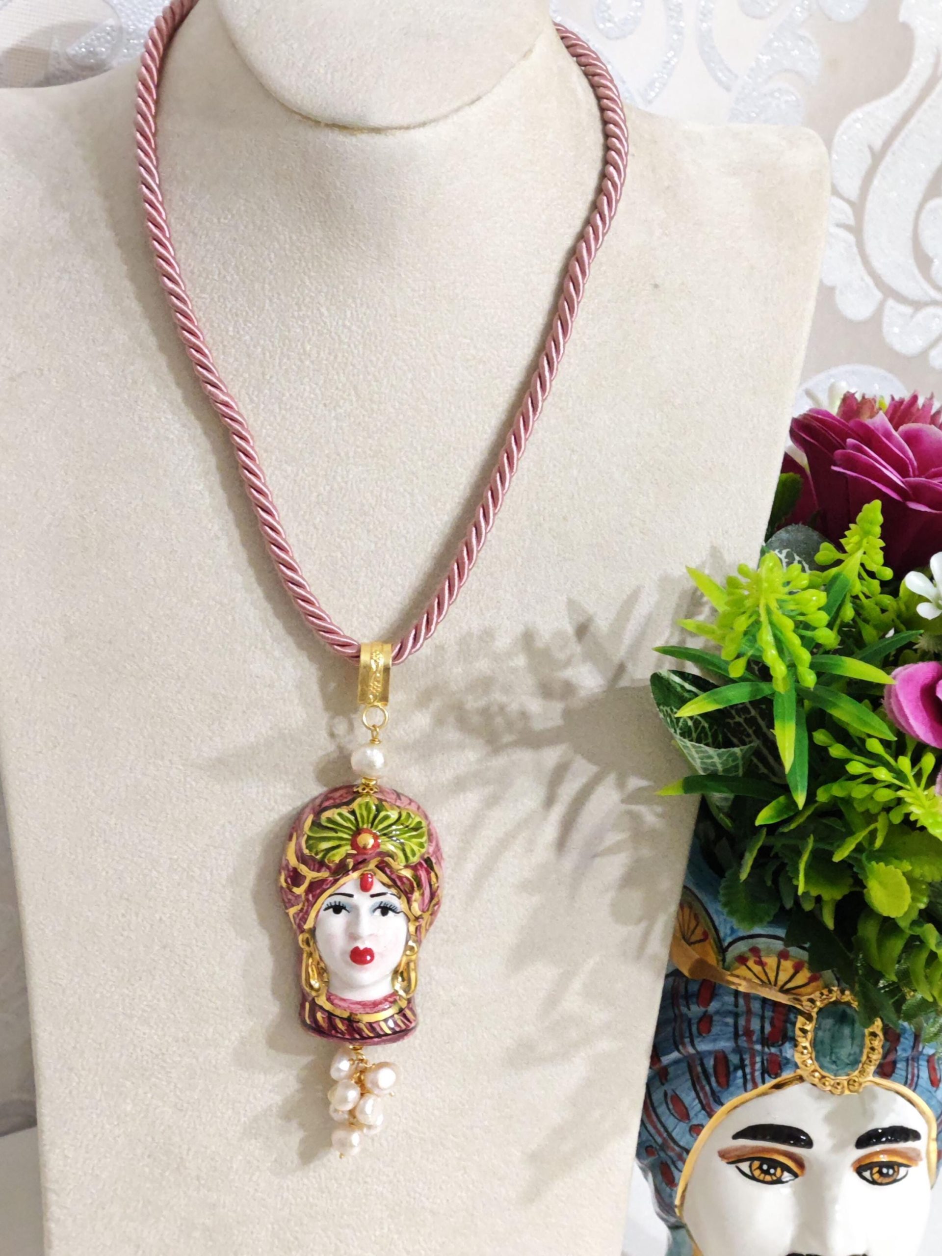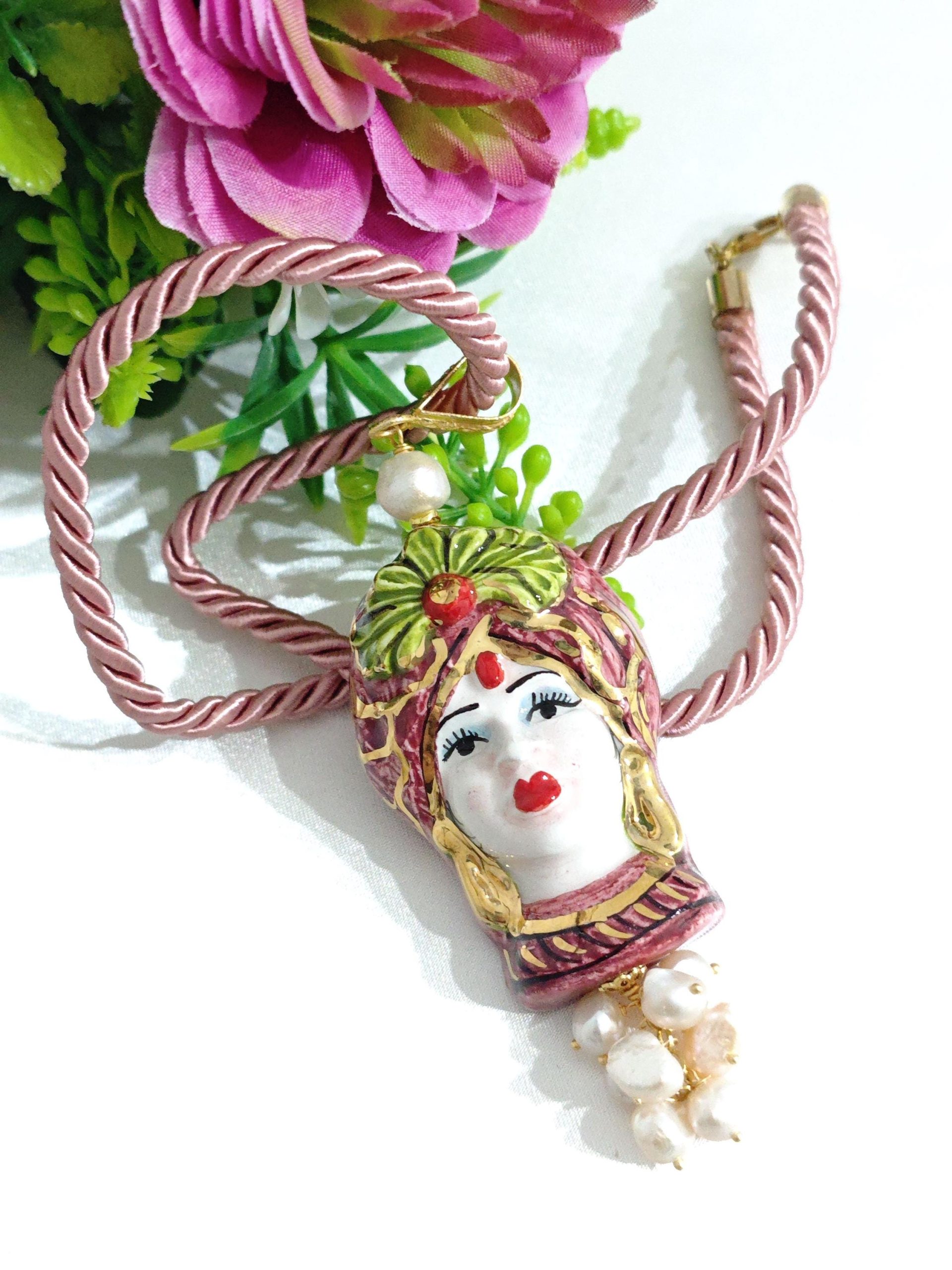 Collana a corda in seta rosa con pendente testa di moro donna in ceramica di Caltagirone realizzata e dipinta a mano, con applicazioni foglia oro 22 kt , 6 cm dimensioni con grappolo perle bianche naturali .