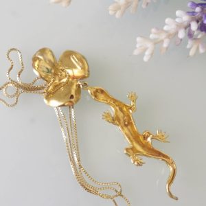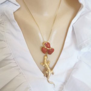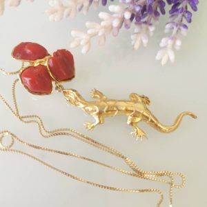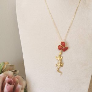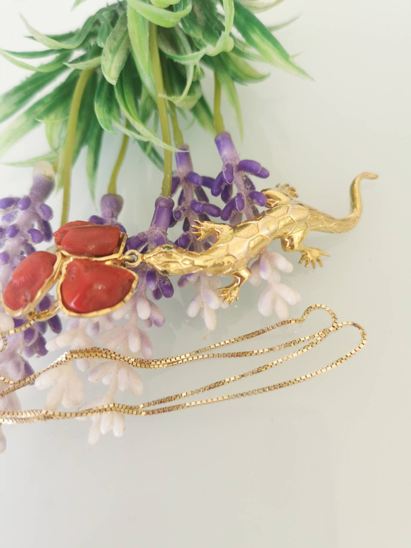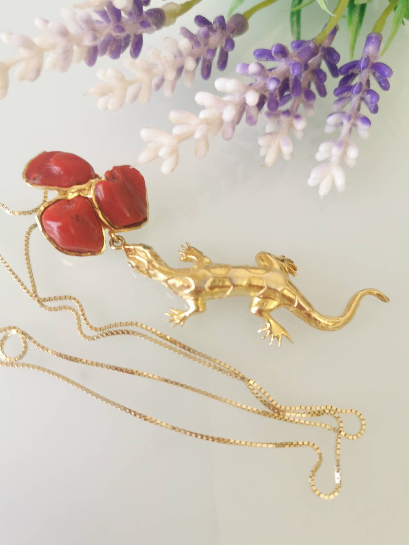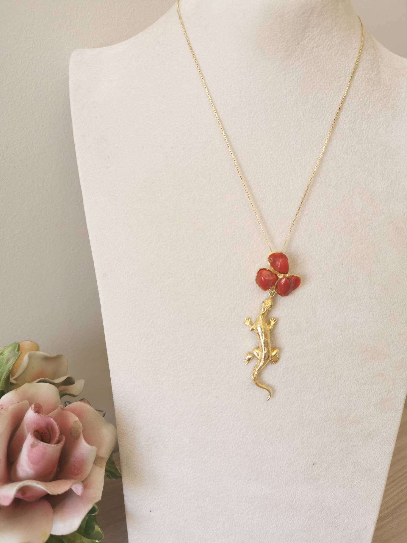 Collana argento 925 placcato oro con corallo rosso mediterraneo , pendente lucertola , gioielli italiani