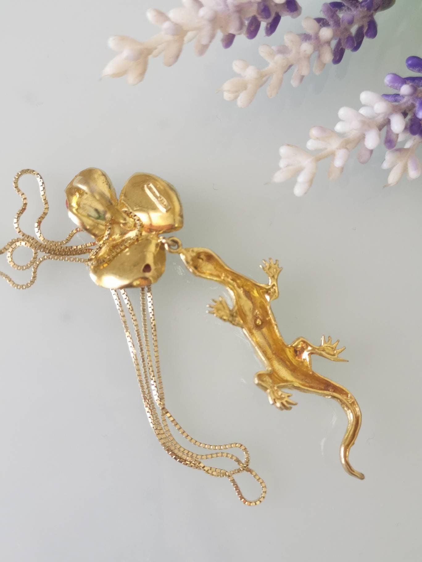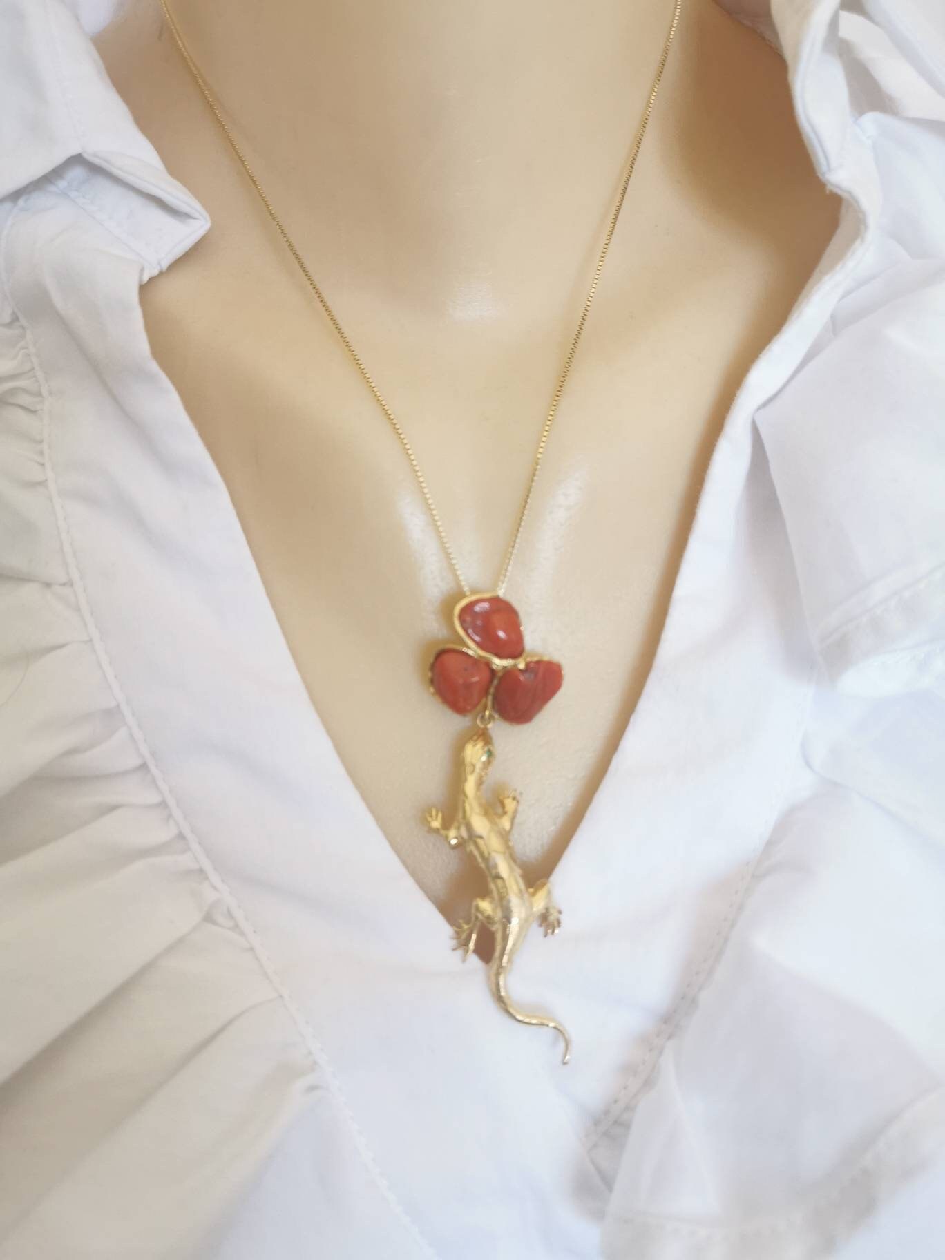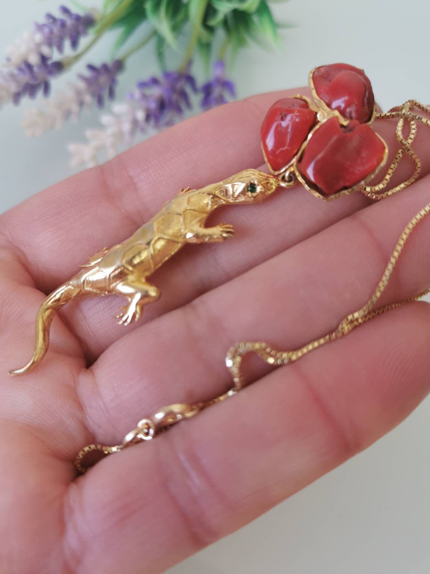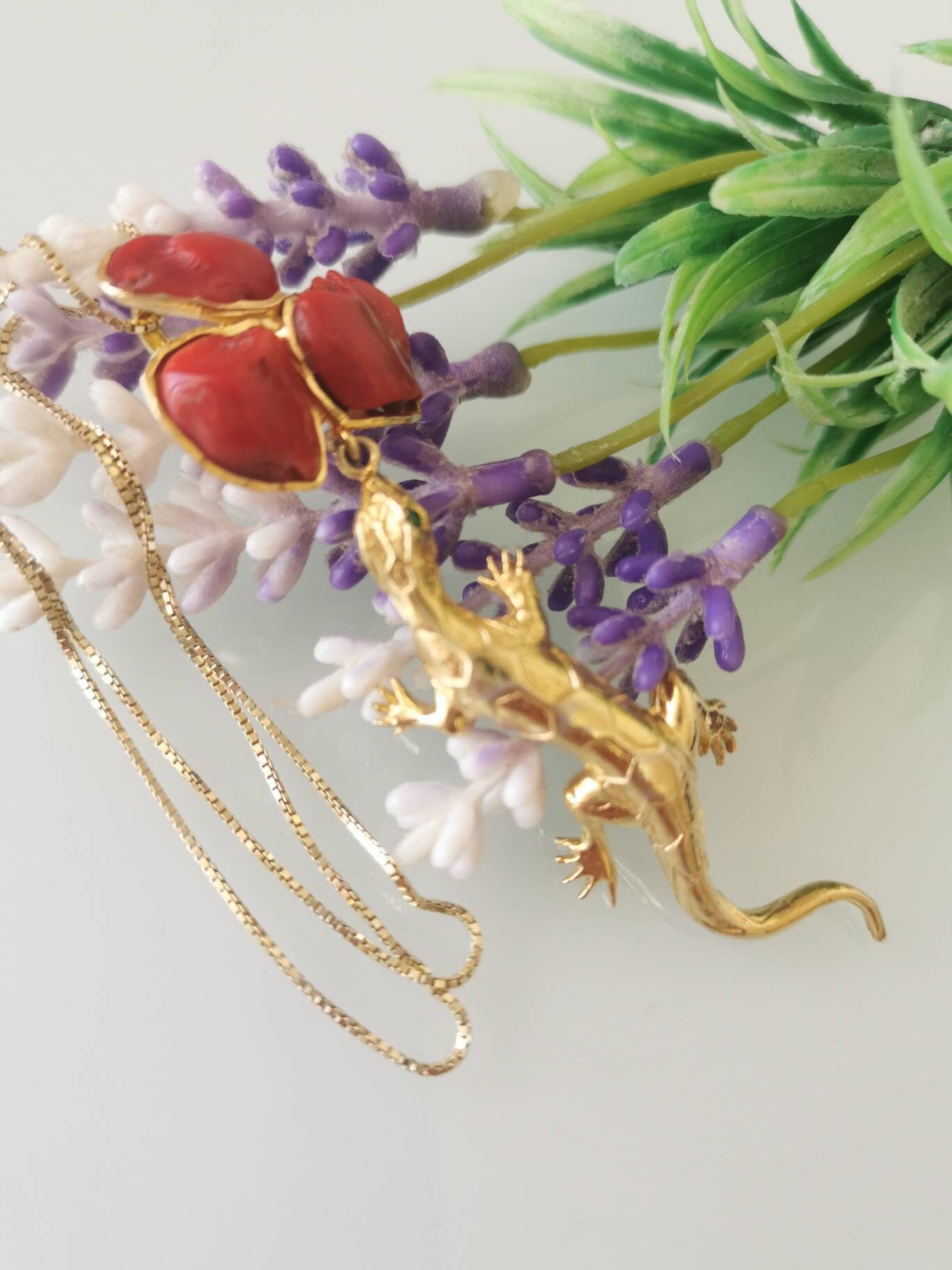 Collana con Pendente artigianale a forma di lucertola in argento 925 placcato oro decorata con corallo rosso mediterraneo naturale realizzata a mano a Torre del greco, 7 cm dimensioni.