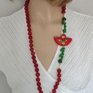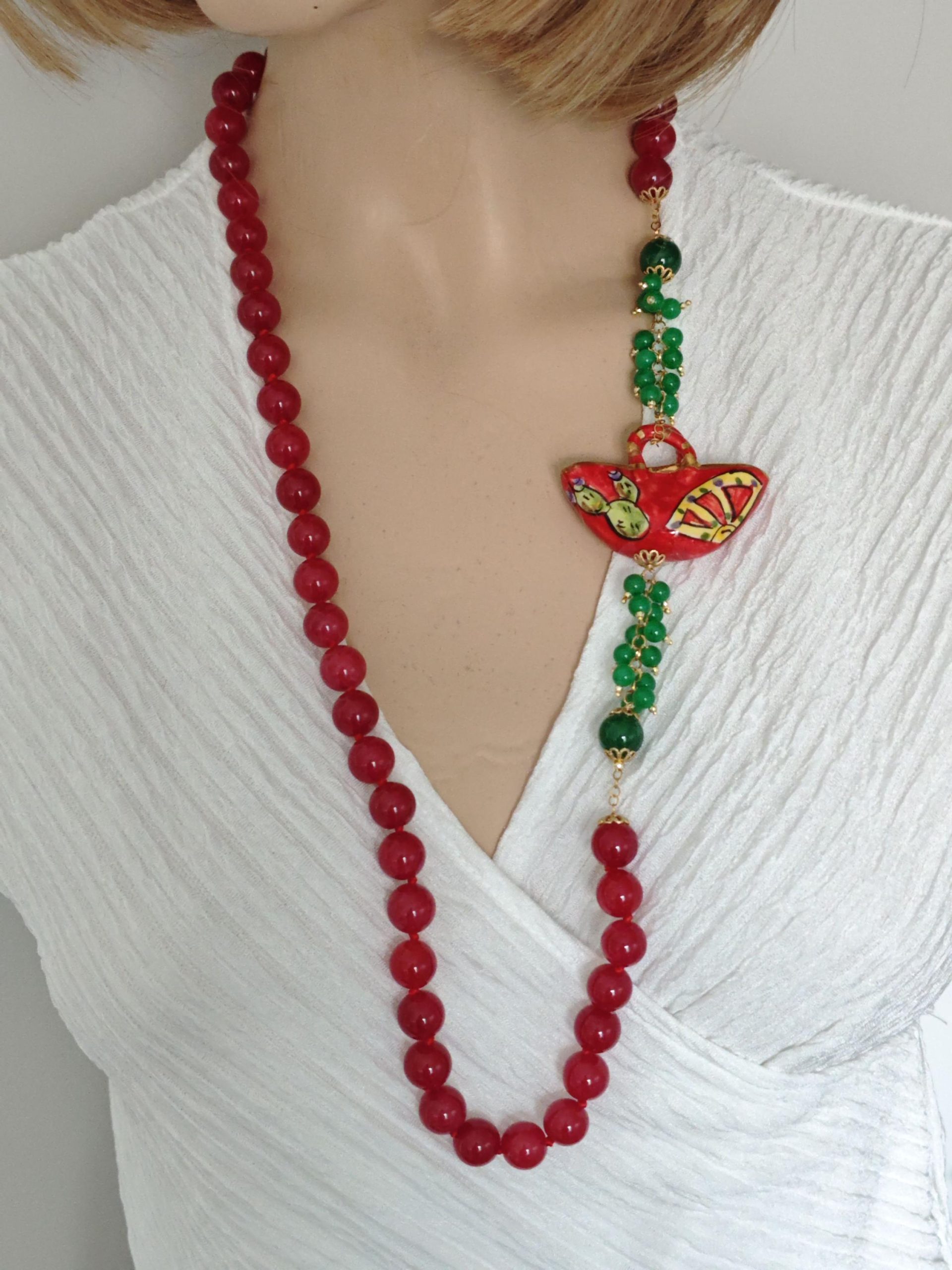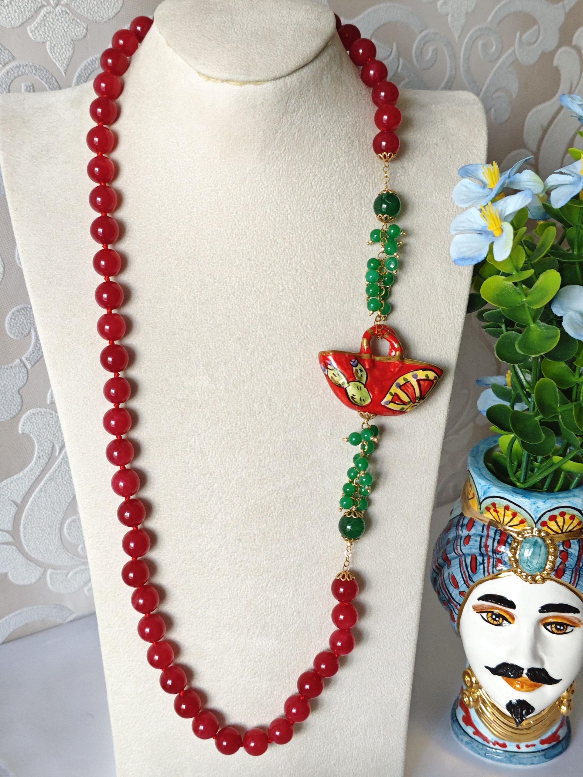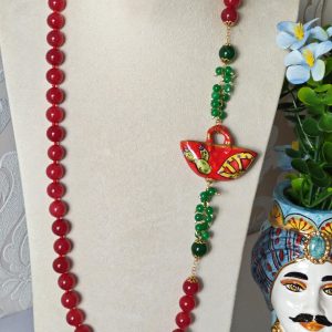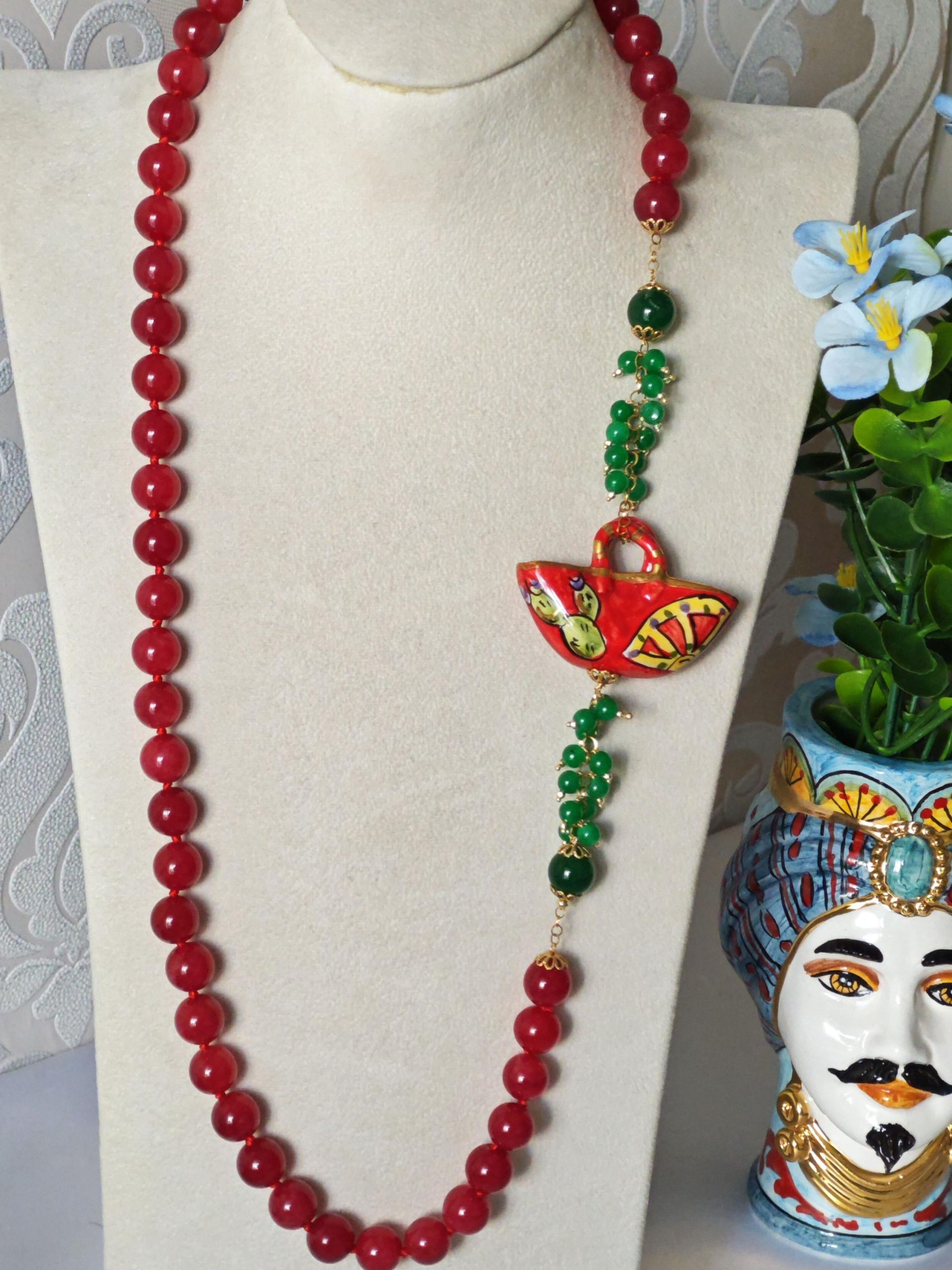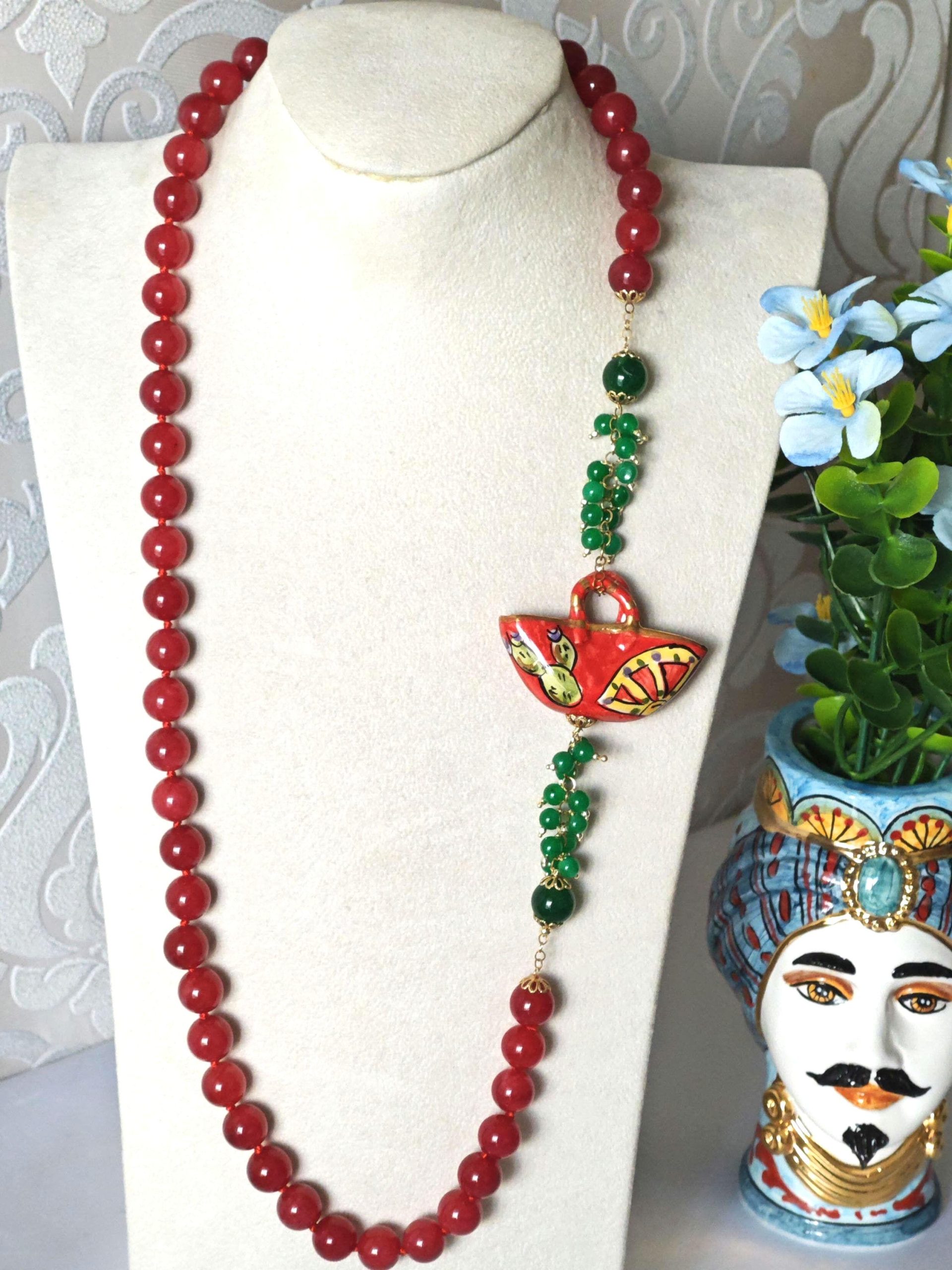 Collana borsetta ceramica di Caltagirone e pietre dure giada rossa, collana siciliana
