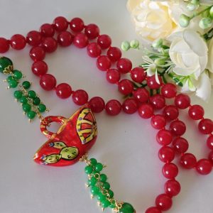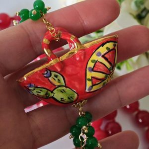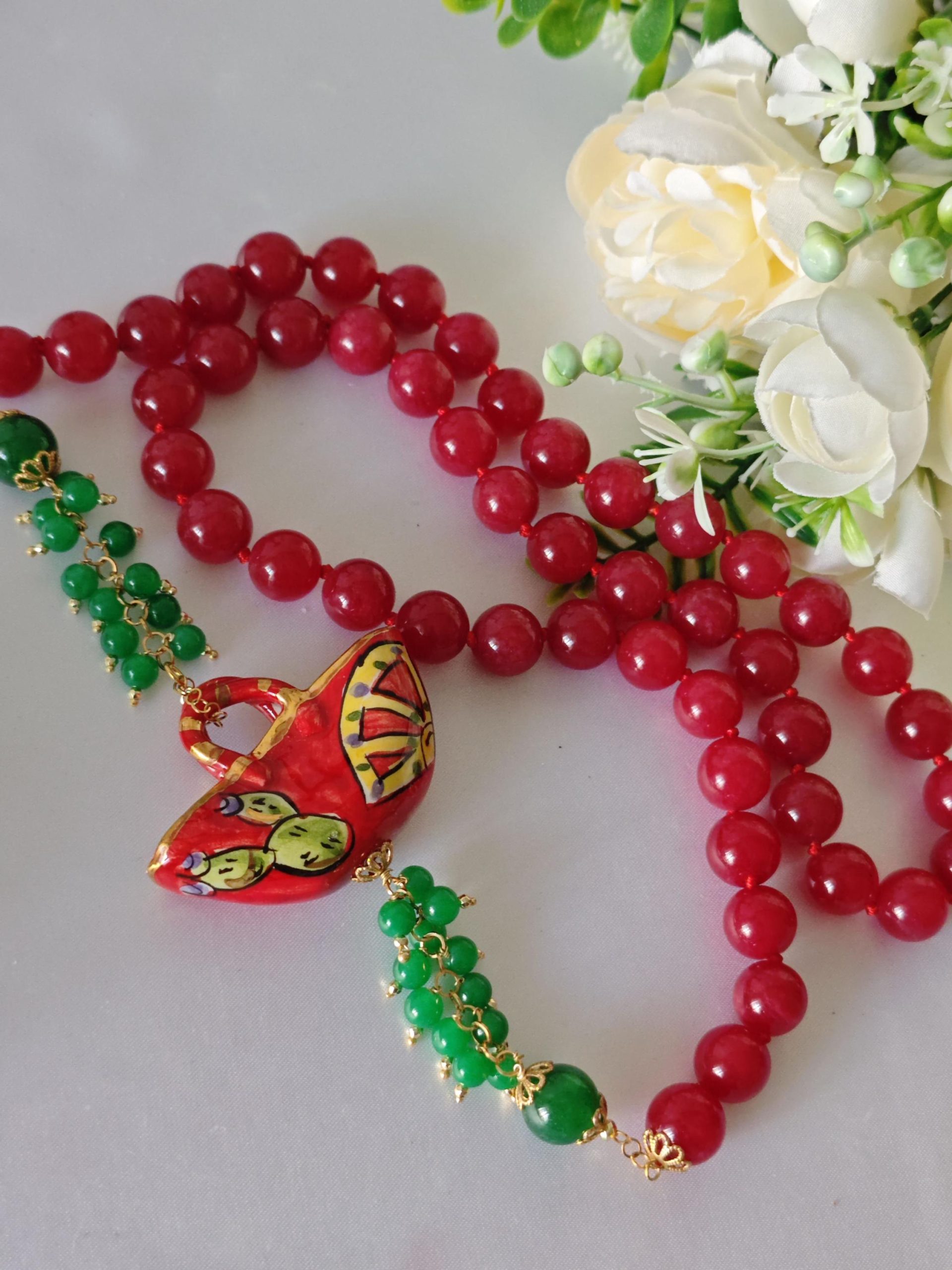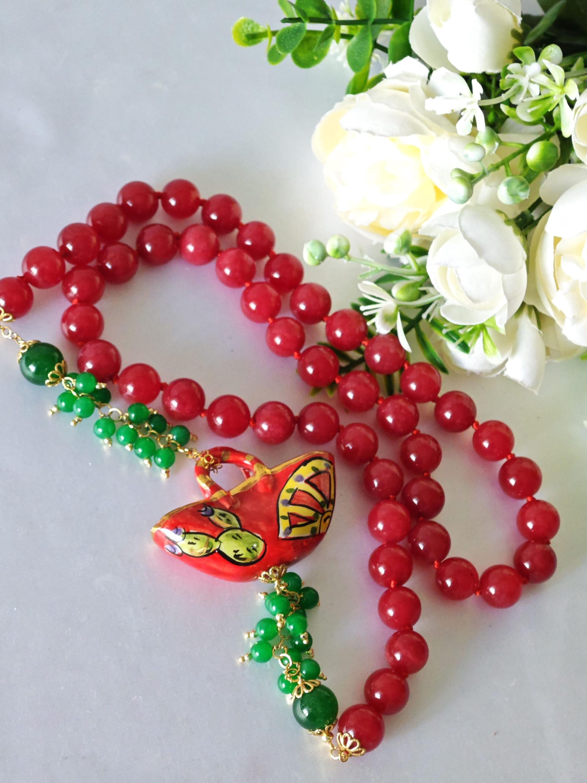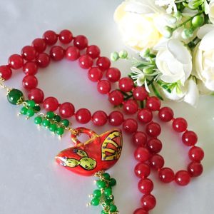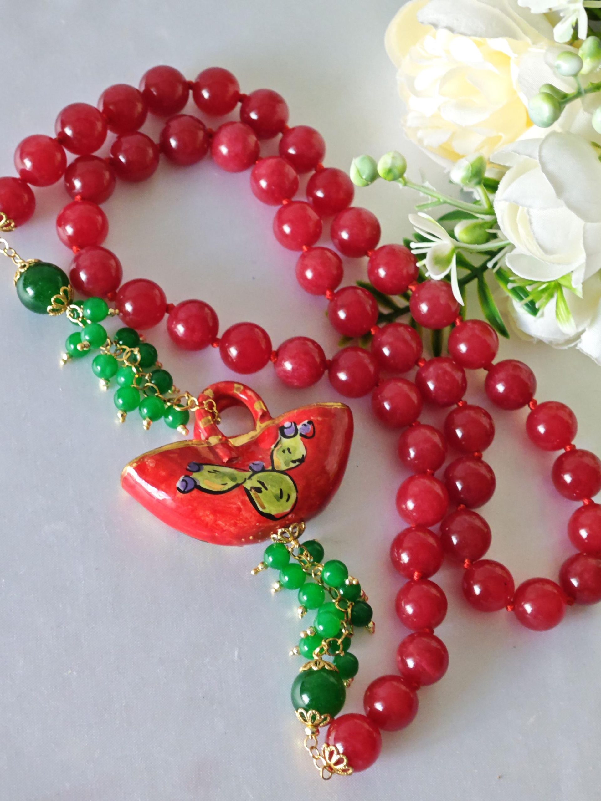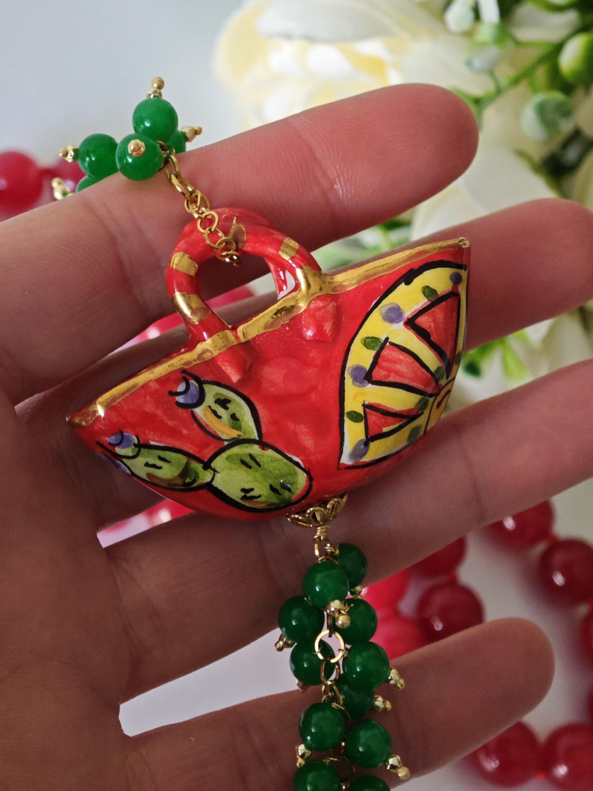 Collana artigianale annodata a mano con pietre dure giada rossa 12 mm , grappoli pietre agata verde e borsetta in ceramica di Caltagirone realizzata e dipinta a mano 5×3,5 cm dimensioni.