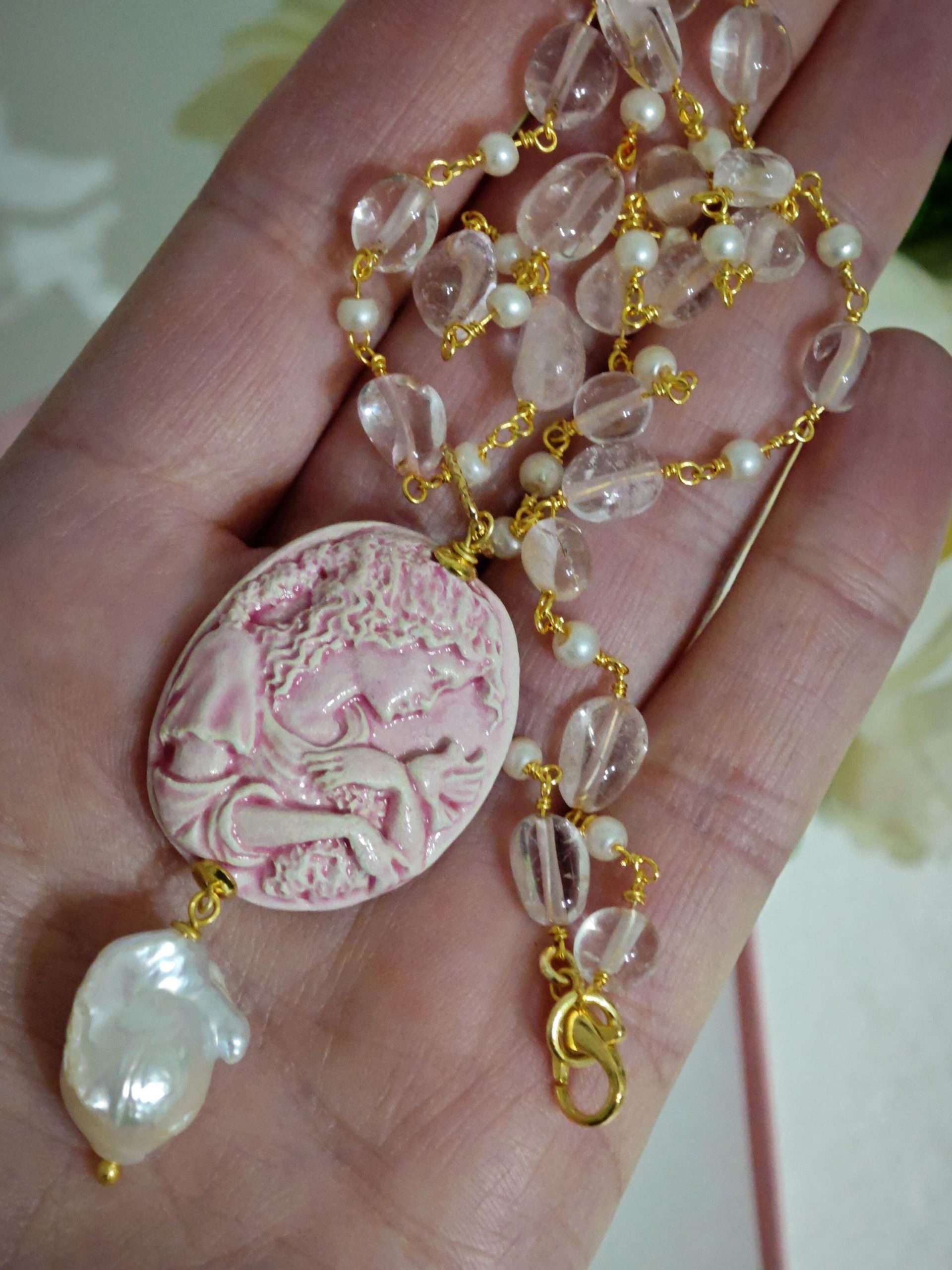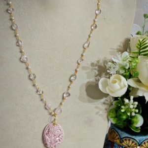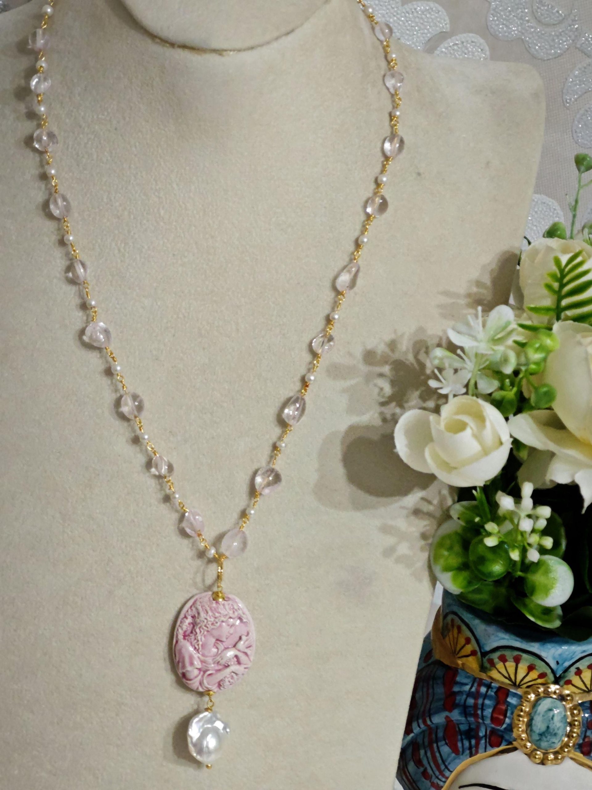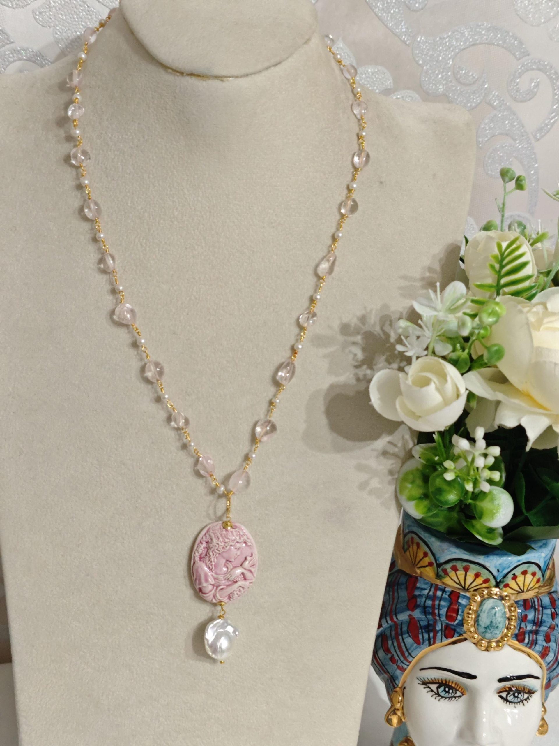 Collana catena a rosario con pietre quarzo rosa e perle bianche imitazione , pendente cammeo in ceramica di Caltagirone realizzata e dipinta a mano, 3×2,5 cm dimensioni impreziosito da una perla bianca barocca.
