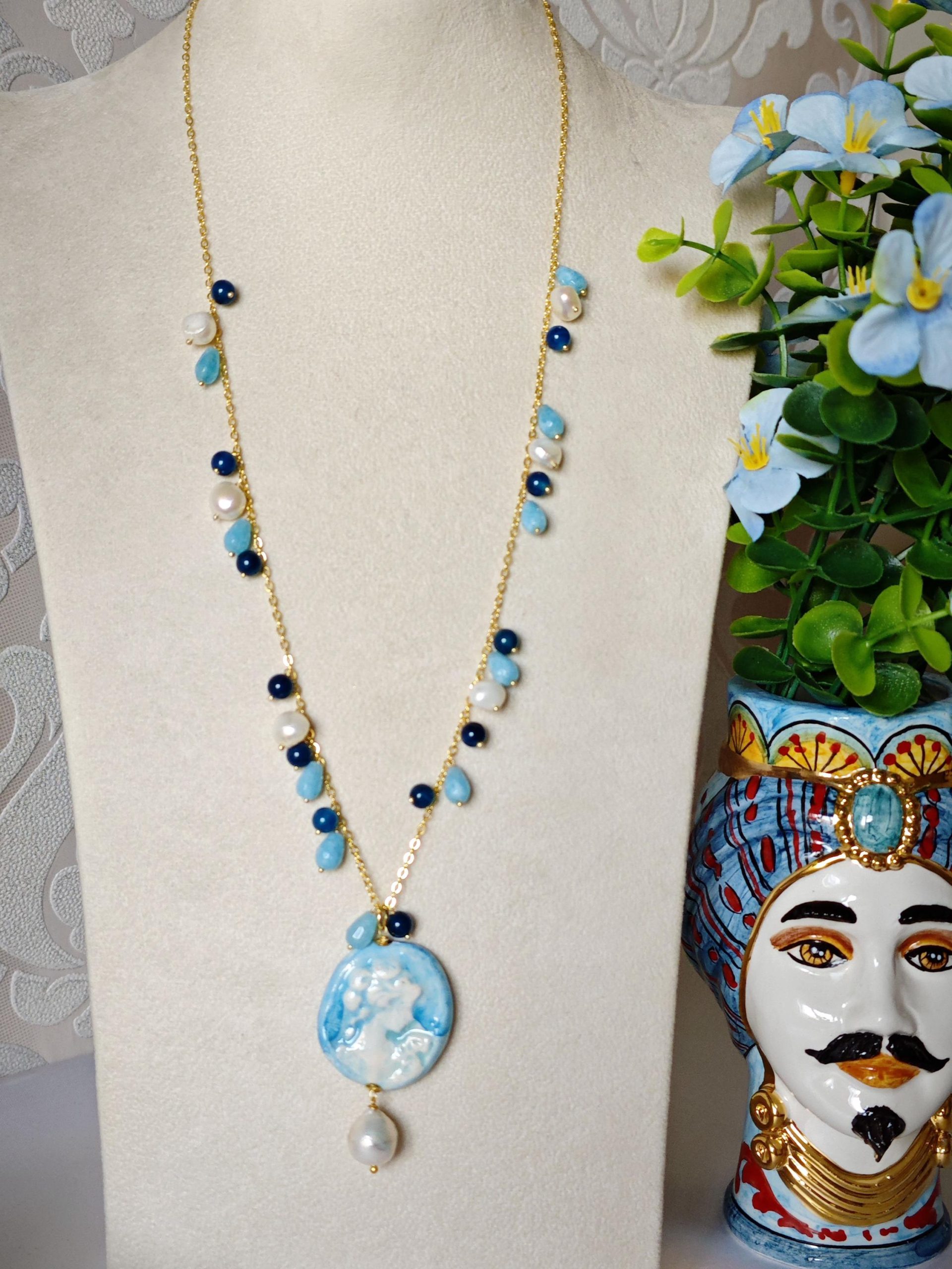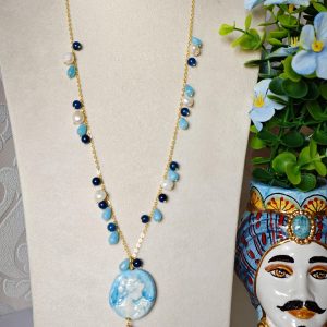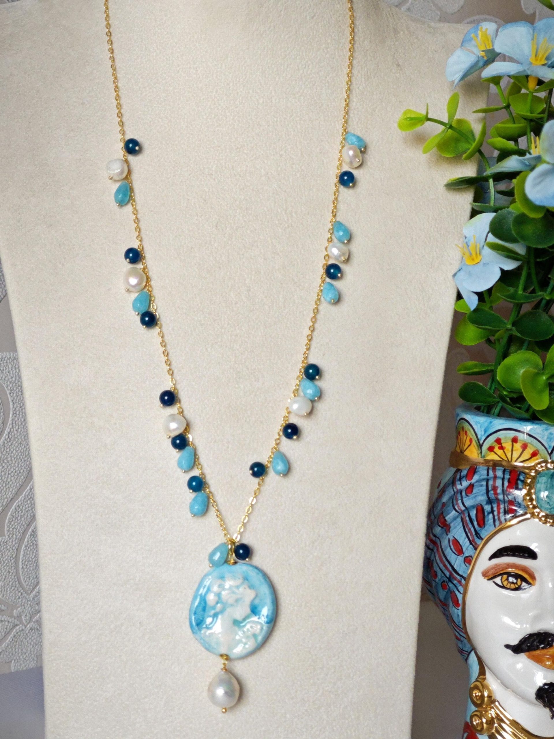 Collana cammeo ceramica di Caltagirone con pietre dure giada celeste,  gioielli italiani