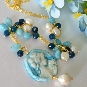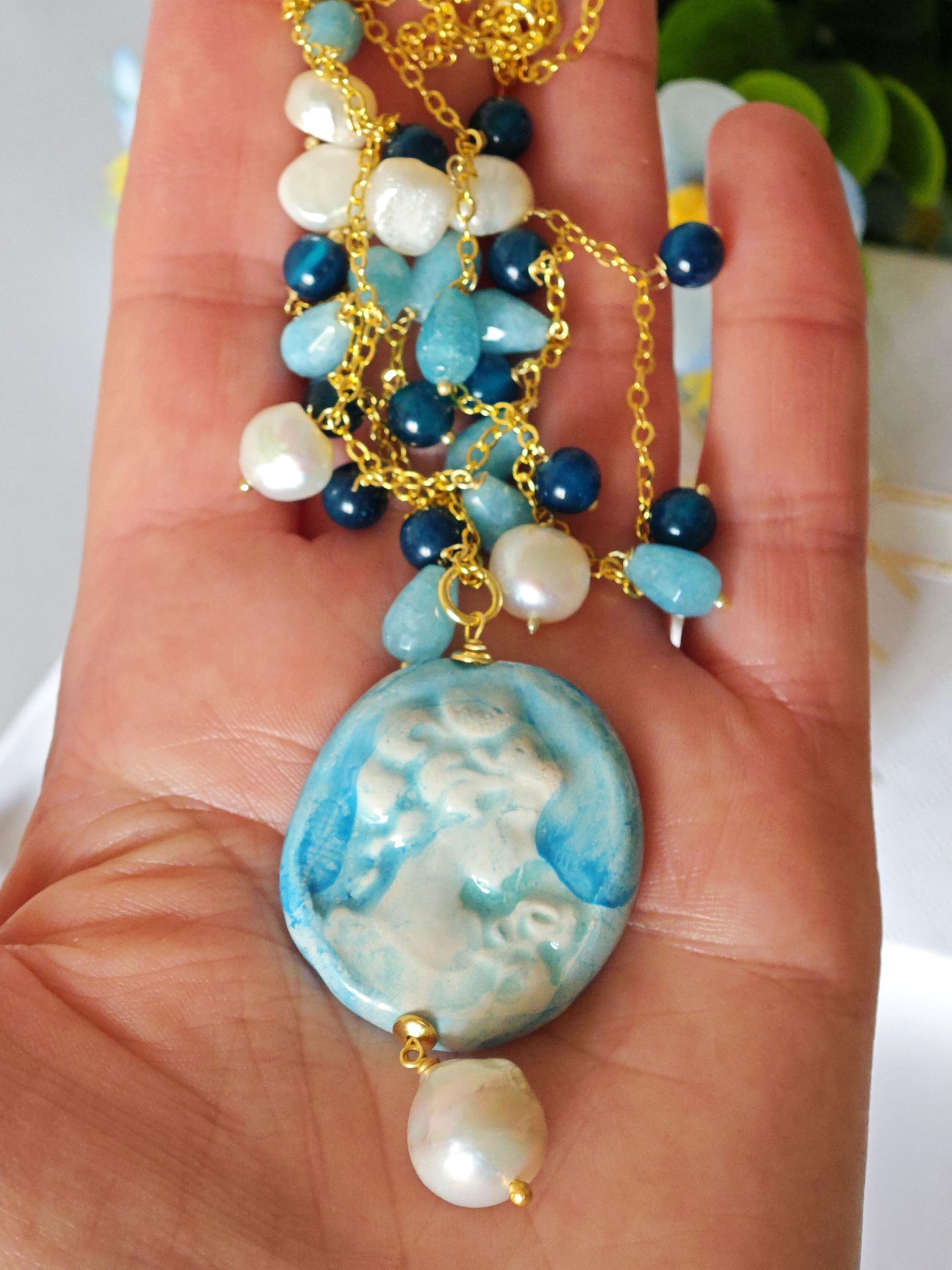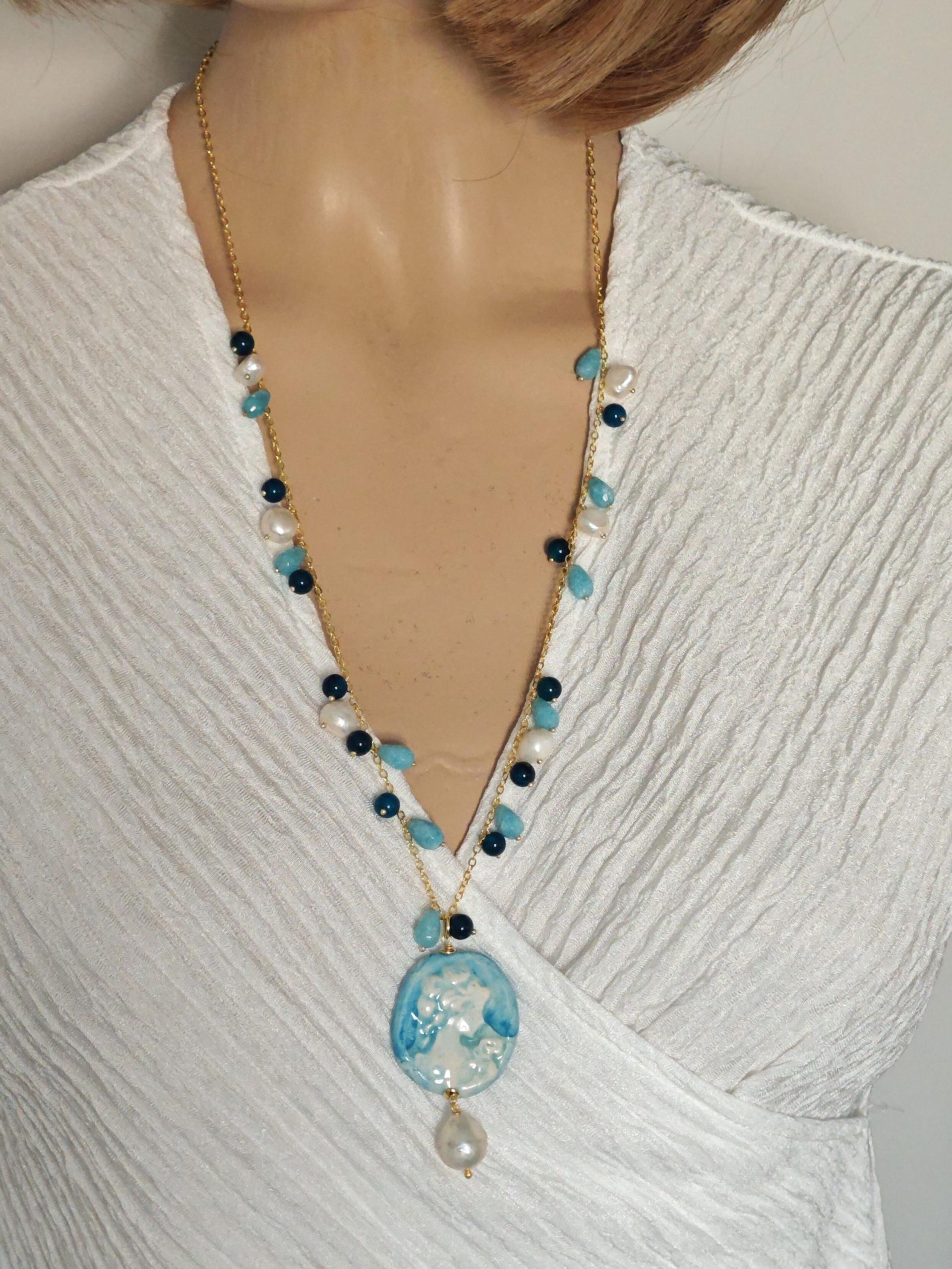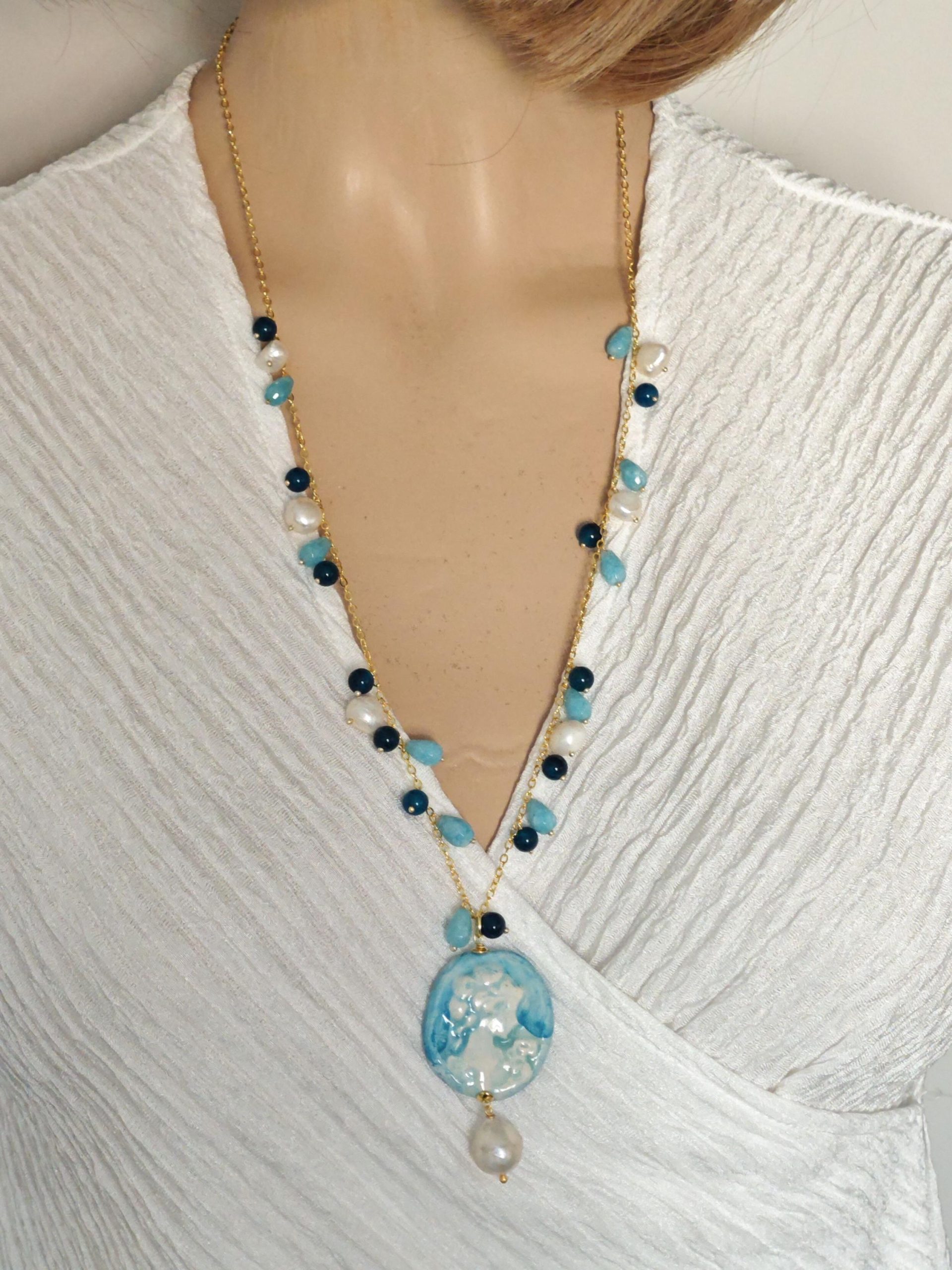 Collana artigianale realizzata con catena in acciaio dorato con pietre a goccia angelite blu celeste , pietre agata blu e perle bianche naturali, e con pendente cammeo in ceramica di Caltagirone realizzata e dipinta a mano, 3,5×3 cm dimensioni , perla barocca bianca.