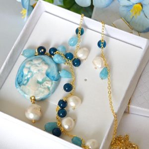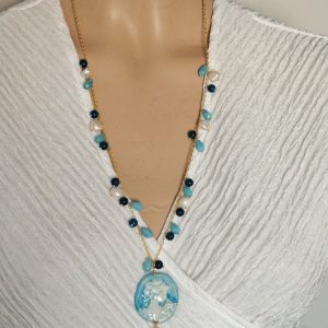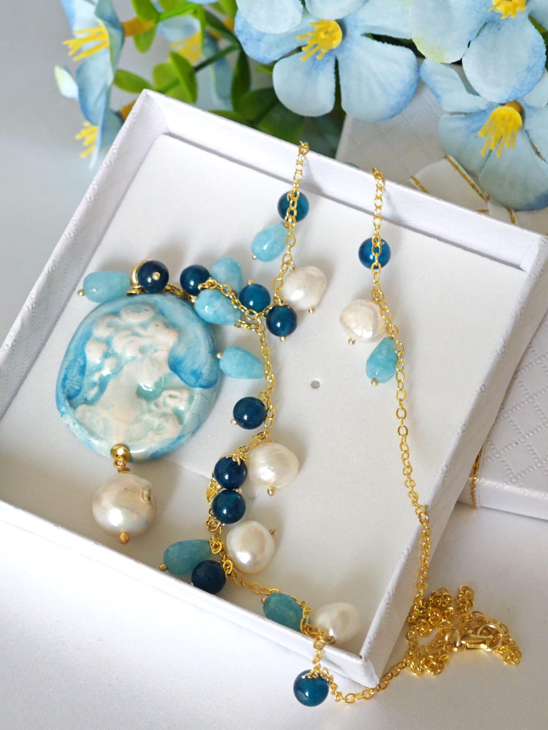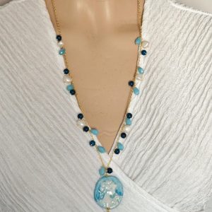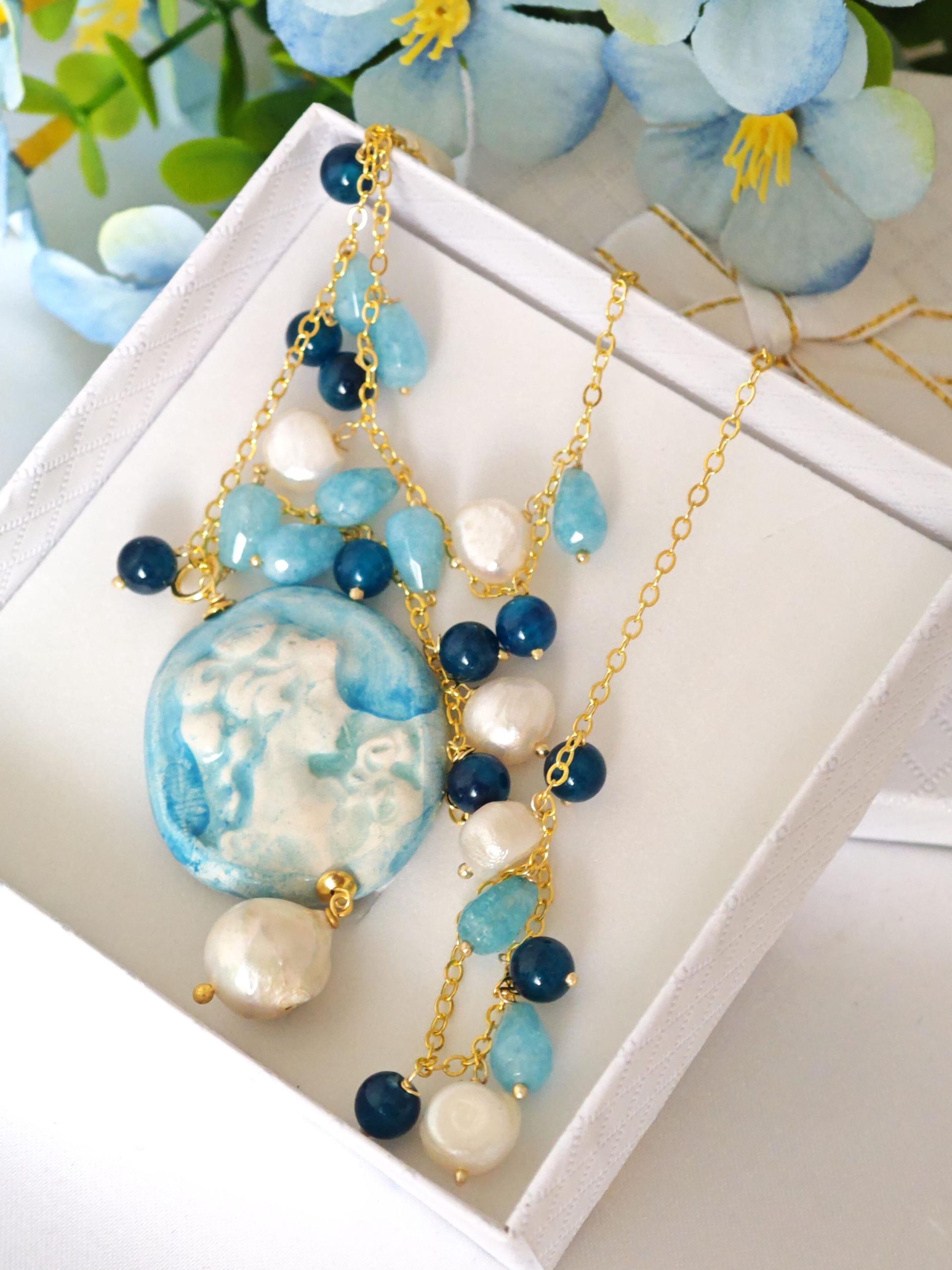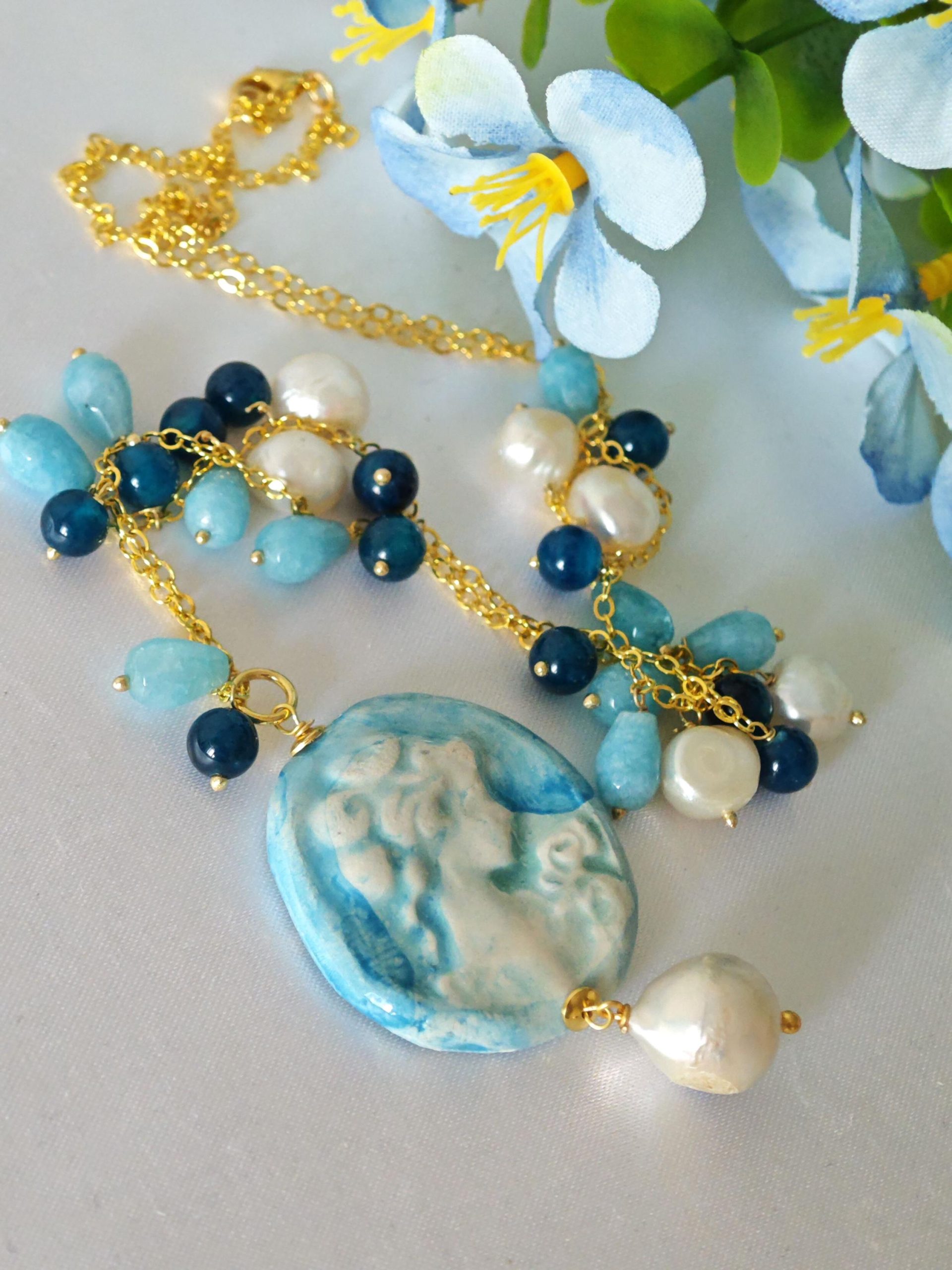 Collana artigianale realizzata con catena in acciaio dorato con pietre a goccia angelite blu celeste , pietre agata blu e perle bianche naturali, e con pendente cammeo in ceramica di Caltagirone realizzata e dipinta a mano, 3,5×3 cm dimensioni , perla barocca bianca.