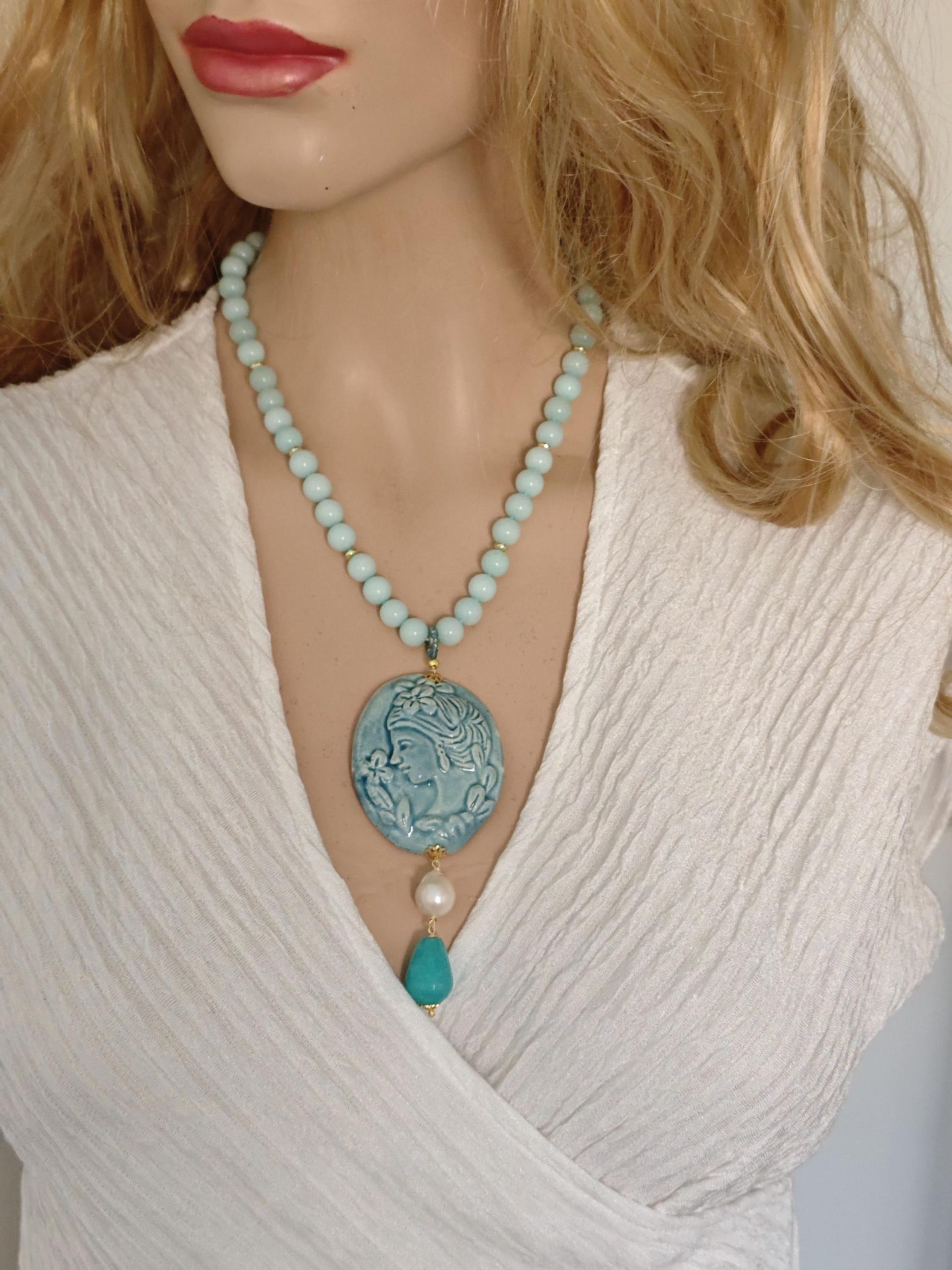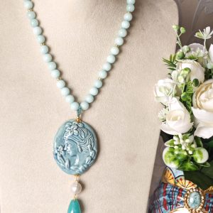 Collana girocollo con pietre dure giada blu celeste 8 mm annodata a mano e cammeo in ceramica di Caltagirone realizzata e dipinta a mano, 5,5×4,5 cm dimensioni raffigurante volto di donna con pendenti perla bianca barocca e goccia giada blu.